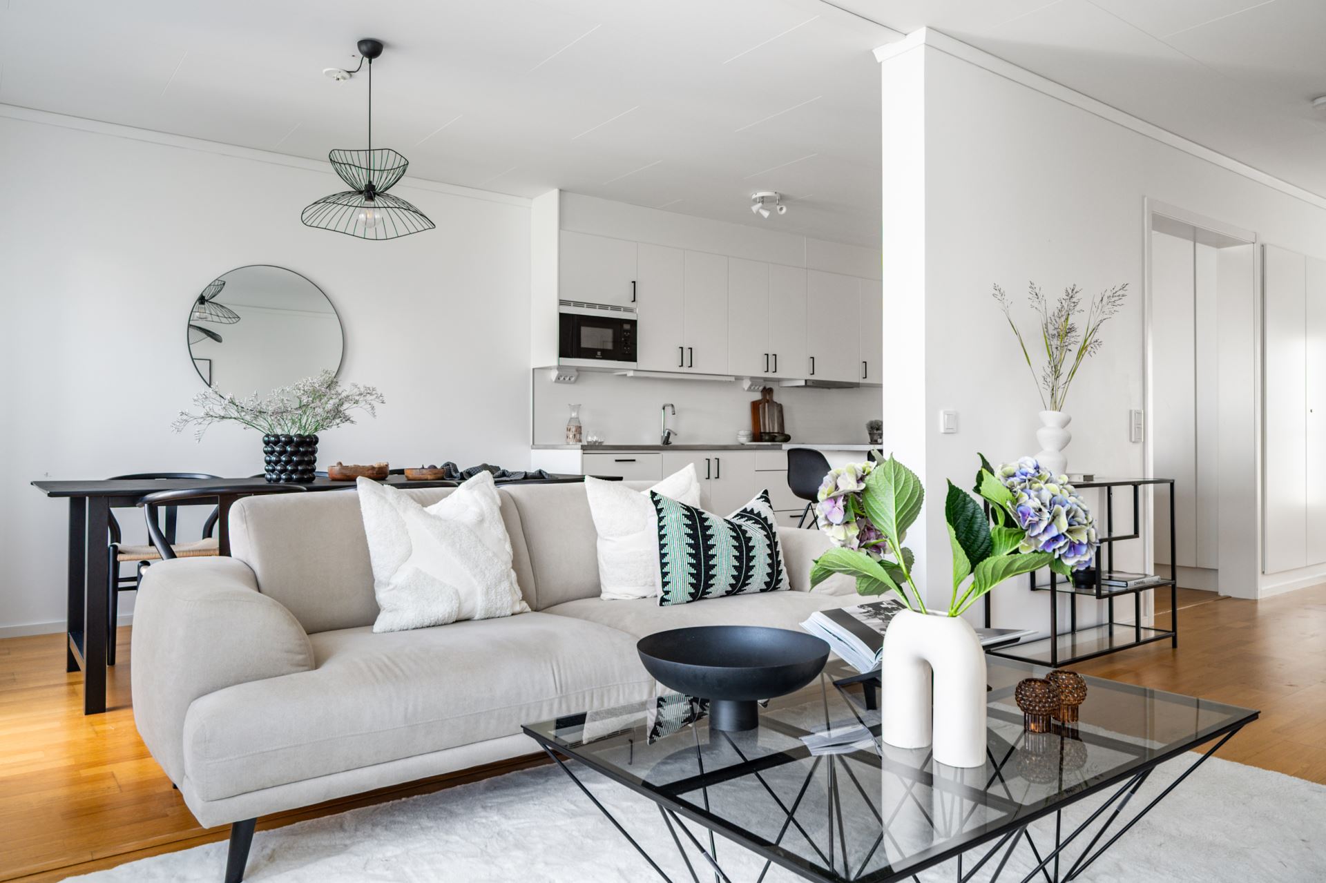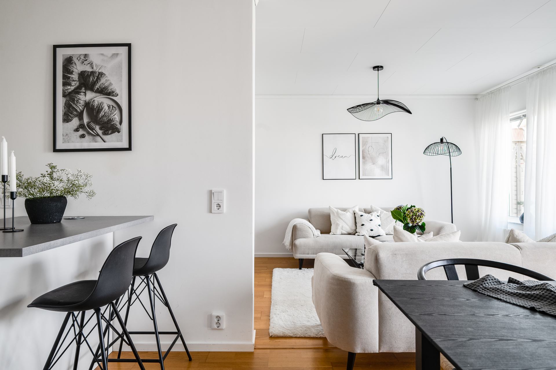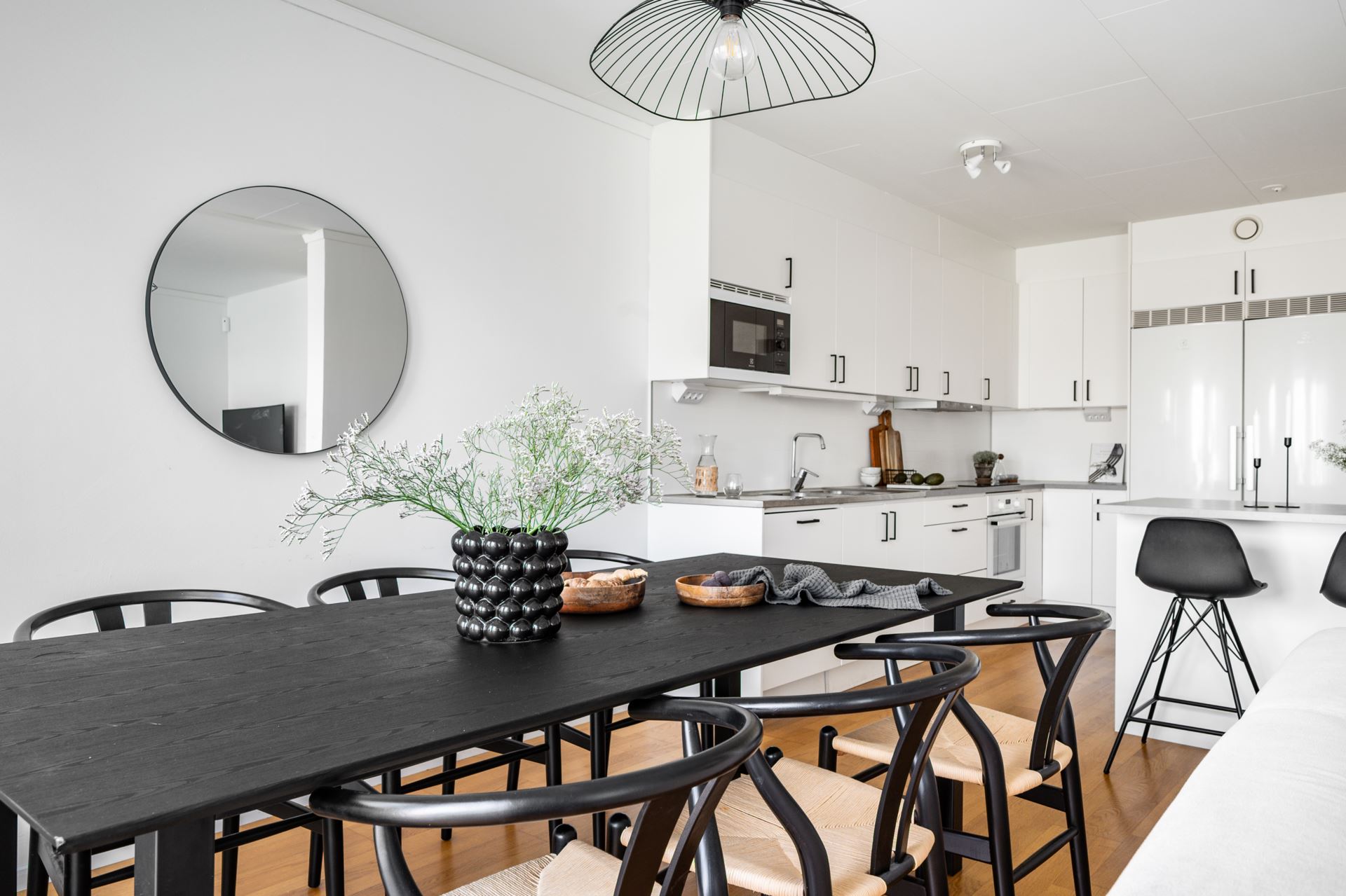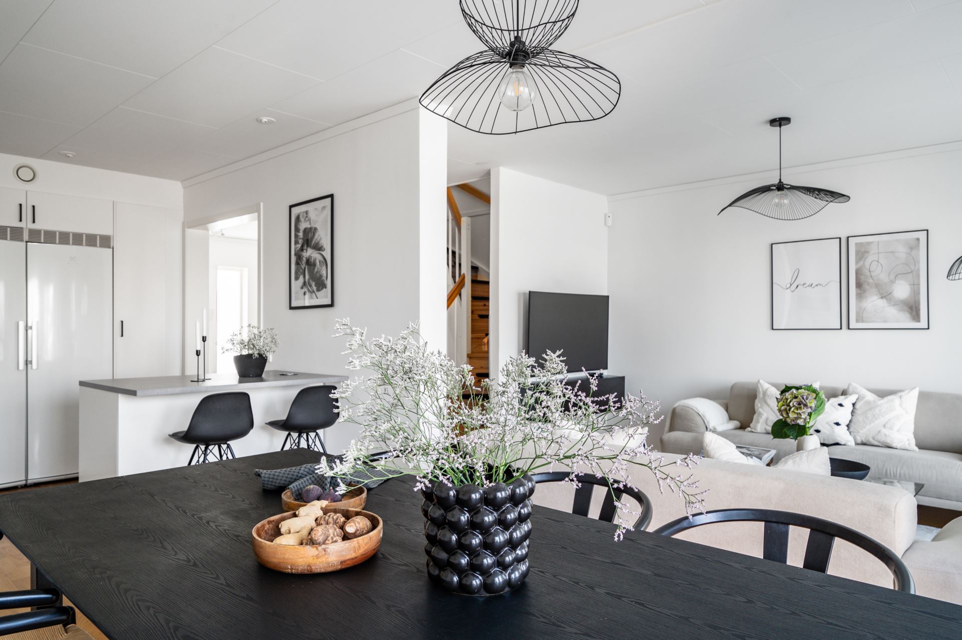 Ekparkett och målade väggar. Semiöppen planlösning mellan kök och rum. Plats för matgrupp 6-8 personer, sittmöbler samt mediamöbler.