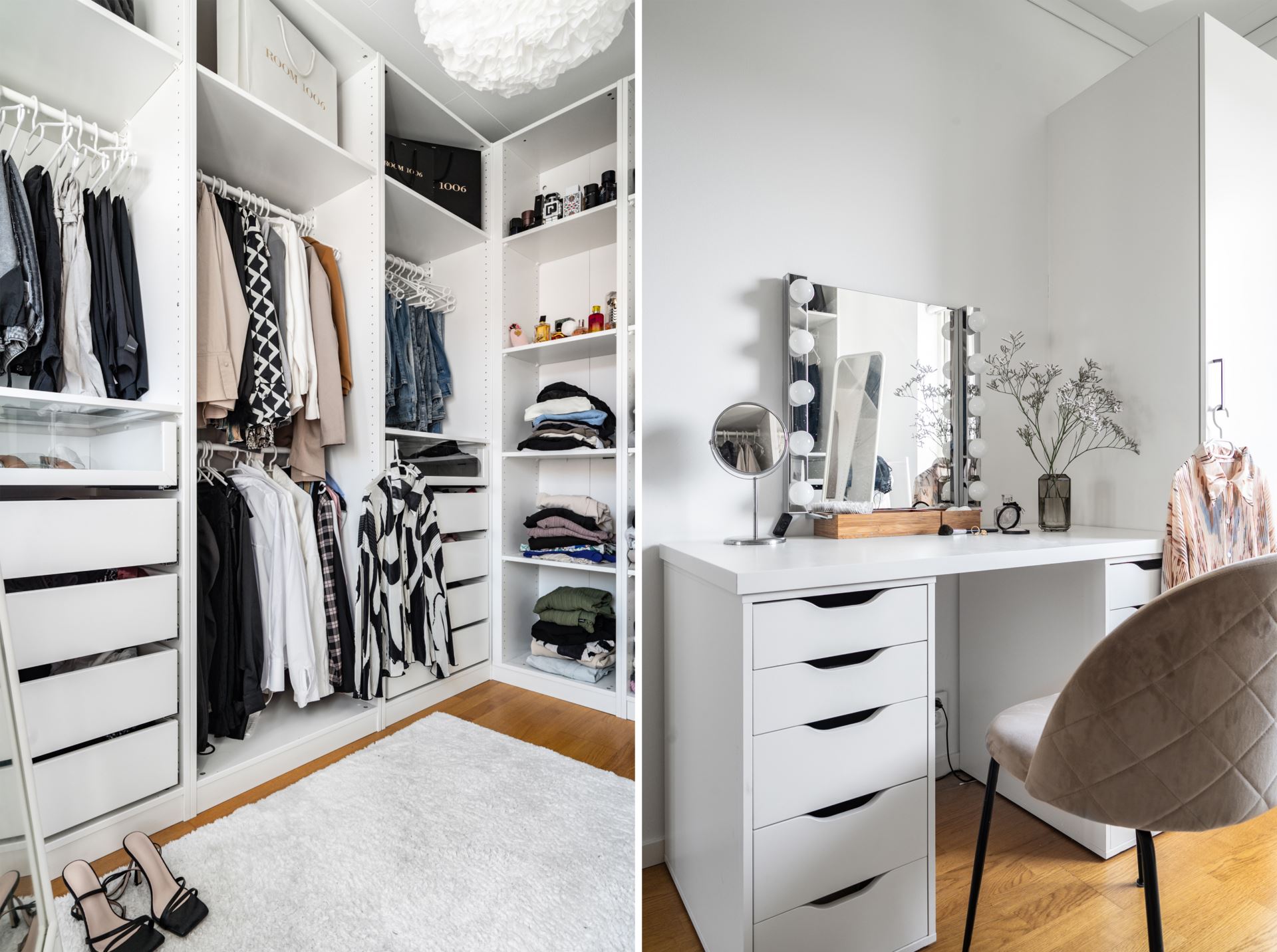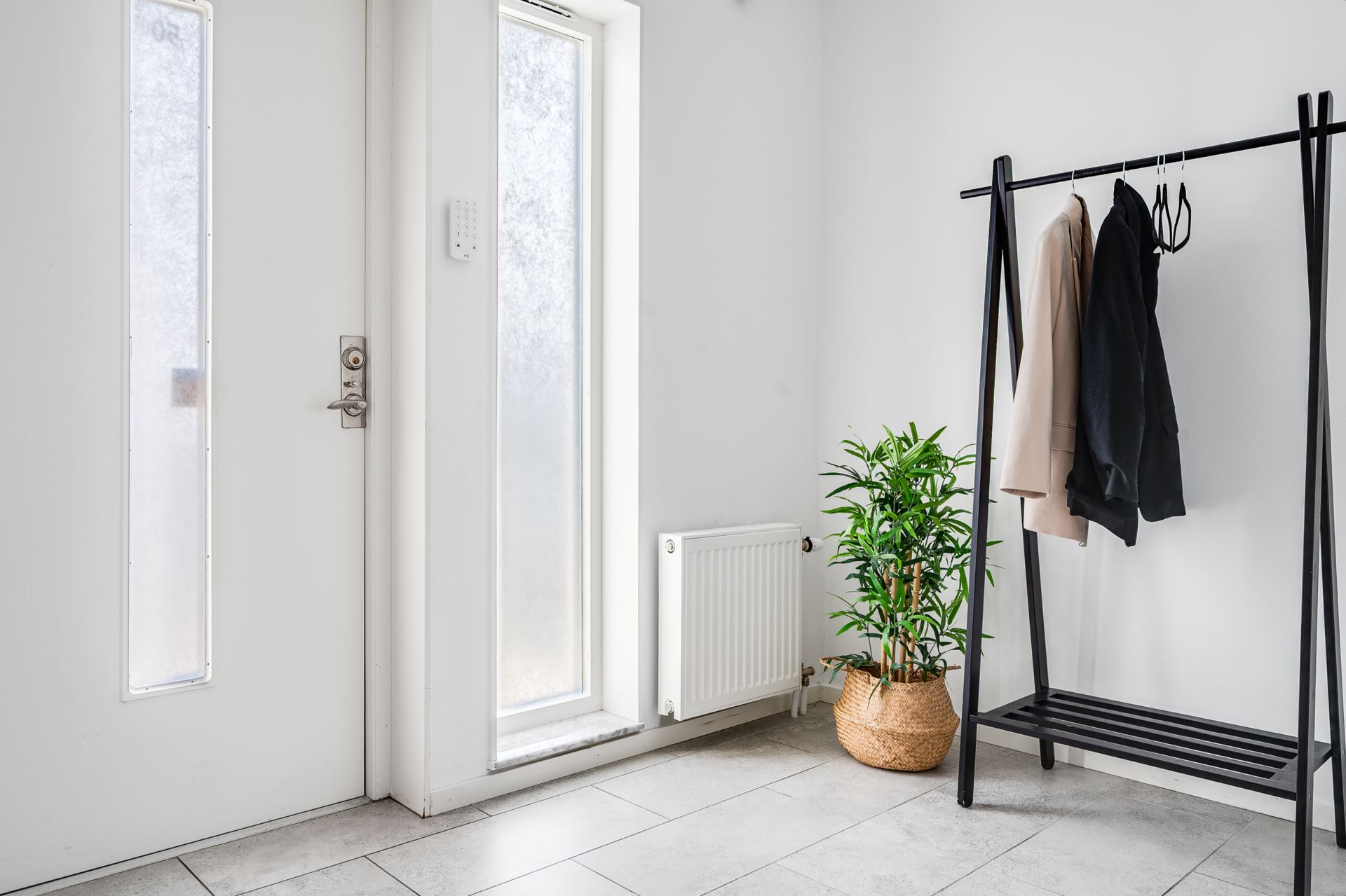 I hallen möts vi av just klinkergolv och vitmålade väggar. Plats för förvaringsmöjligheter och avhängning.