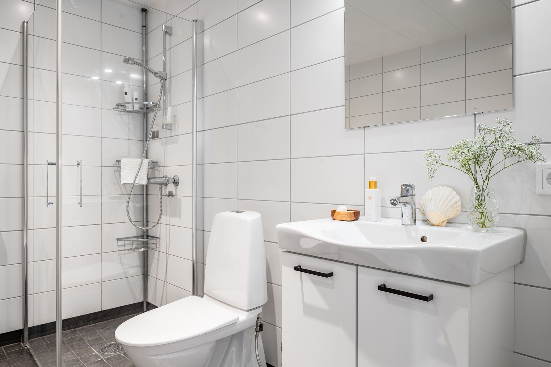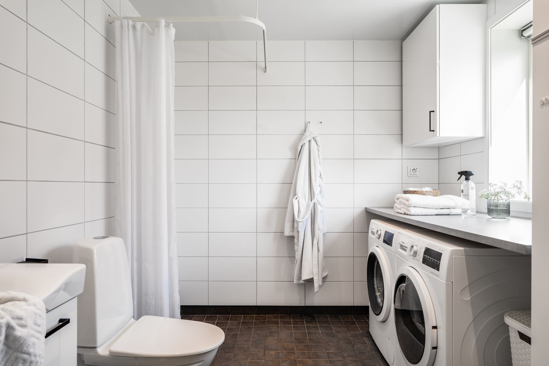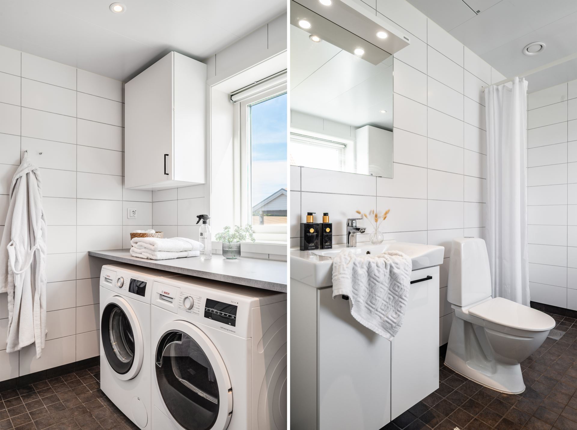 Mörkgrått klinkergolv och vitkaklade väggar. Badrummet är utrustat med kommod, spegel med belysning, wc (Ifö), dusch, väggskåp samt bänkskiva ovan tvättmaskin och torktumlare. Samtlig inredning är från Vedum och vitvarorna från Bosch.