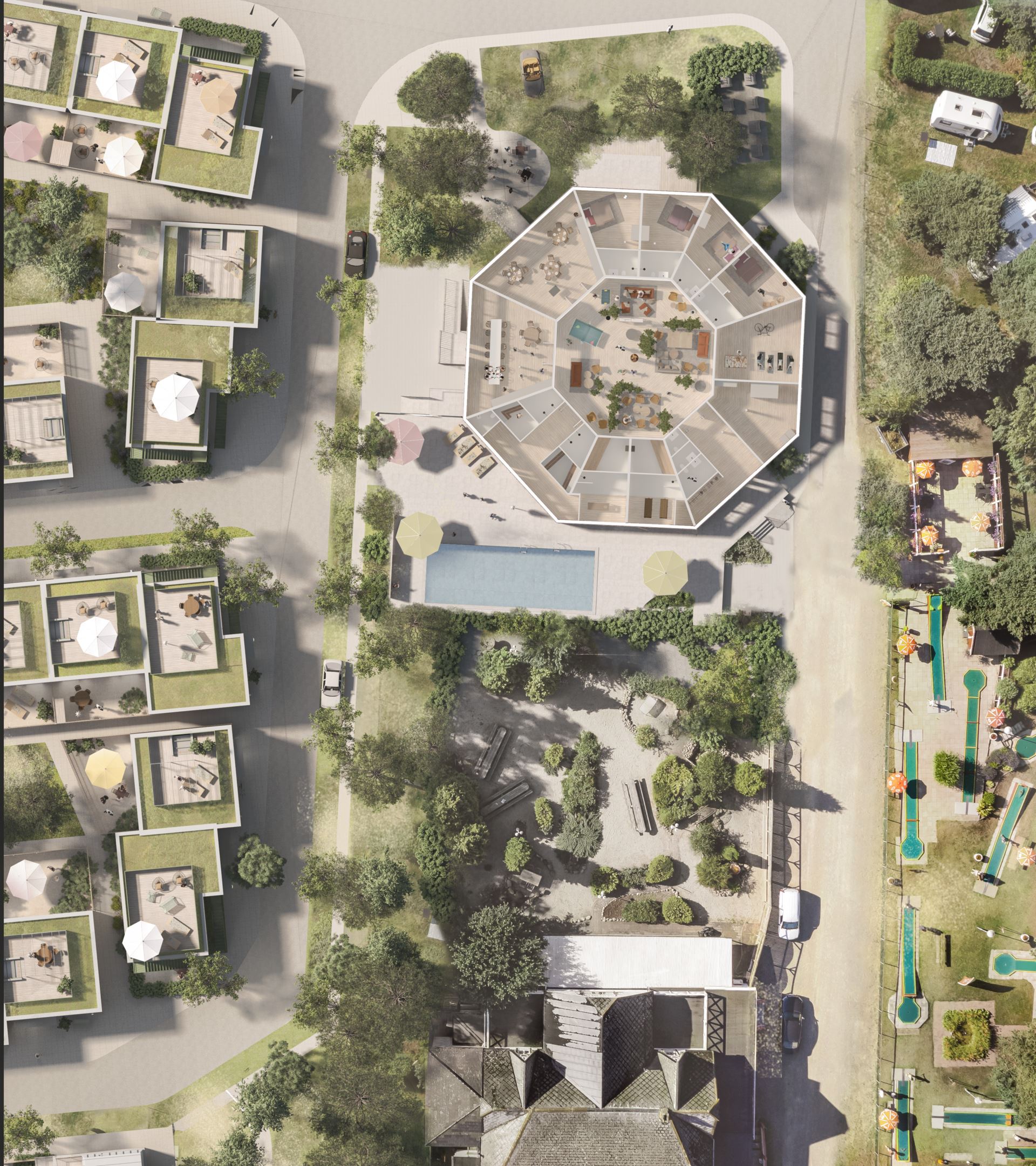 - Bottenplan erbjuder fem lägenheter per hus med 5 meters takhöjd i de sociala ytorna, privata trädgårdstäppor och entresolvåningar ovanför sovrum och badrum.