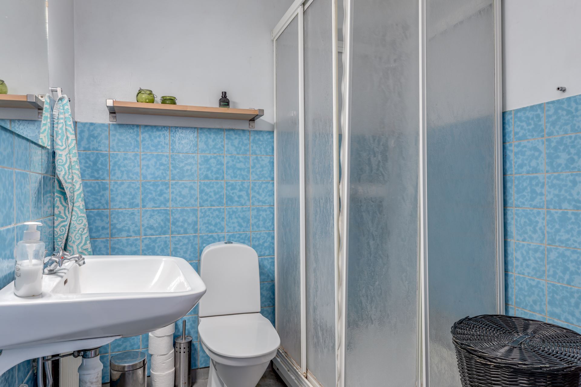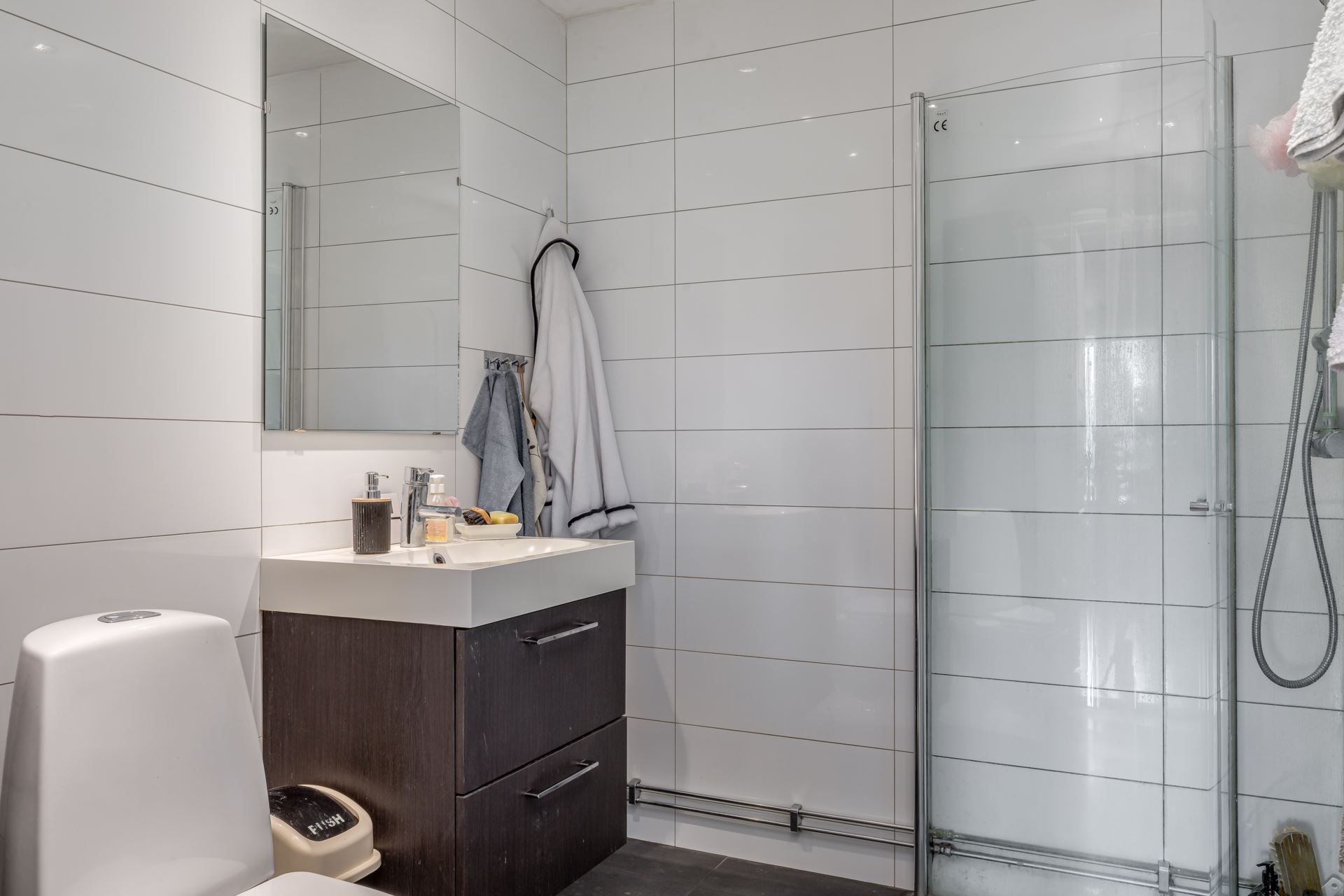 Badrummet är helkaklat i neutrala toner och utrustat med dusch, wc och kommod.
