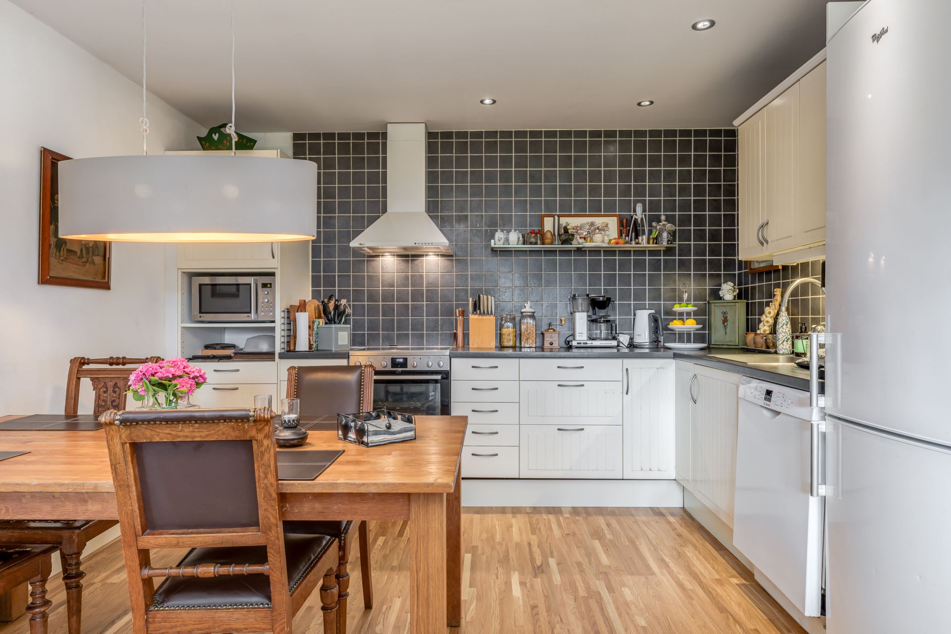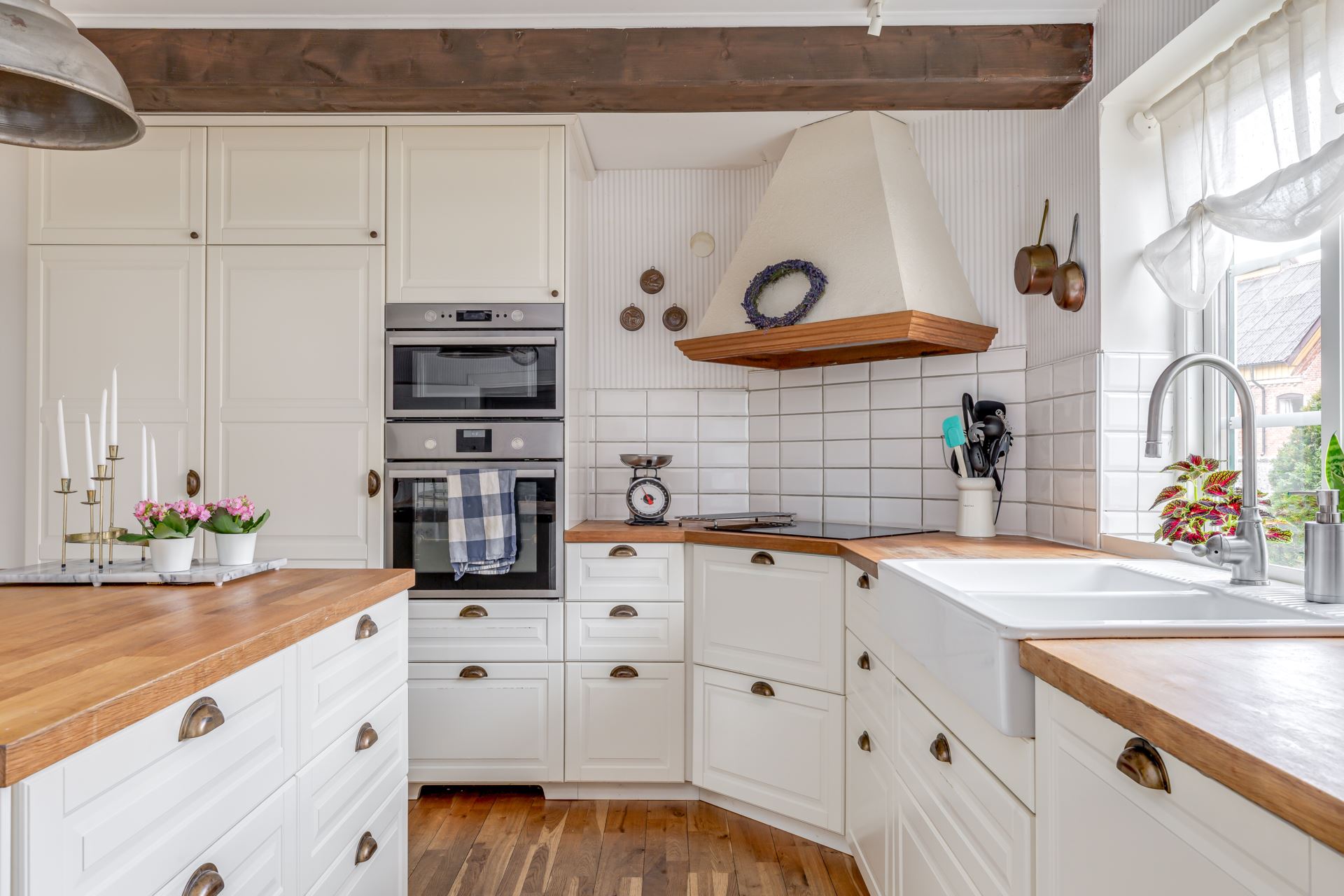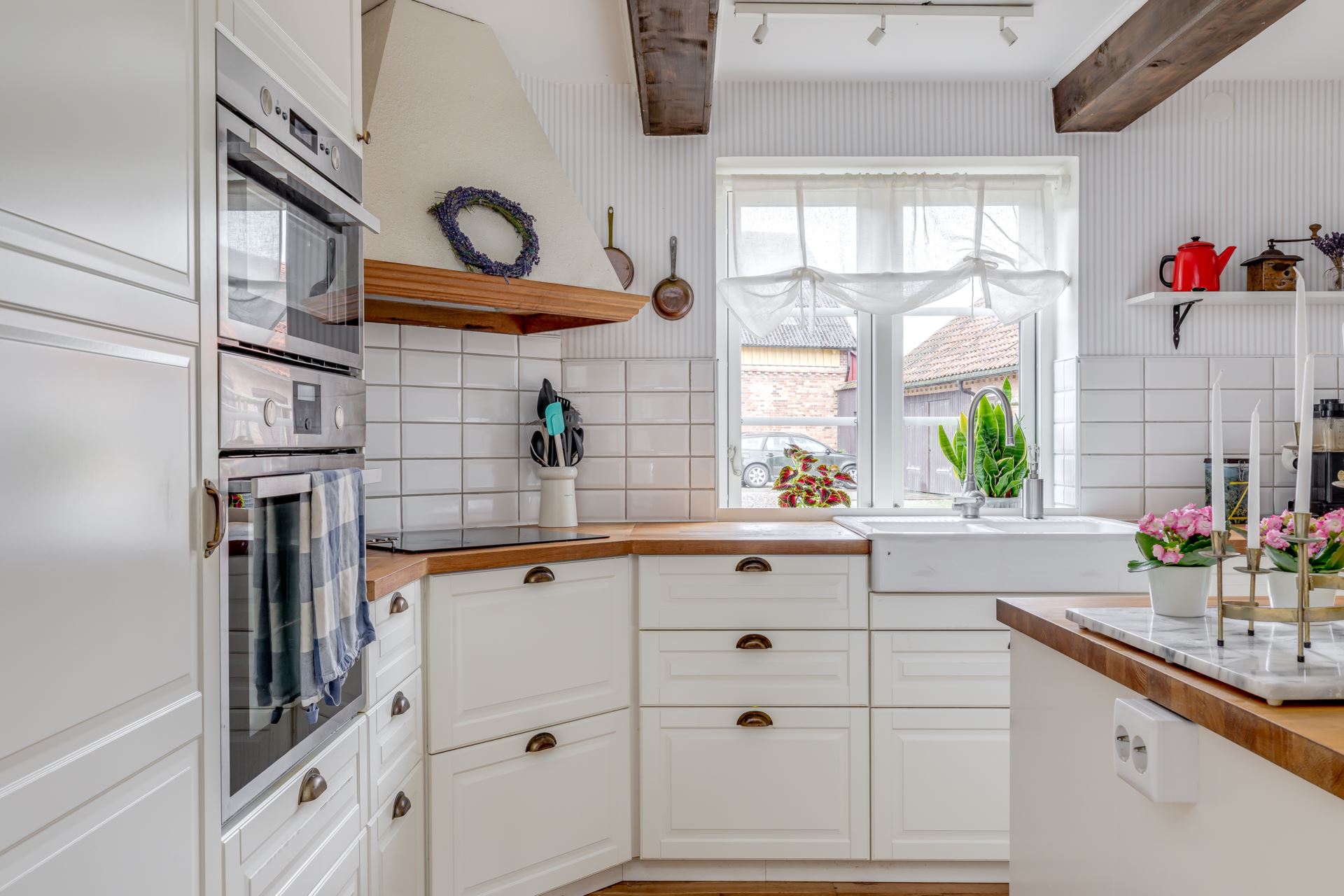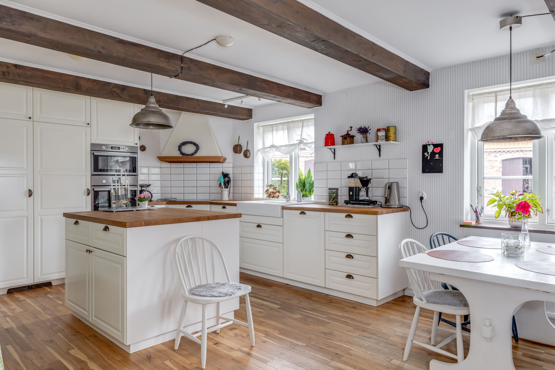 Ljust och inbjudande kök med lantlig karaktär och praktisk utformning. Köket är utrustat med vita skåpsluckor, bänkskivor i trä och en rejäl köksö som ger extra arbetsyta och förvaring. Tidlösa detaljer som vitrinskåp, infällda handtag och en klassisk spiskåpa bidrar till den varma känslan i rummet. Här finns gott om plats för matgrupp intill fönstren med utsikt över gårdsplanen. Fullt utrustat med inbyggd ugn, mikro, diskmaskin och bra förvaring i skafferi.