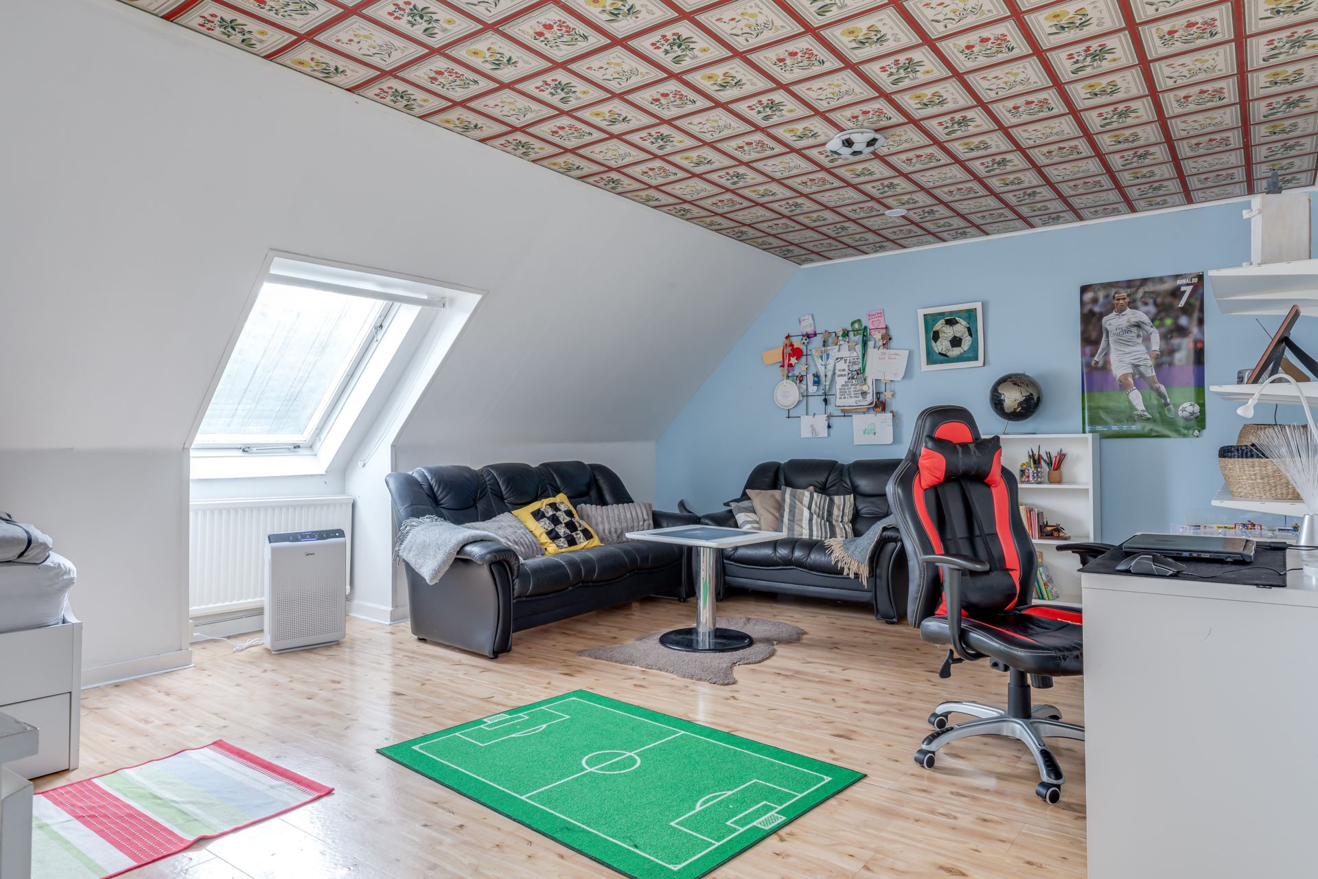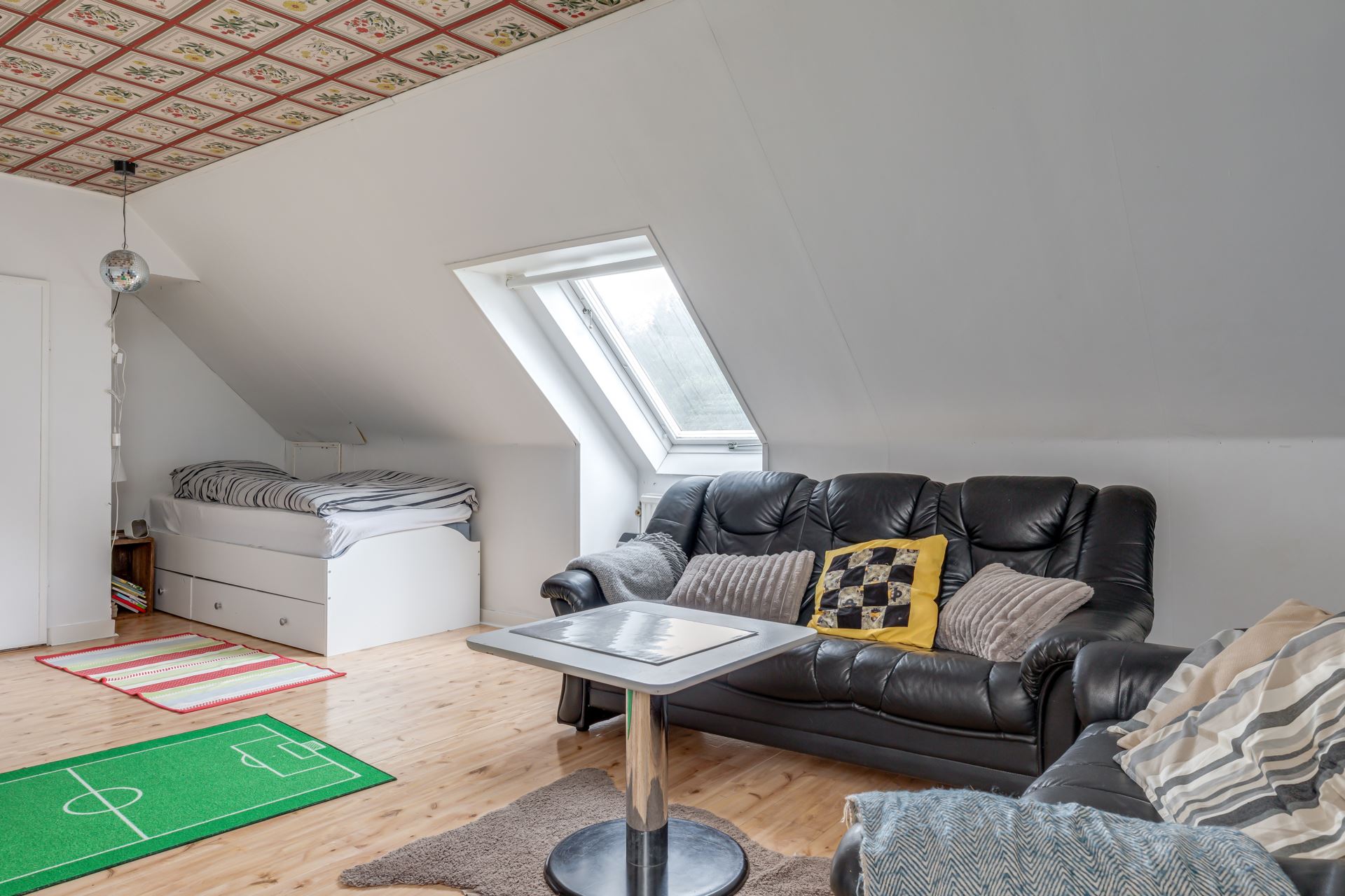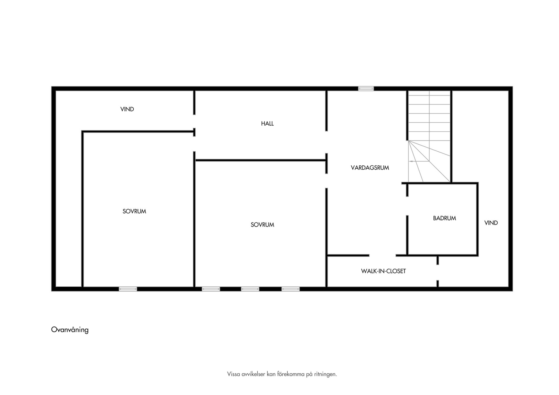 En trappa upp finns en rymlig och välplanerad ovanvåning med gott om plats för både familjeliv och privatliv. Här finns två stora sovrum, båda med bra ljusinsläpp och möjlighet till flexibel möblering. Ett extra allrum fungerar perfekt som TV-rum, lekrum eller arbetsyta. Det finns också ett badrum, walk-in-closet med god förvaring samt två separata vindsutrymmen som lämpar sig för ytterligare förvaring eller hobbyverksamhet. Våningen ramas in av en central hall som binder samman alla rum på ett praktiskt sätt.