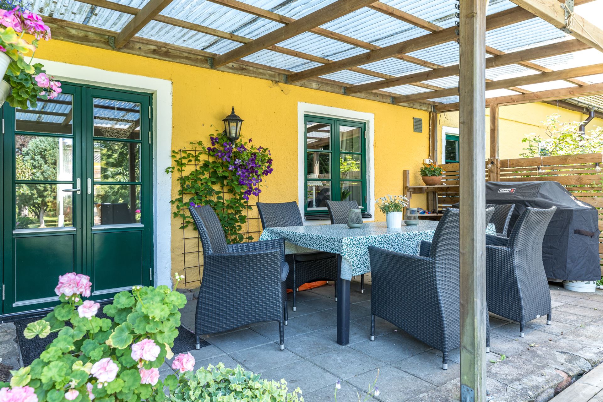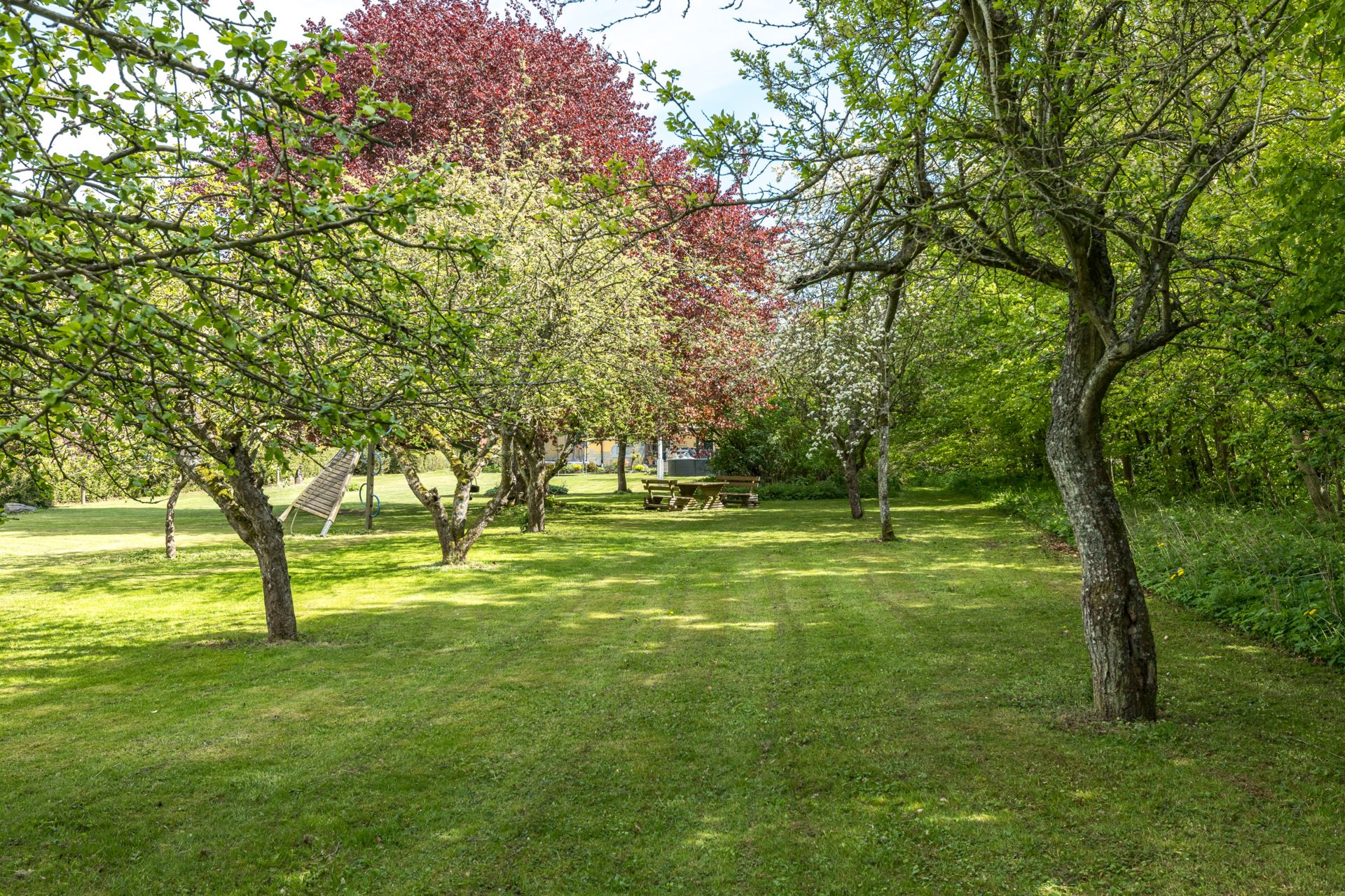 I anslutning ligger ett rymligt vardagsrum med plats för både soffgrupp och matsalsmöbler. Ljusa väggar och flera fönster ger en luftig känsla och fin utsikt över trädgården. Härifrån nås även sovrummet som rymmer dubbelsäng och förvaringsmöbel och har ett rofyllt läge mot husets gavel.