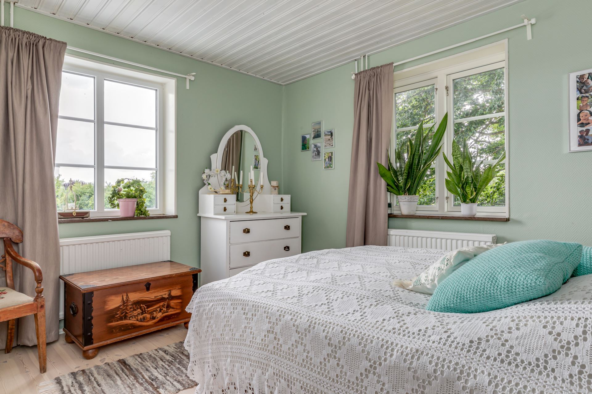 På bottenvåningen finns ett praktiskt sovrum med avskilt läge. Fönster ger fint ljusinsläpp och skapar en ljus atmosfär. Här finns plats för säng, förvaring och skrivbord eller annan möblering efter behov.