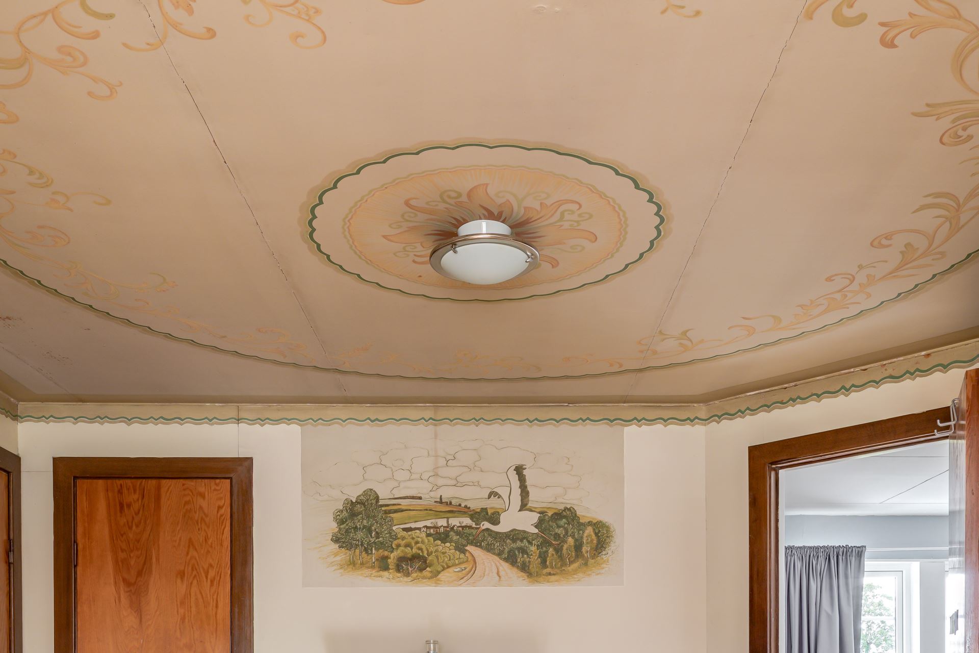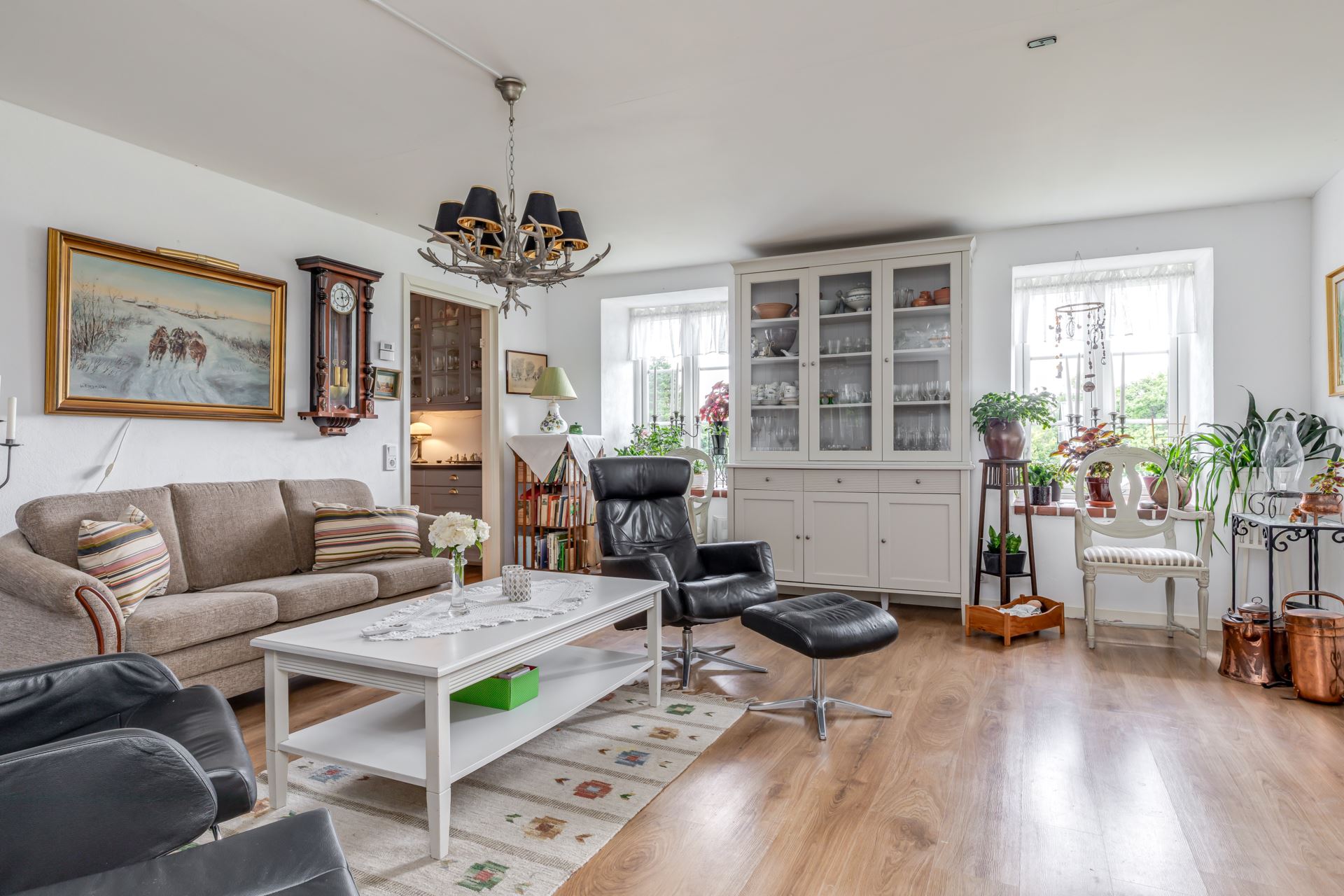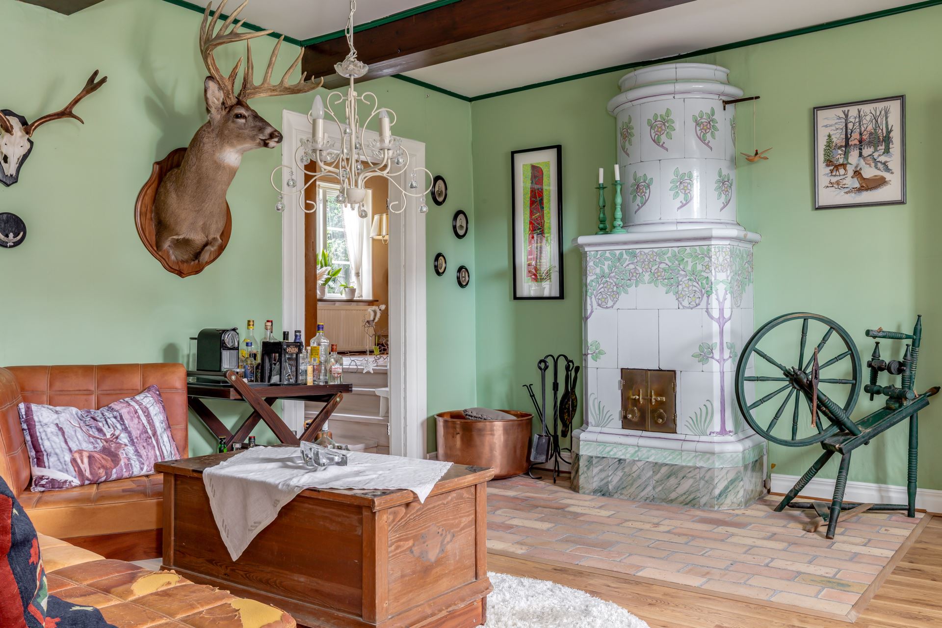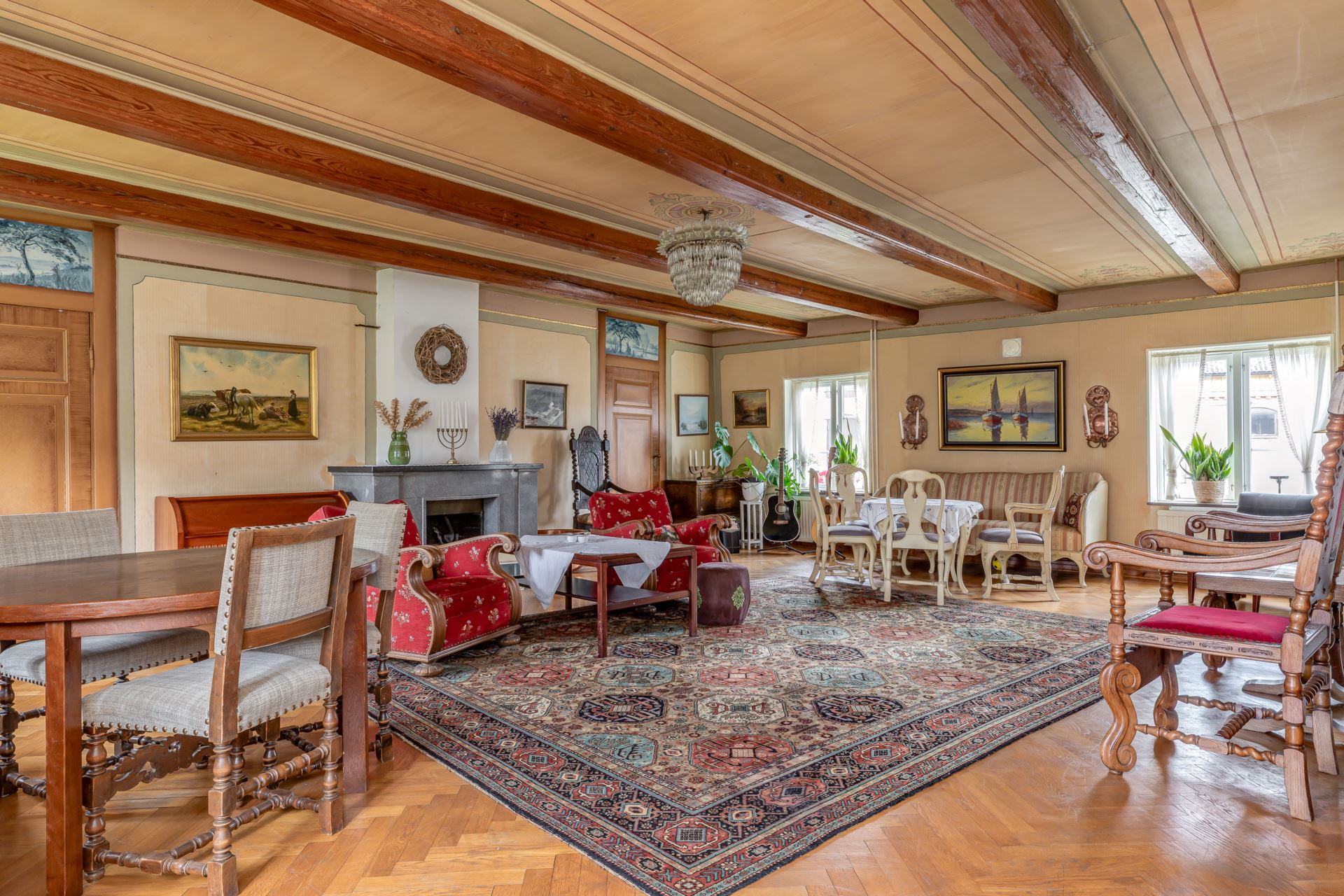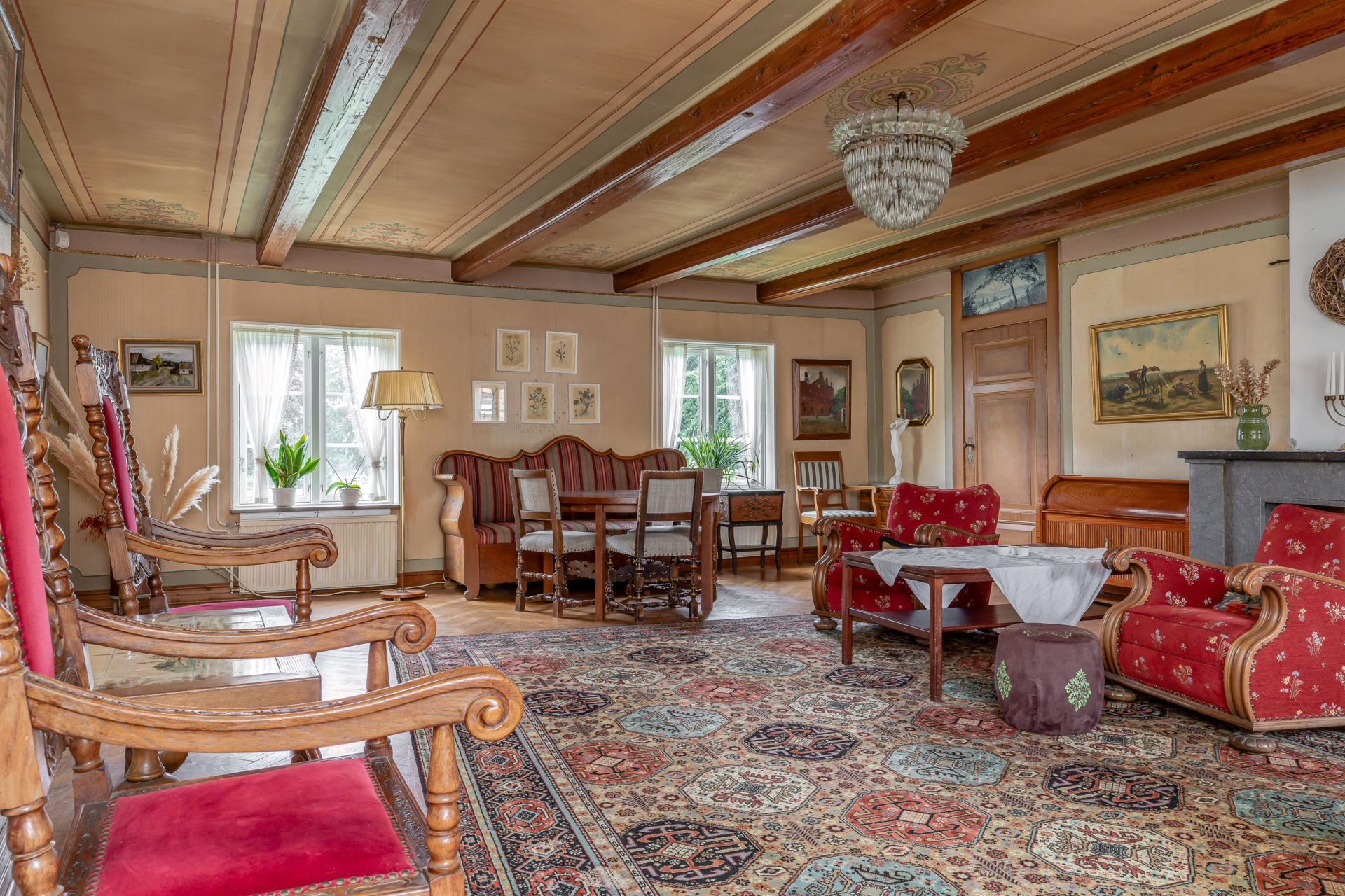 Den stora salen är husets hjärta och bjuder in till både vardagligt umgänge och festliga tillställningar. Här finns gott om plats för flera sittgrupper, matsalsmöblemang och socialt liv. Rummet präglas av vacker fiskbensparkett, synliga takbjälkar och dekorativa takmålningar som bevarar husets ursprungliga charm. En klassisk öppen spis ger både värme och karaktär, och de många fönstren skapar ett naturligt ljusflöde som lyfter rummet ytterligare.