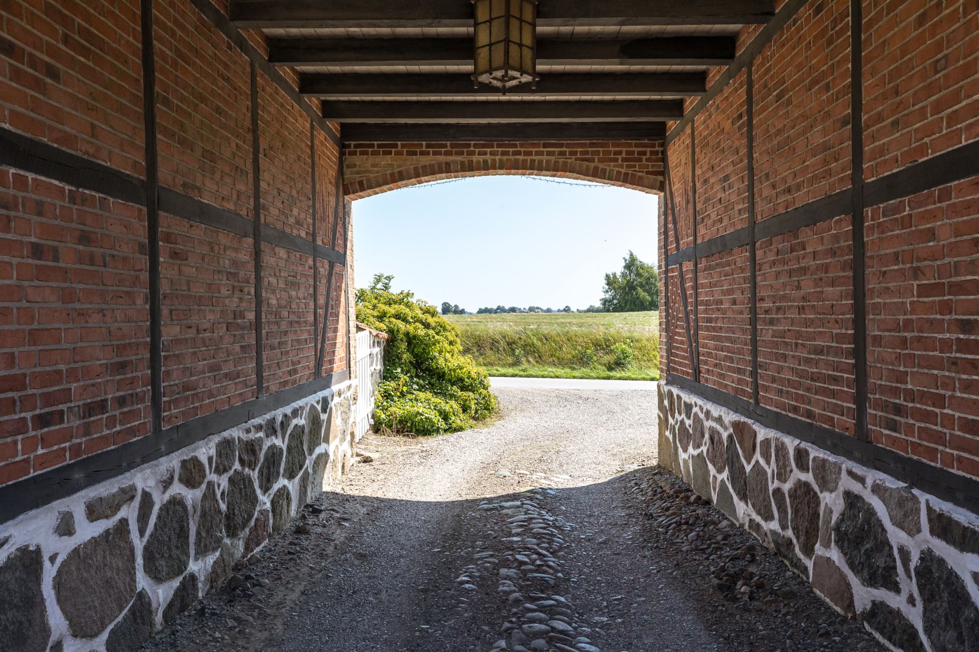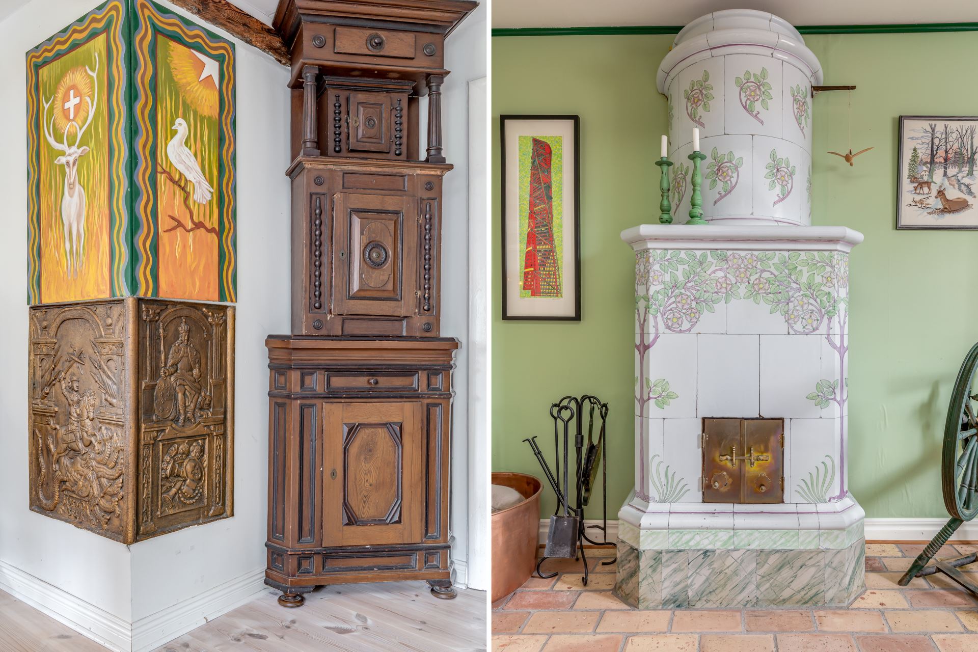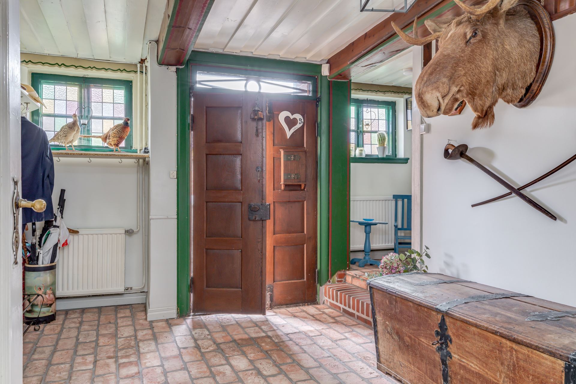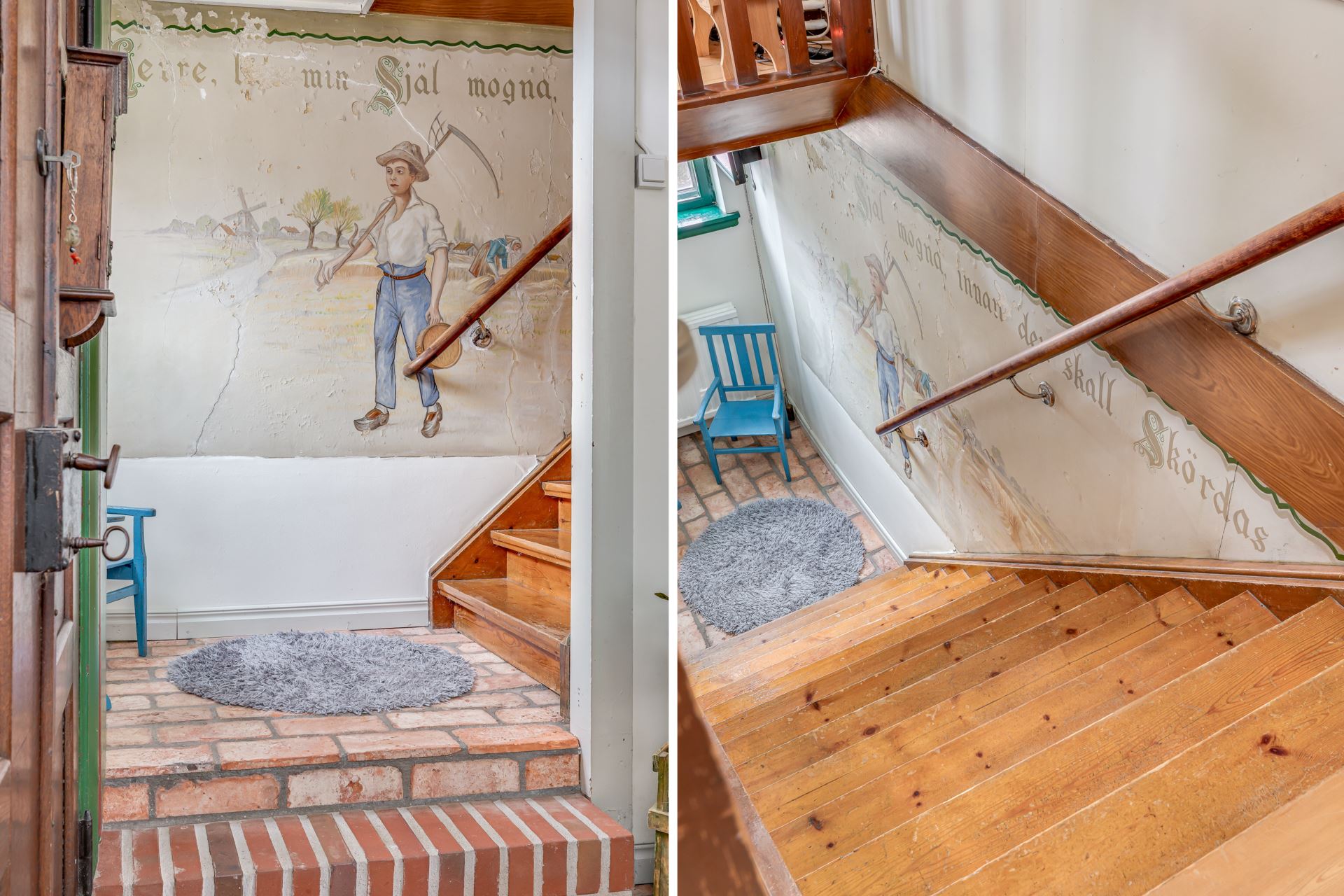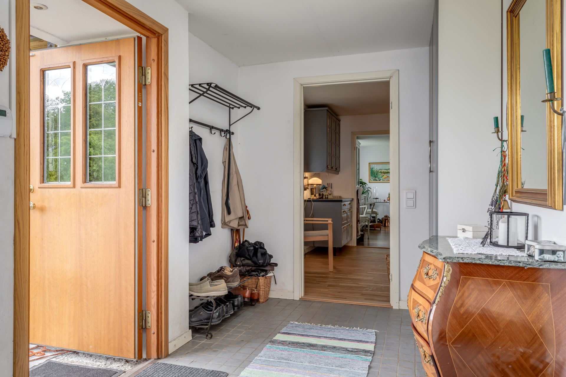 Redan i entrén möts man av husets karaktär. Den vackra trädörren, blyinfattade fönster och synliga takbjälkar ger ett varmt och rustikt första intryck. Golvet i tegel är både slitstarkt och tidstypiskt, och bidrar till den lantliga känslan. Här finns plats för klädförvaring och god överblick mot resten av huset.