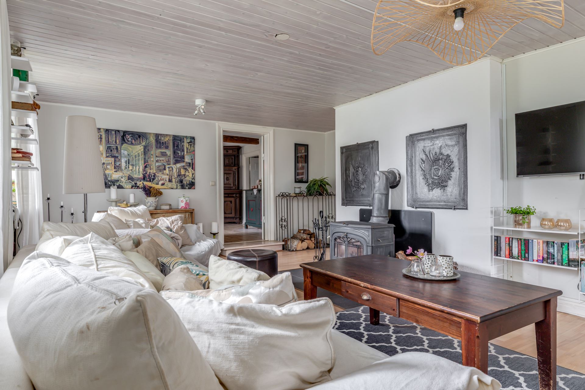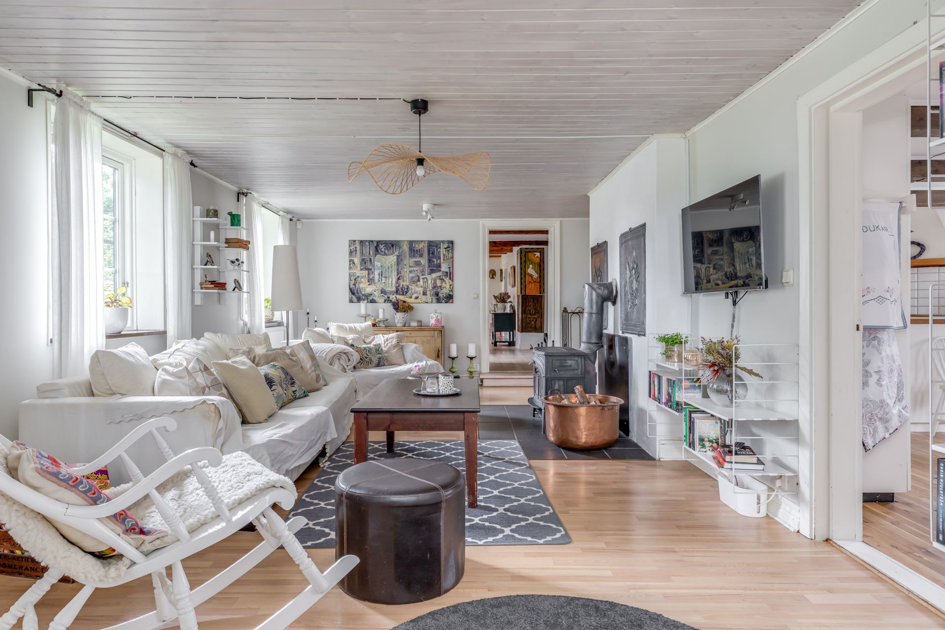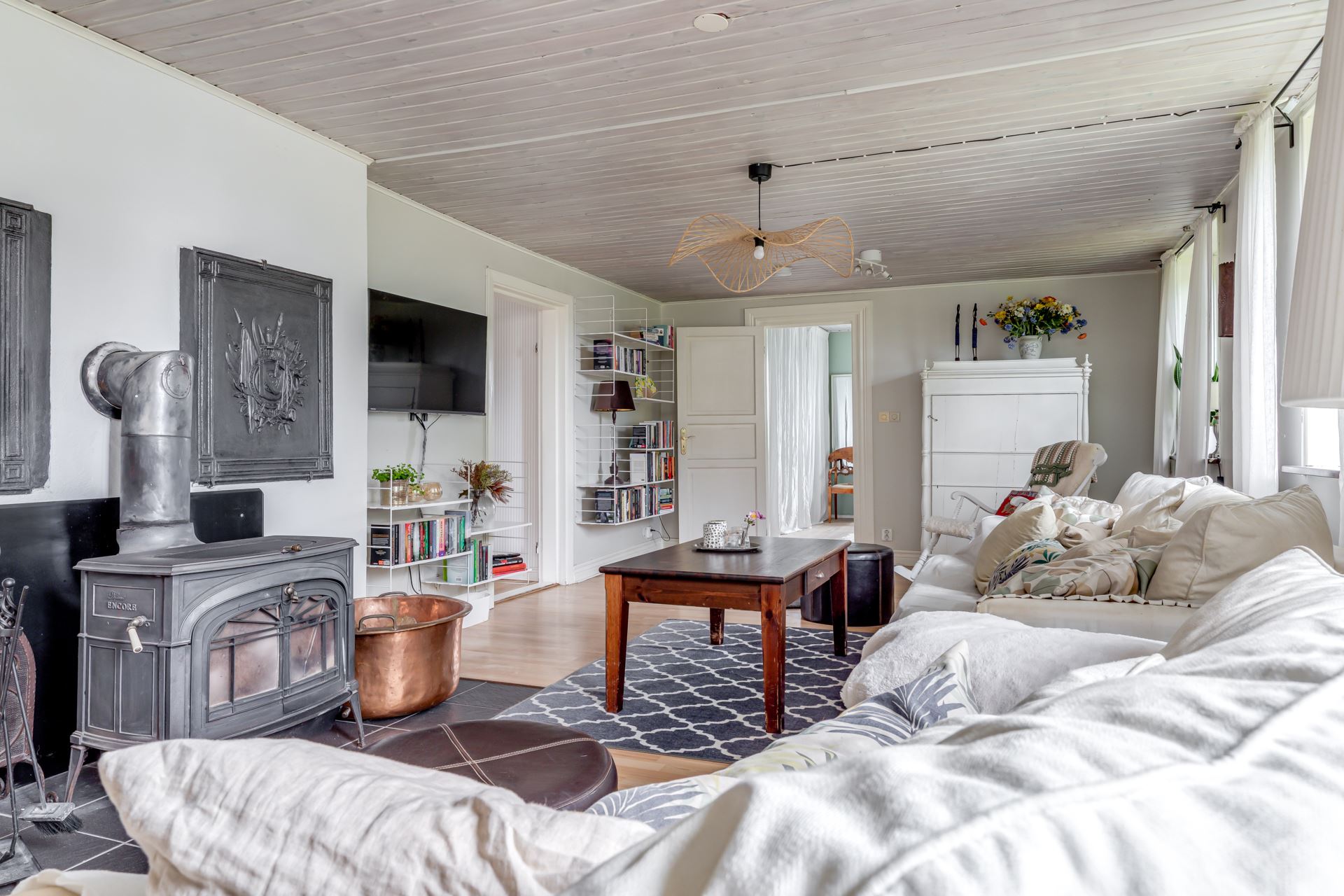 Ljust och trevlig allrum med fönster mot trädgården. Parkettgolv, ljust målade väggar och tak. Stor fungerande braskamin.