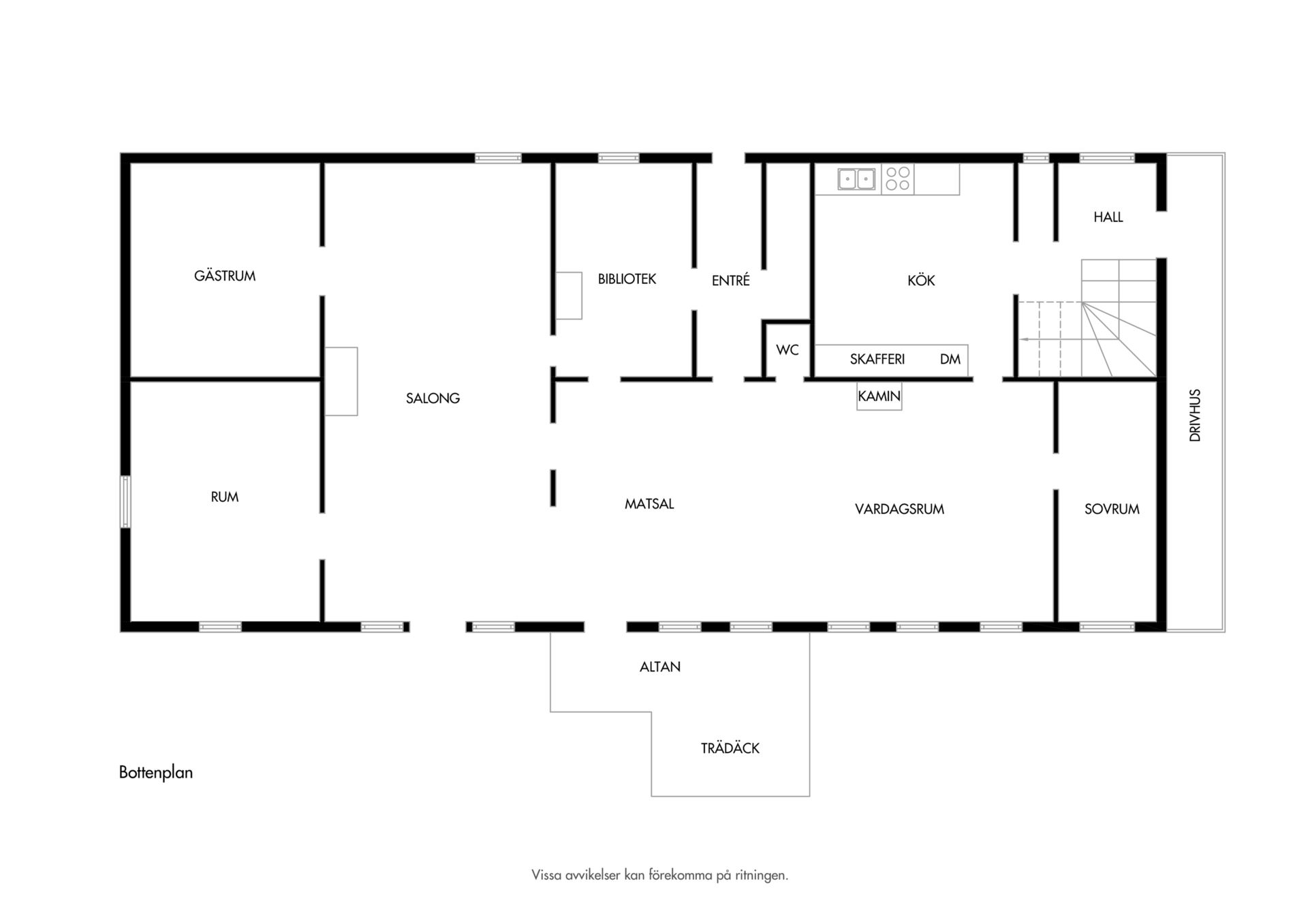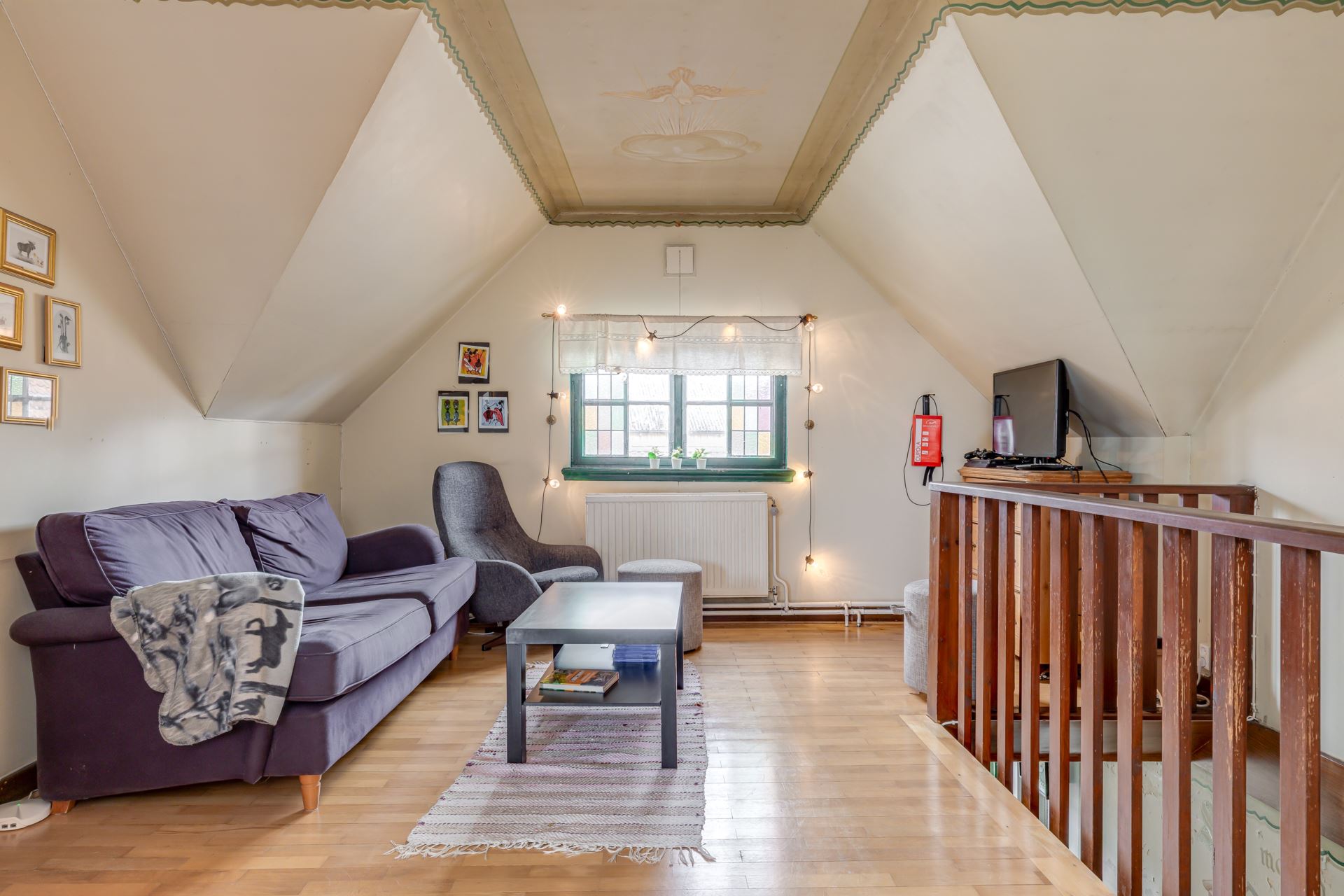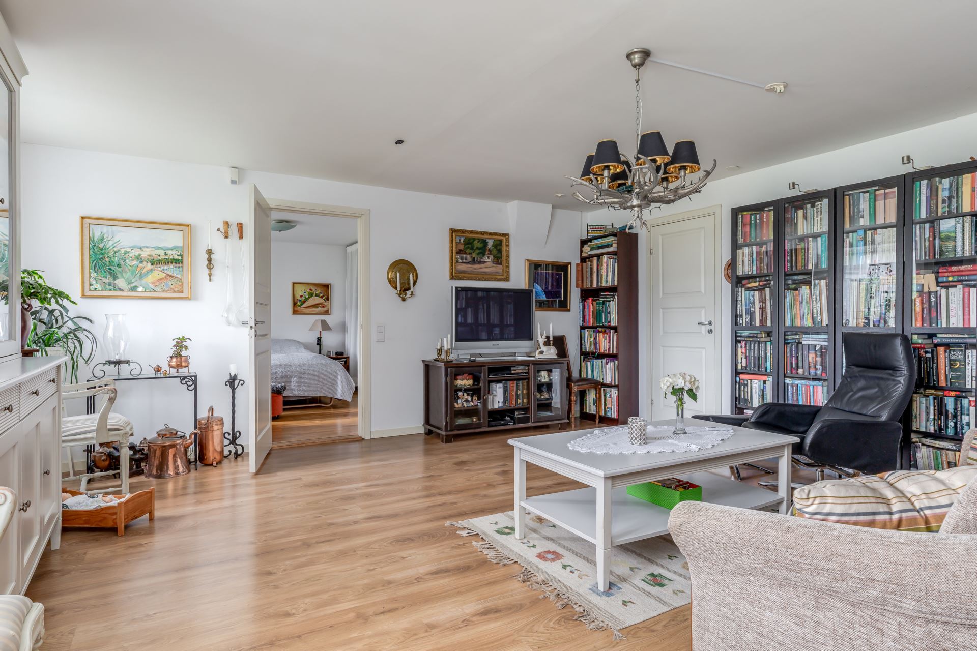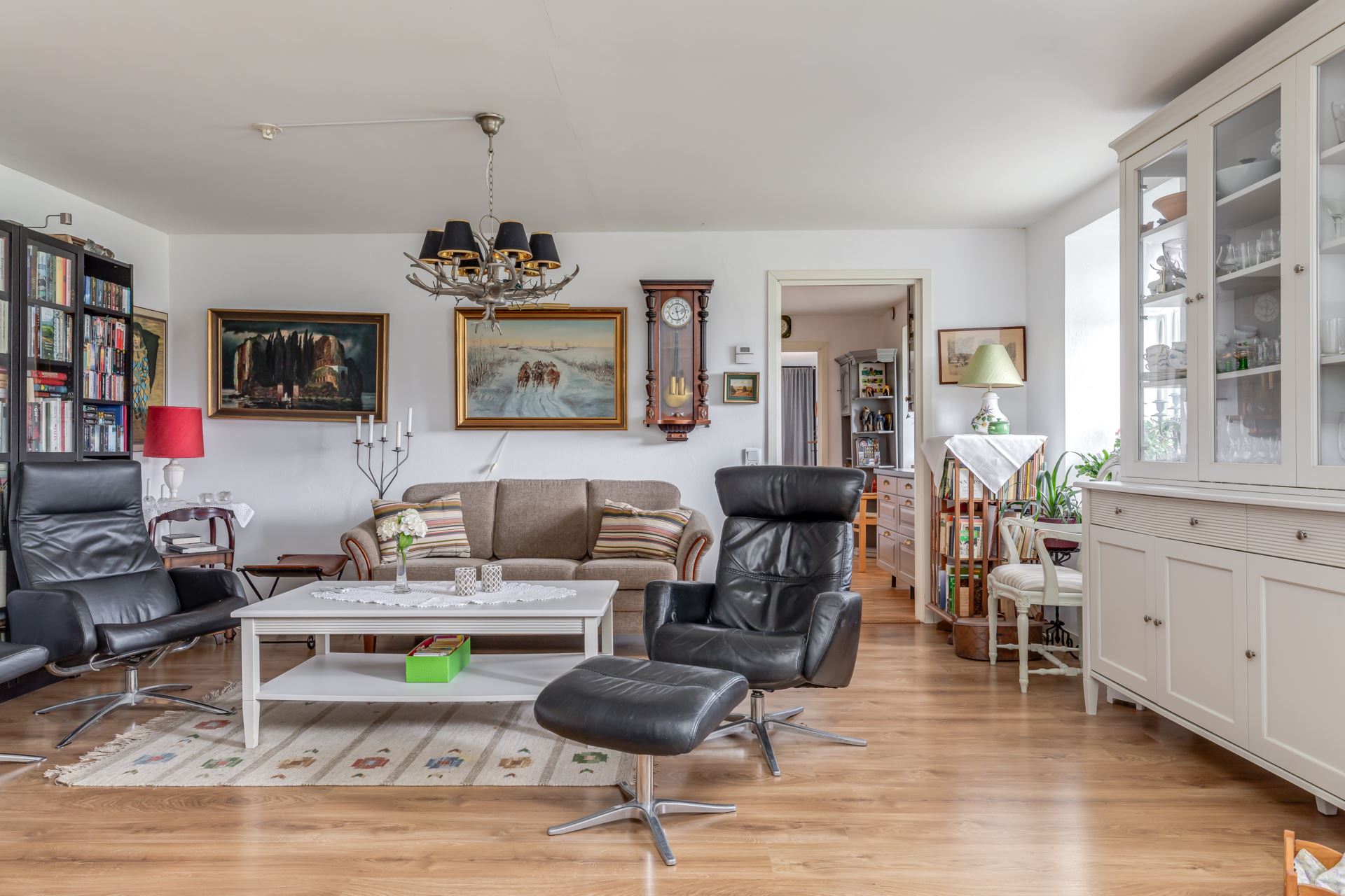 Ljust och trevlig allrum med fönster mot trädgården. Parkettgolv, ljust målade väggar och tak. Stor fungerande braskamin.