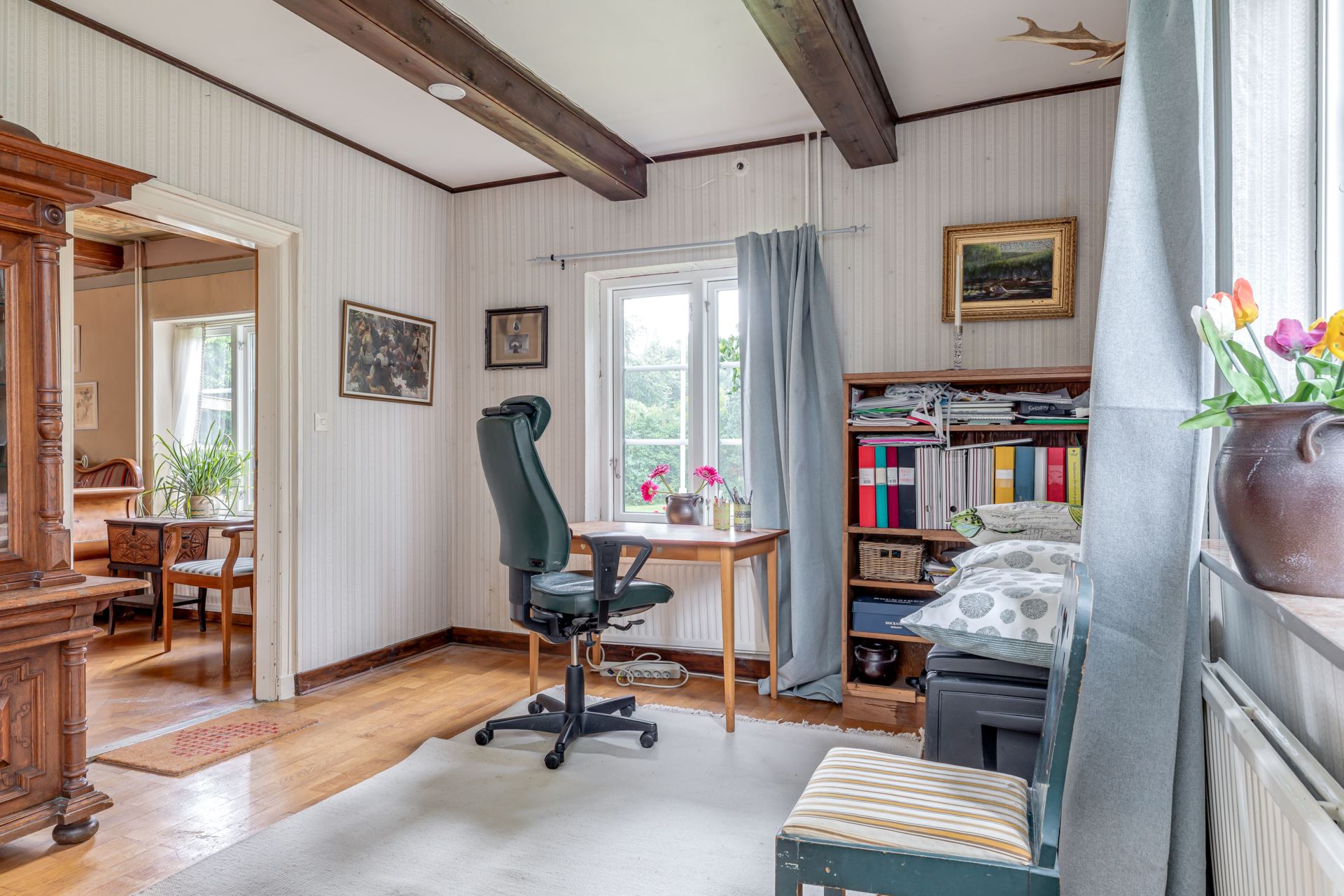 Härligt rum med fönster mot trädgården. Synliga takbjälkar, trägolv och tapetserade väggar.