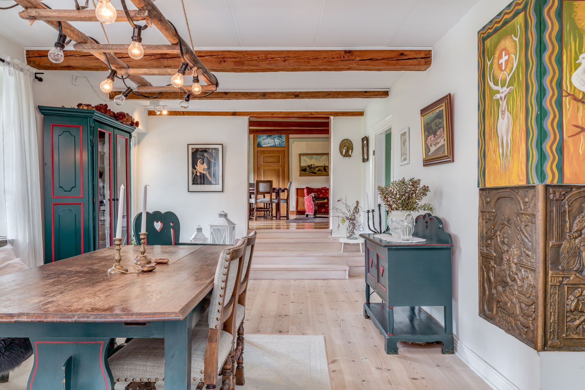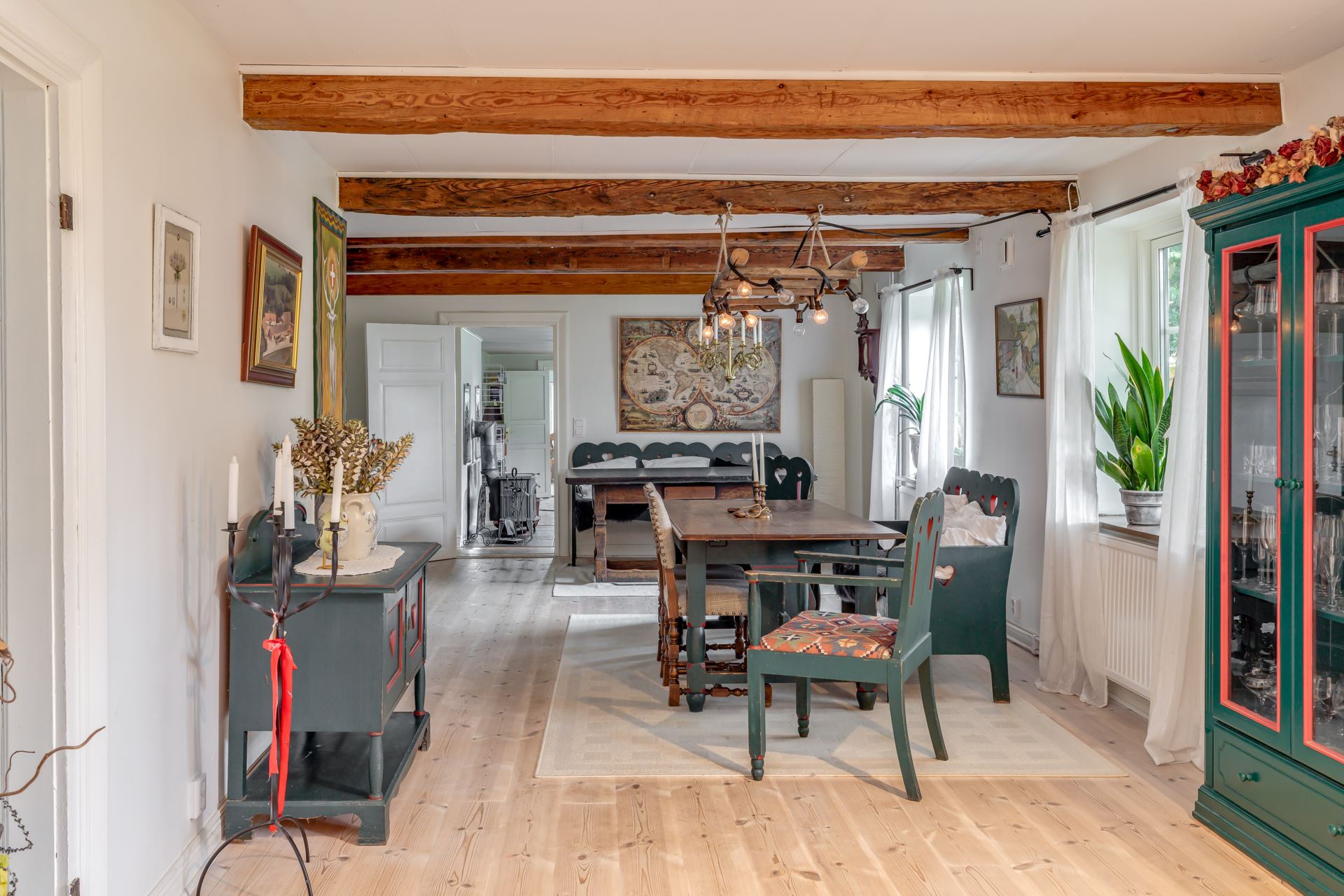 Matrummet är hemtrevligt och rymligt, med plats för stora sällskap kring matbordet. Rummet präglas av synliga takbjälkar och vackert trägolv som tillsammans ger en varm och traditionell känsla. Fönster i två väderstreck släpper in gott om ljus och skapar en ljus och luftig stämning. Här finns en naturlig förbindelse mellan kök, salong och vardagsrum, vilket gör rummet till en central samlingspunkt i huset.