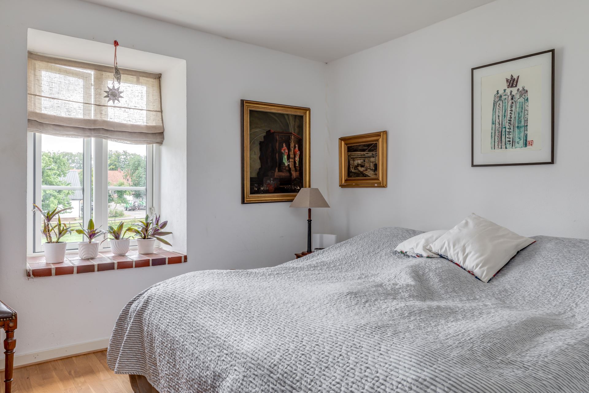 Vidare på nedervåningen finns ytterligare ett sovrum med fönster in mot gården. Tapetserade väggar, trägolv och synliga takbjälkar