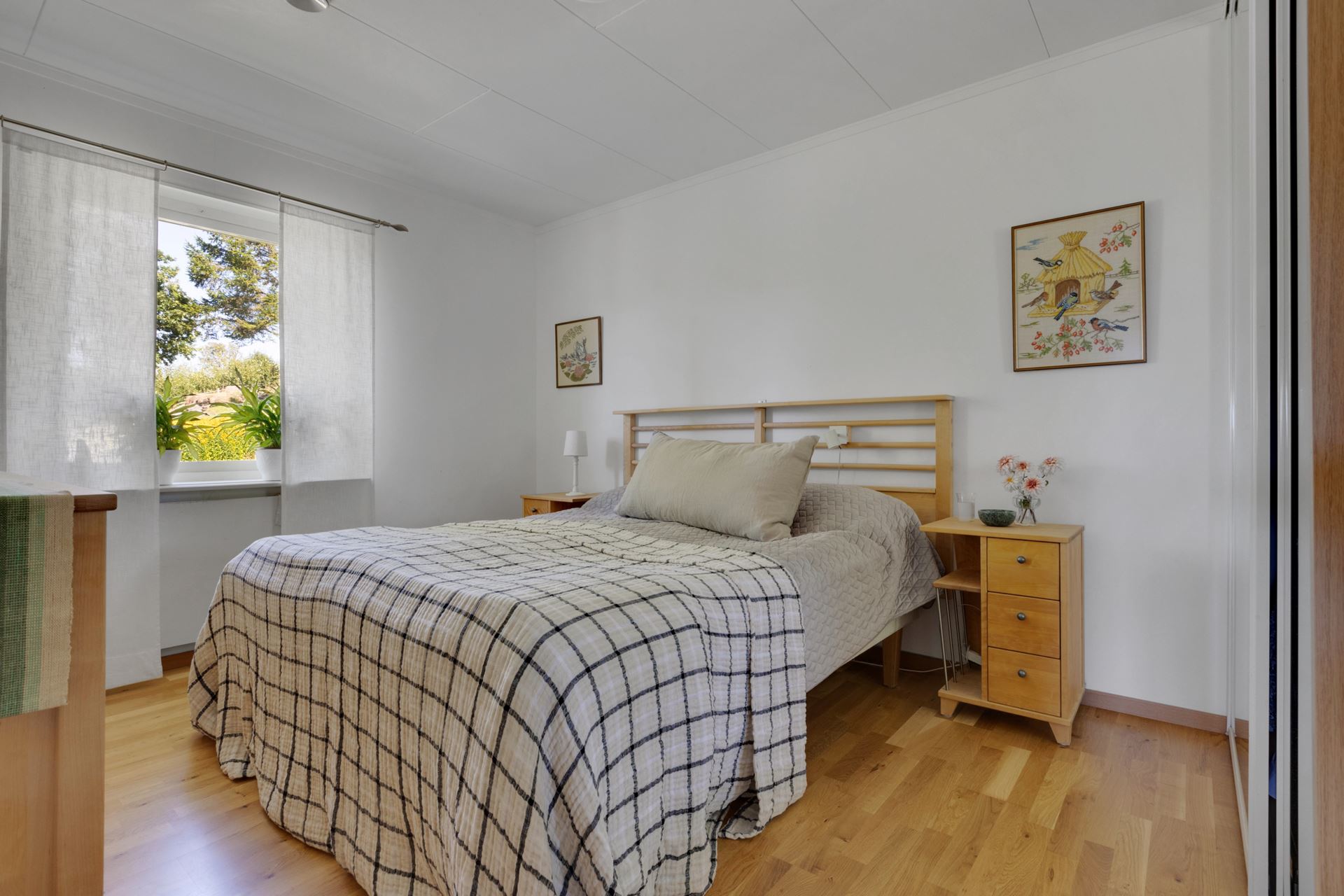 Det största av sovrummen ligger i husets gavel med fönster mot trädgården. Ytan är lätt att möblera och ger utrymme för både säng, skrivbord och förvaring och lämpar sig lika väl som barnrum, hemmakontor eller gästrum. Rummet har ekparkett, väggar av ljusa toner och en mjuk, avkopplande atmosfär. Här är det lätt att landa efter dagen, med lugnet från grönskan utanför som sällskap.