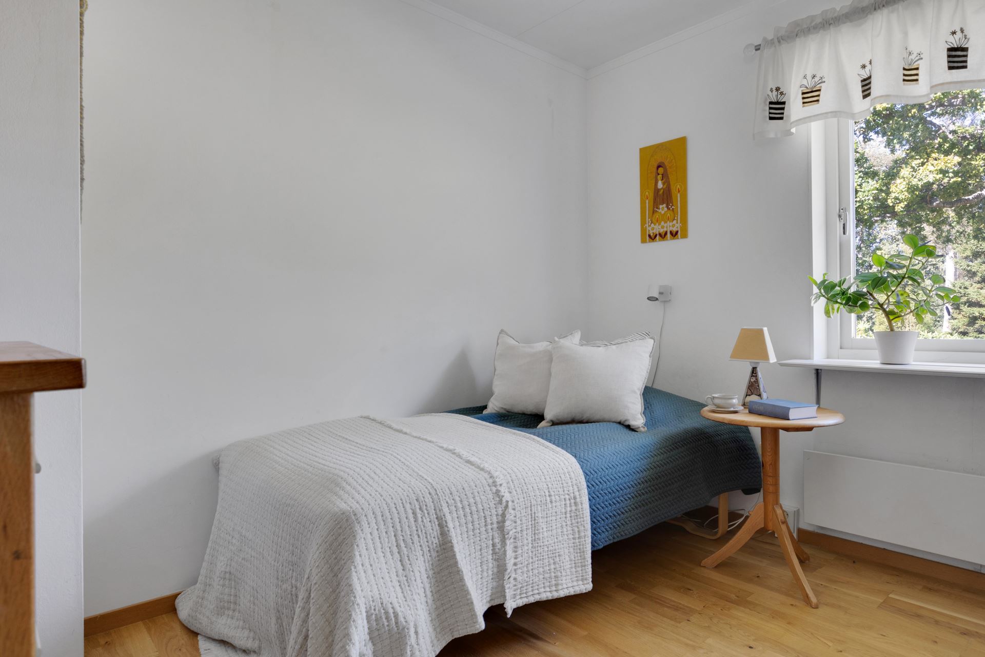 Det nedre sovrummet är trivsamt med ekparkettgolv, ljusa väggar i tapet och ett härligt fönster med grönskande utsikt. Här ryms både säng, förvaring och ett skrivbord eller fåtölj, ett perfekt gästrum eller ett privat krypin.