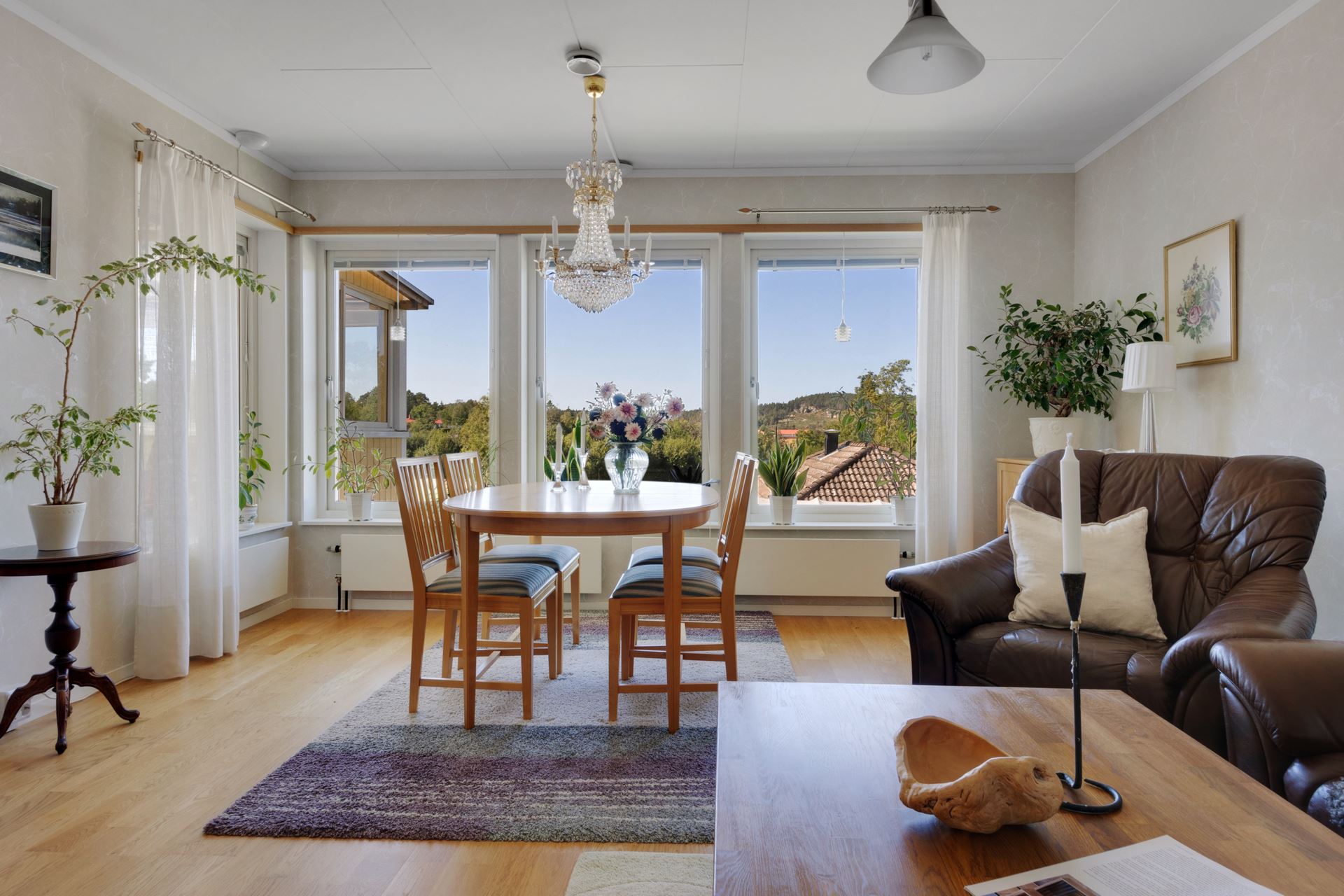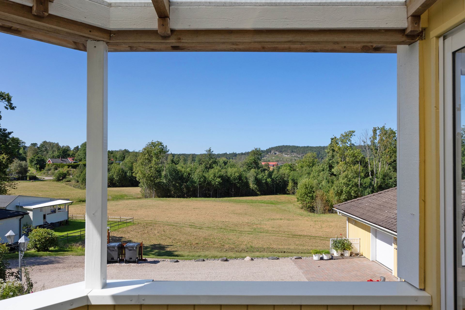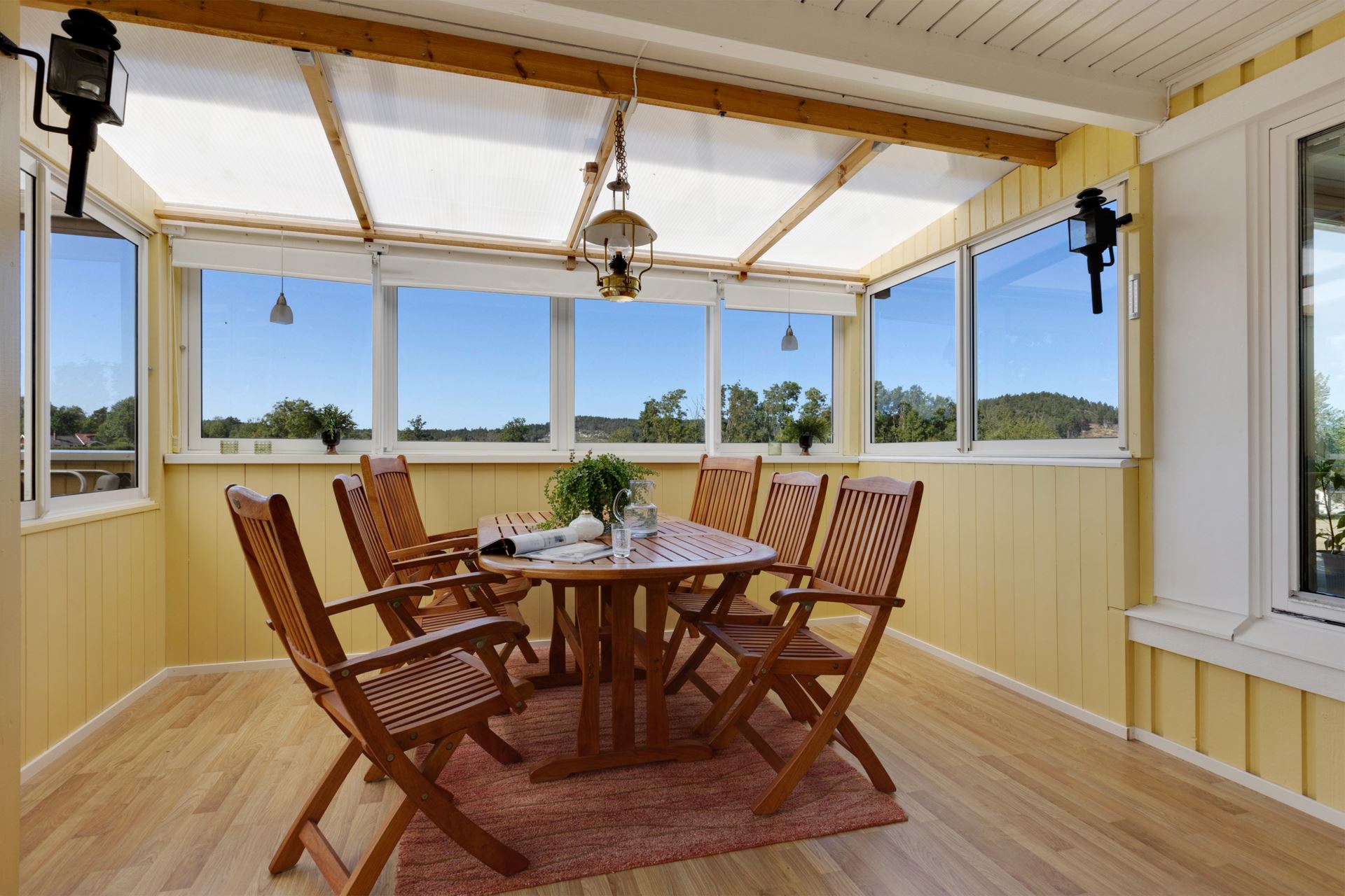 Intill köket ligger en rymlig matplats med fönster åt två håll, en naturlig samlingspunkt med utsikt mot trädgård och uterum. Ljuset som strömmar in ger rummet en varm karaktär, och den generösa ytan rymmer enkelt ett större matbord för både vardag och fest. Från köket når du även altanen som sedan leder till det härliga uterummet som har en vy över området och åkern på andra sidan fastigheten.