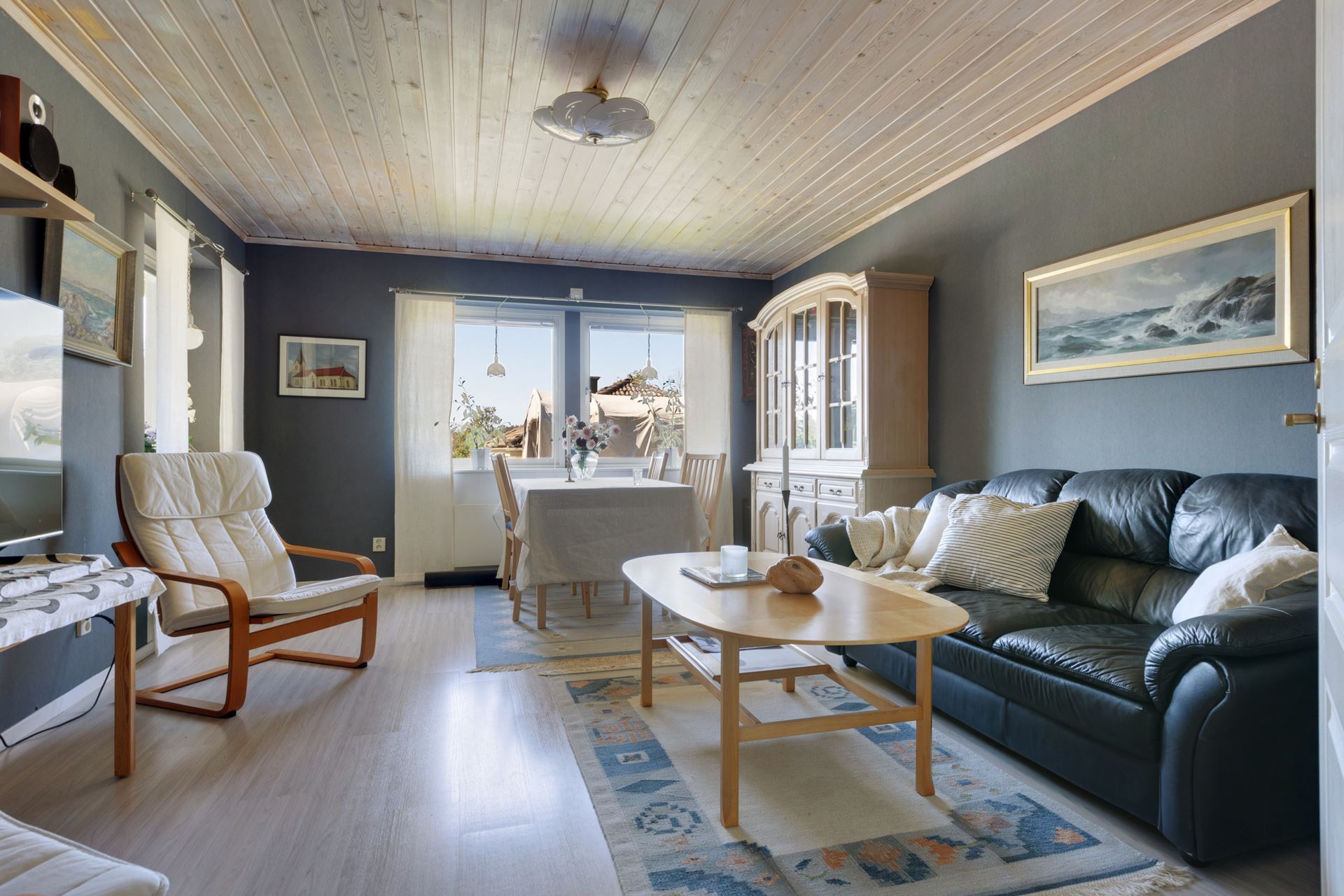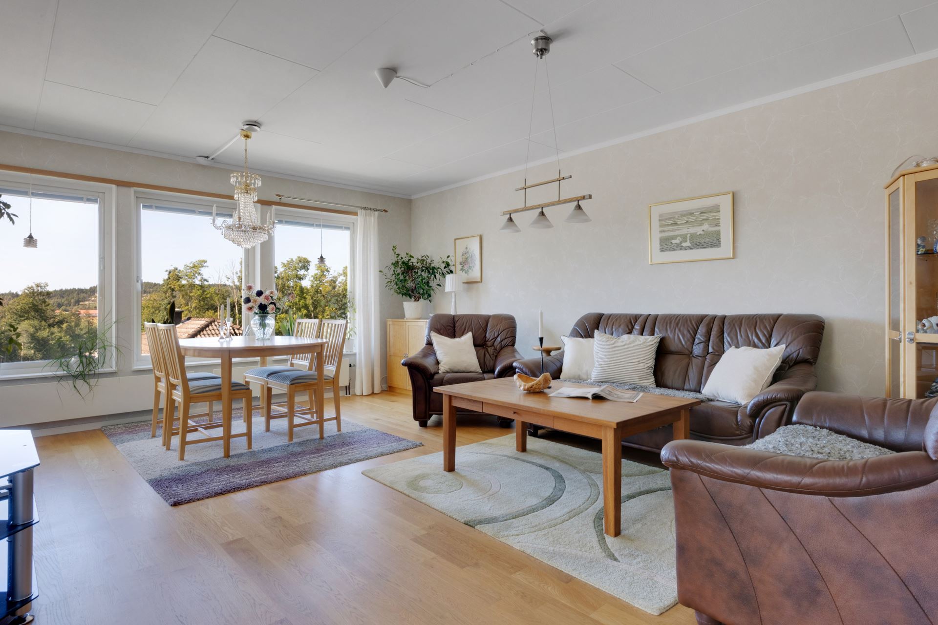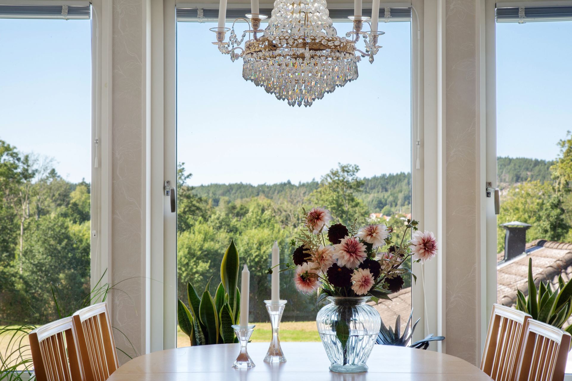 Intill köket ligger en rymlig matplats med fönster åt två håll, en naturlig samlingspunkt med utsikt mot trädgård och uterum. Ljuset som strömmar in ger rummet en varm karaktär, och den generösa ytan rymmer enkelt ett större matbord för både vardag och fest. Från köket når du även altanen som sedan leder till det härliga uterummet som har en vy över området och åkern på andra sidan fastigheten.