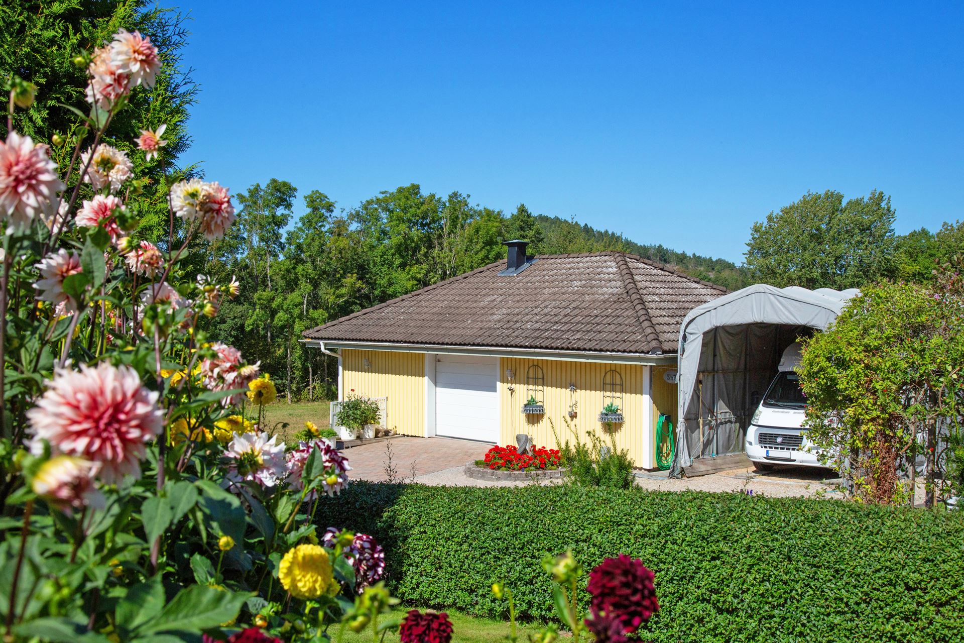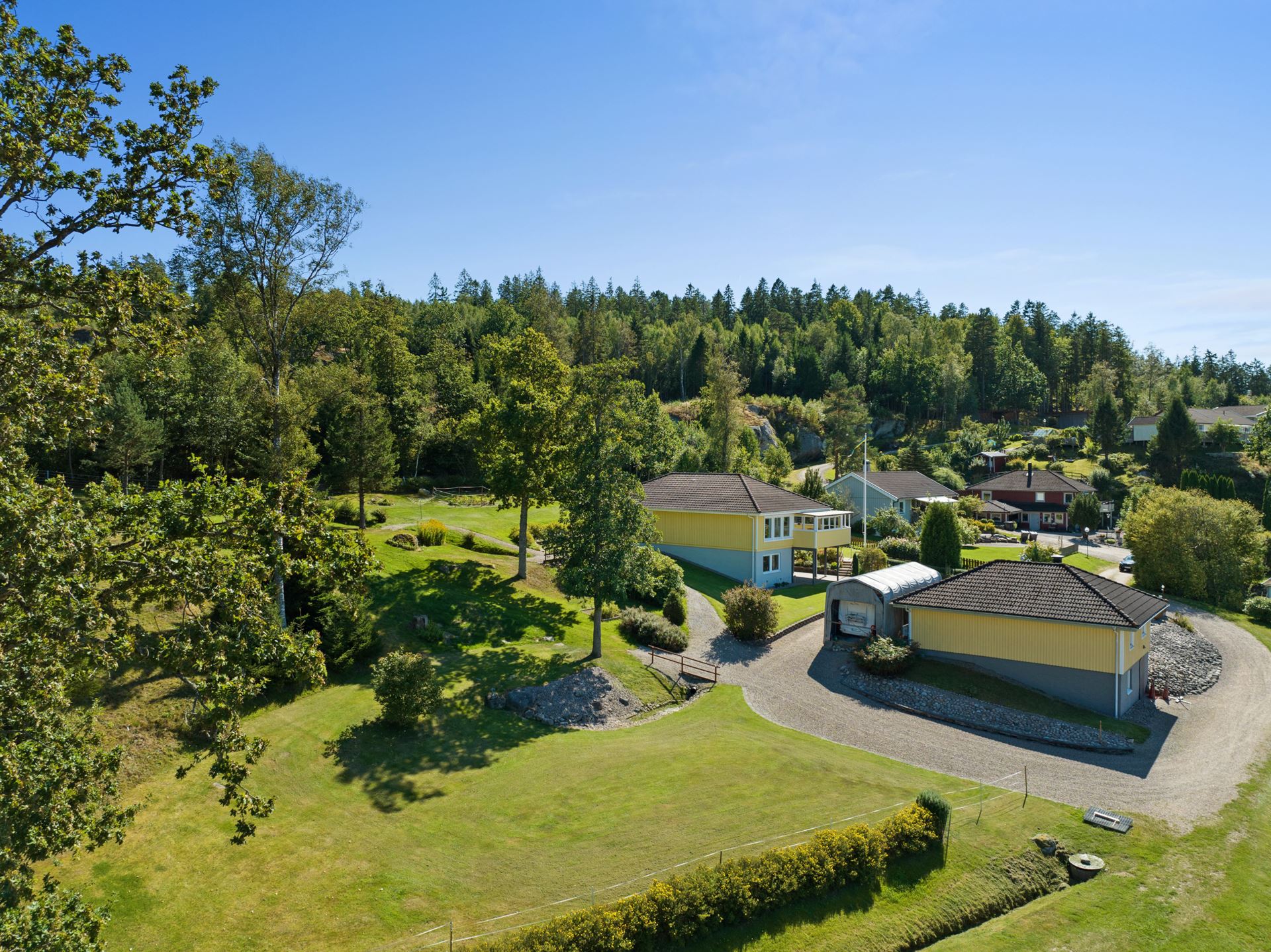 Stor yta framför huset att ställa flertalet bilar, det finns även ett större garage för parkering.