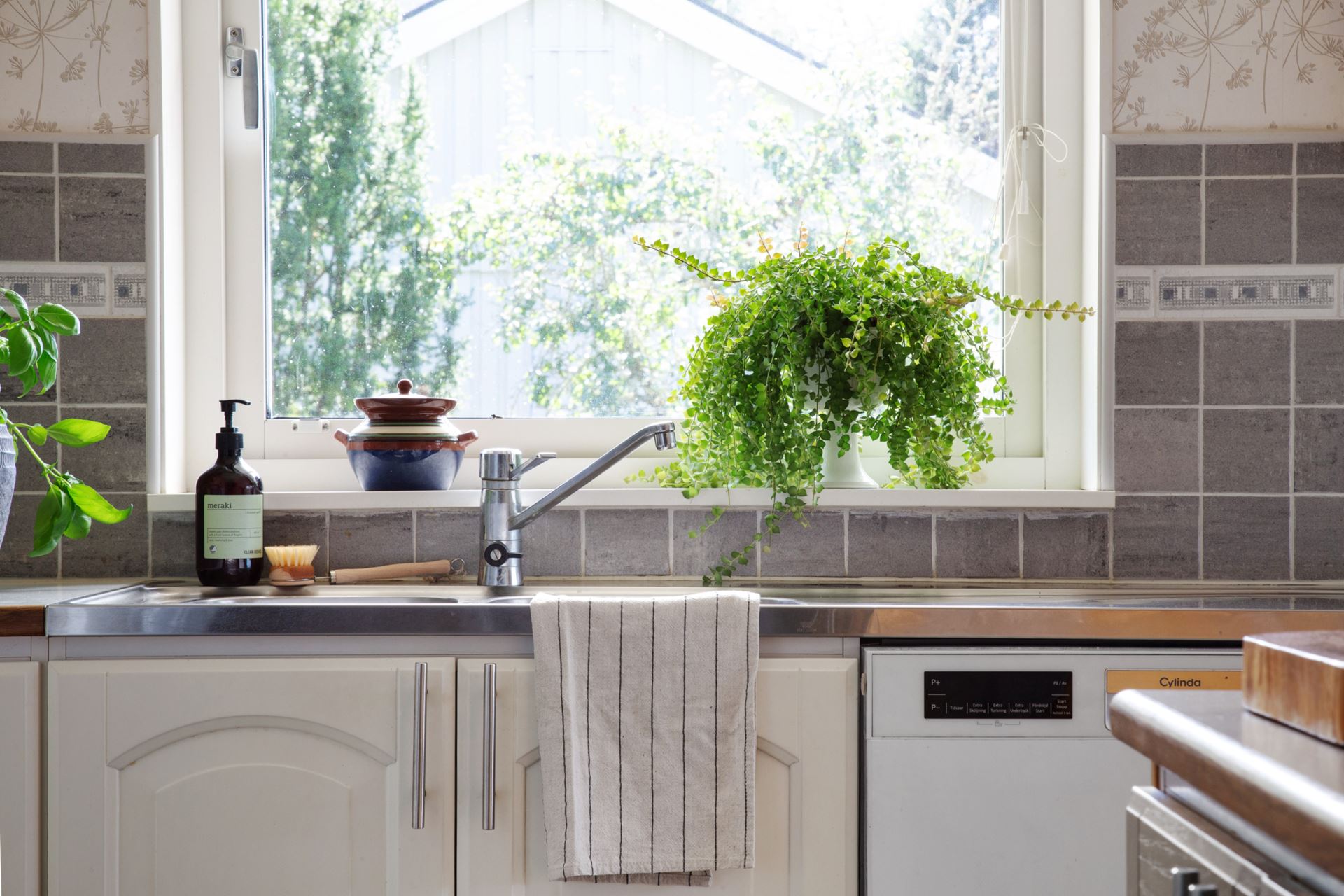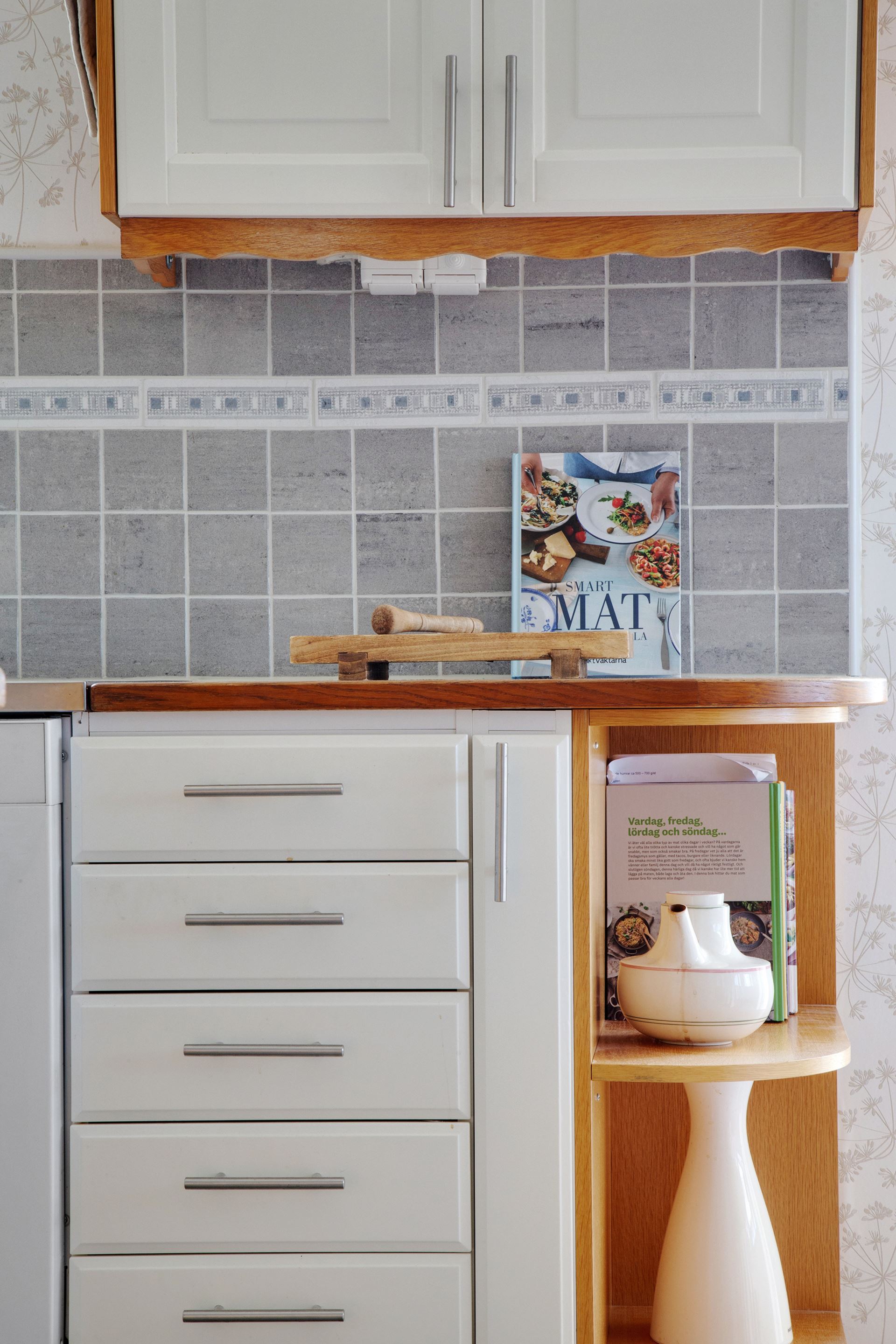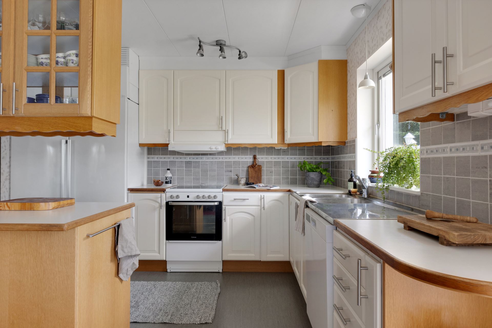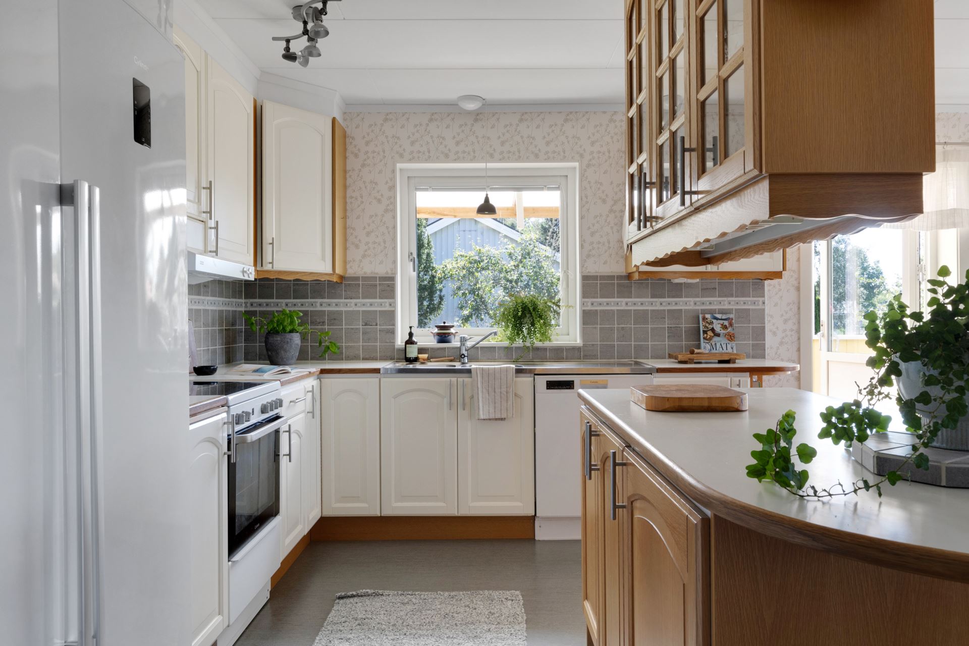 Köket finner du en trappa upp och det är ljust, luftigt och välplanerat, ett rum där vardagens måltider och helgens kaffestunder smälter samman på ett självklart sätt. De vita luckorna i kombination med träramade vitrinskåp ger ett klassiskt och tidlöst uttryck, samtidigt som den grå kakelväggen sätter en diskret och stilren ton. Här finns gott om arbetsyta tack vare en praktisk köksö, och moderna vitvaror i form av spis, ugn, fläkt (2017–2022), kyl, frys och diskmaskin gör köket funktionellt och uppdaterat.