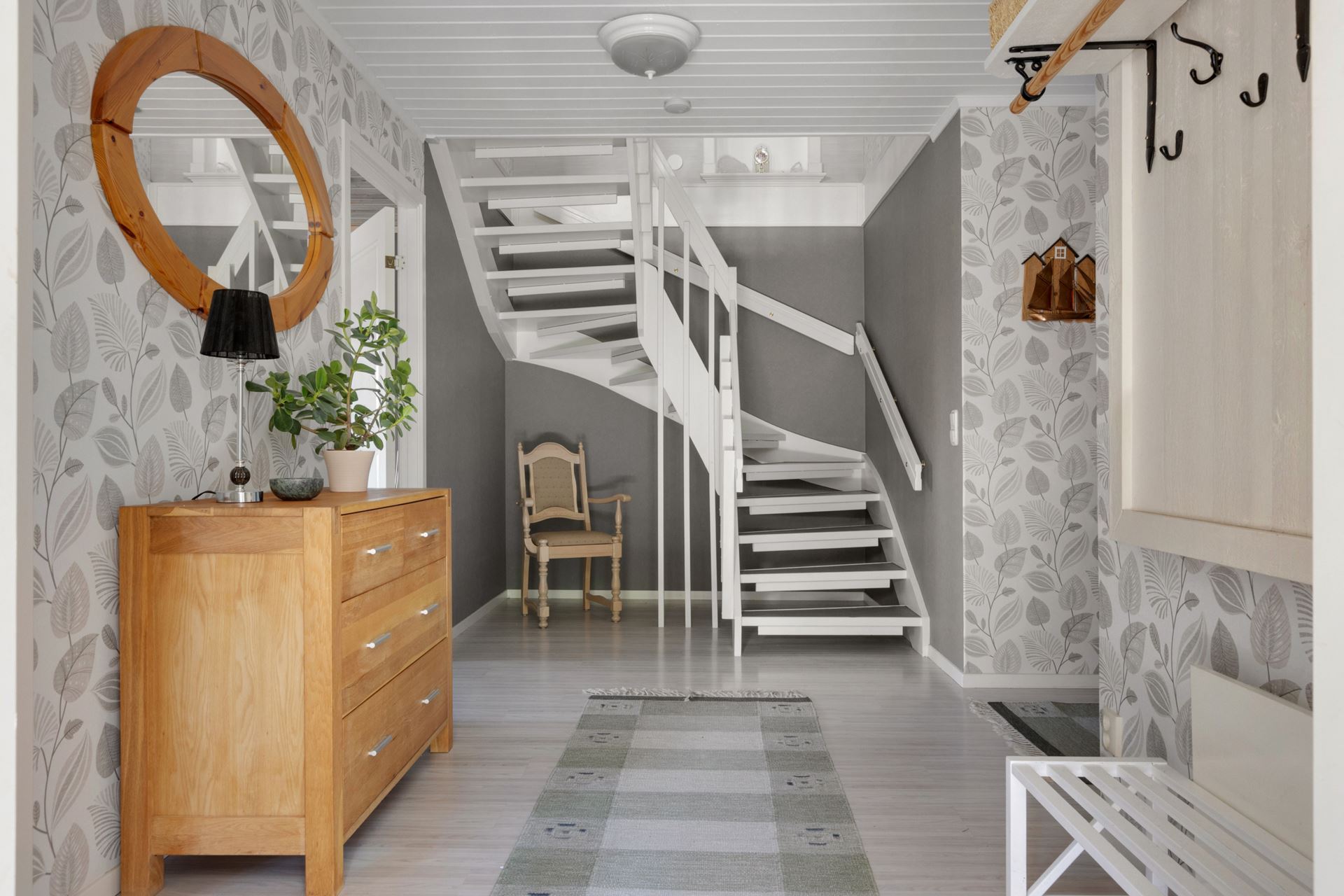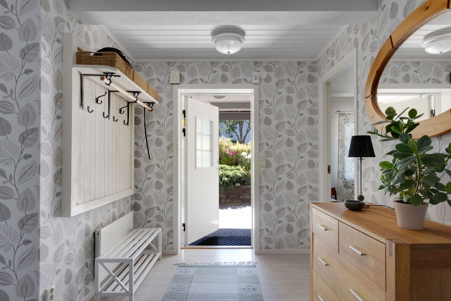 Redan när du kliver in möts du av ett varmt första intryck. Hallen är ljus och välkomnande med tapetserade väggar och ljust laminatgolv. Det finns plats för både avhängning och förvaring, och ett naturligt ljus sipprar in från dörrens glasparti. En hall där vardagen får börja mjukt med utsikt mot grönskan utanför.