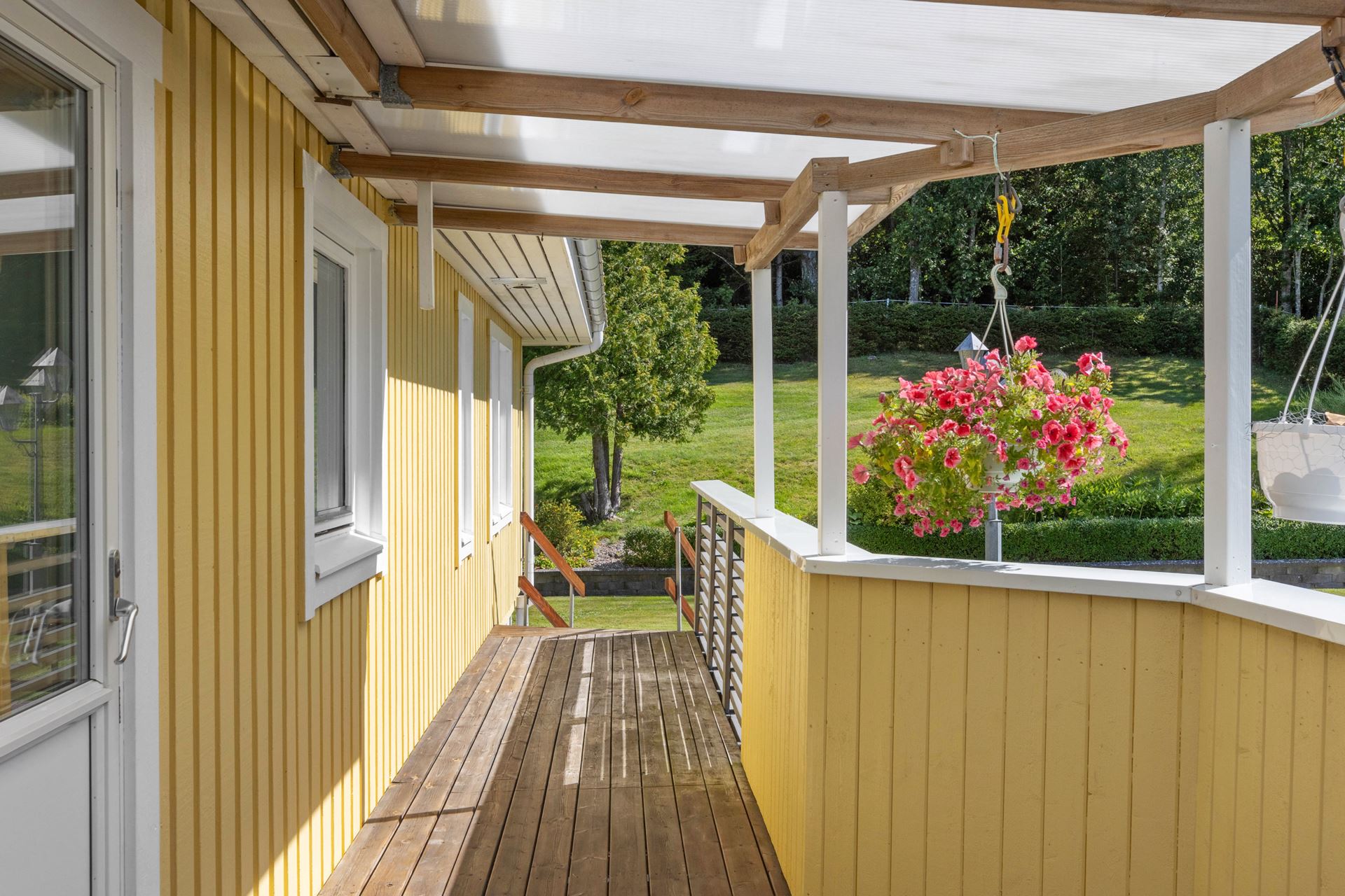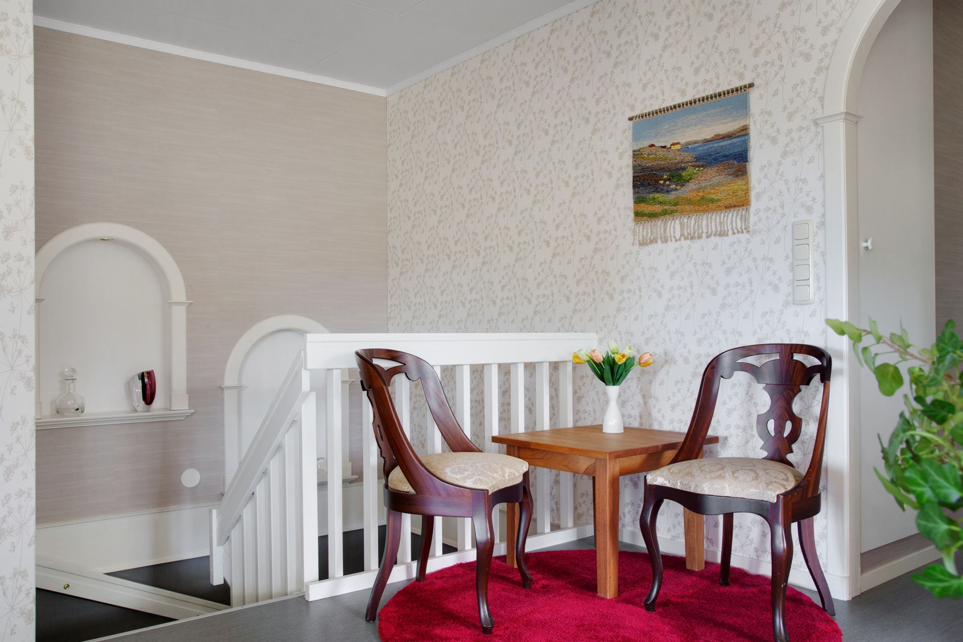 Vidare in på entréplanet breder ett allrum ut sig som är ett flexibelt utrymme med plats för både soffgrupp och matbord. Väggarna är klädda i mjuk tapet och golvet i laminat. Härifrån n uteplatsen som vetter mot tomtens grönska – perfekt för en kopp kaffe i förmiddagssolen eller ett svalkande glas i kvällsbrisen.