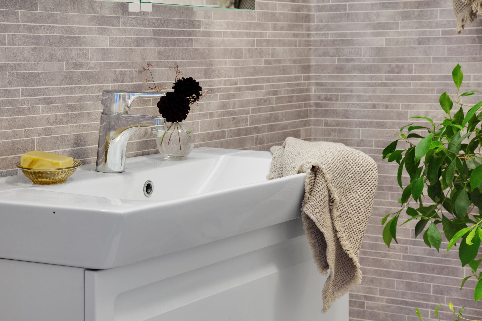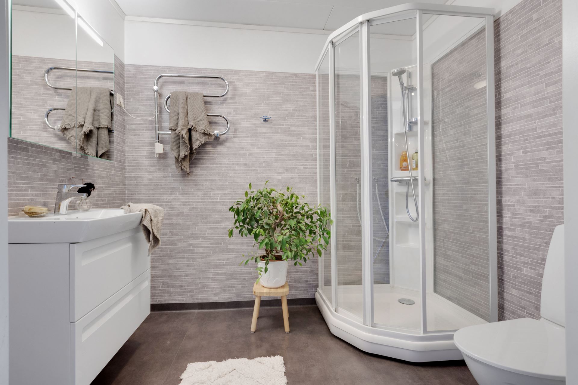 Badrummet på detta plan är renoverat 2013 och upplevs både stilrent och funktionellt. Mörk plastmatta möter ljusa väggar och moderna inredningsdetaljer. Här finns duschhörna, handfat med kommod, spegelskåp, wc samt handdukstork, allt i en genomtänkt och behaglig helhet.