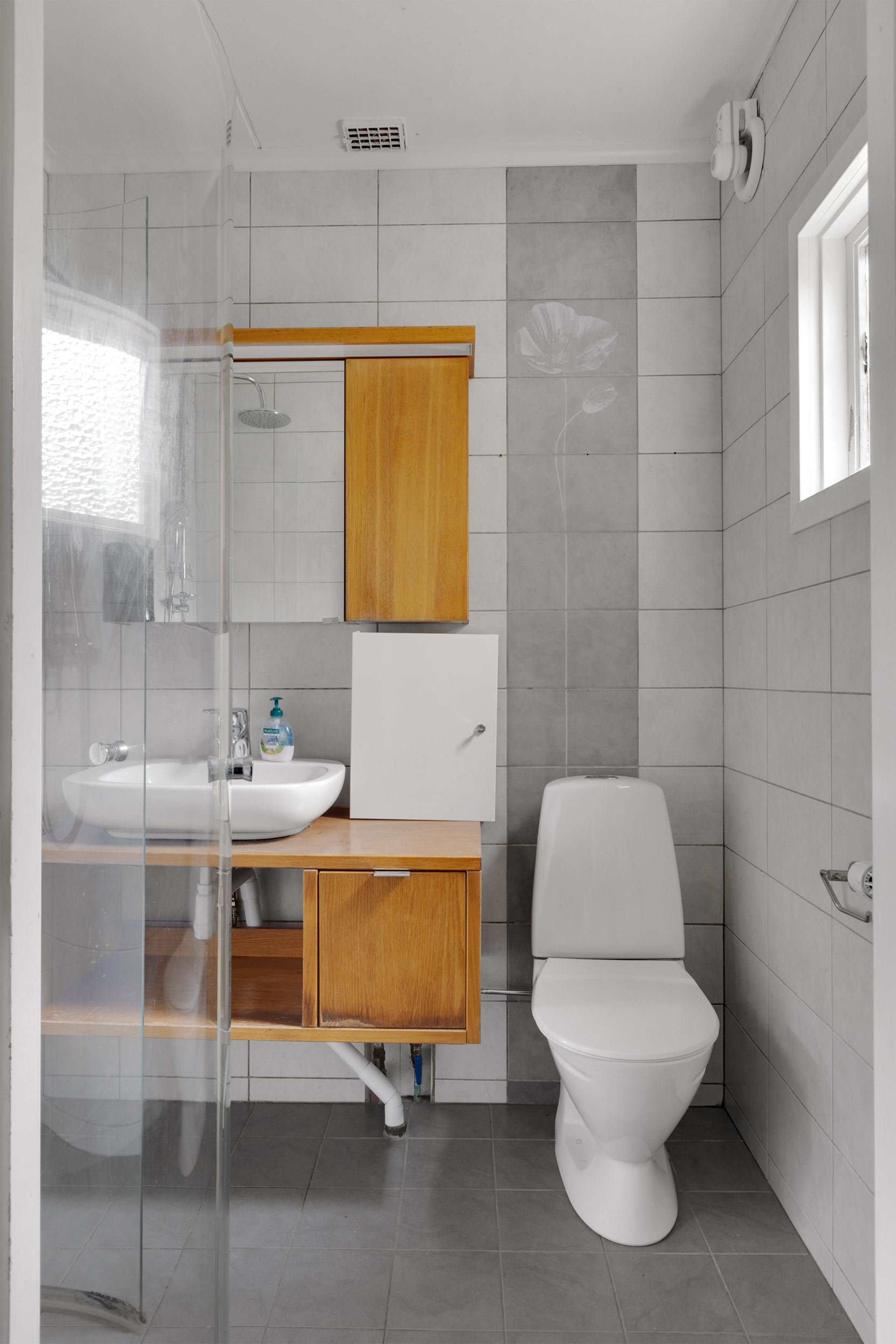 Det helkaklade badrummet är beläget i anslutning till hallen och innehar neutrala färger med dusch, wc, kommod och förvaring. Praktisk duschhörna med glasvägg. Fräscht och funktionellt!