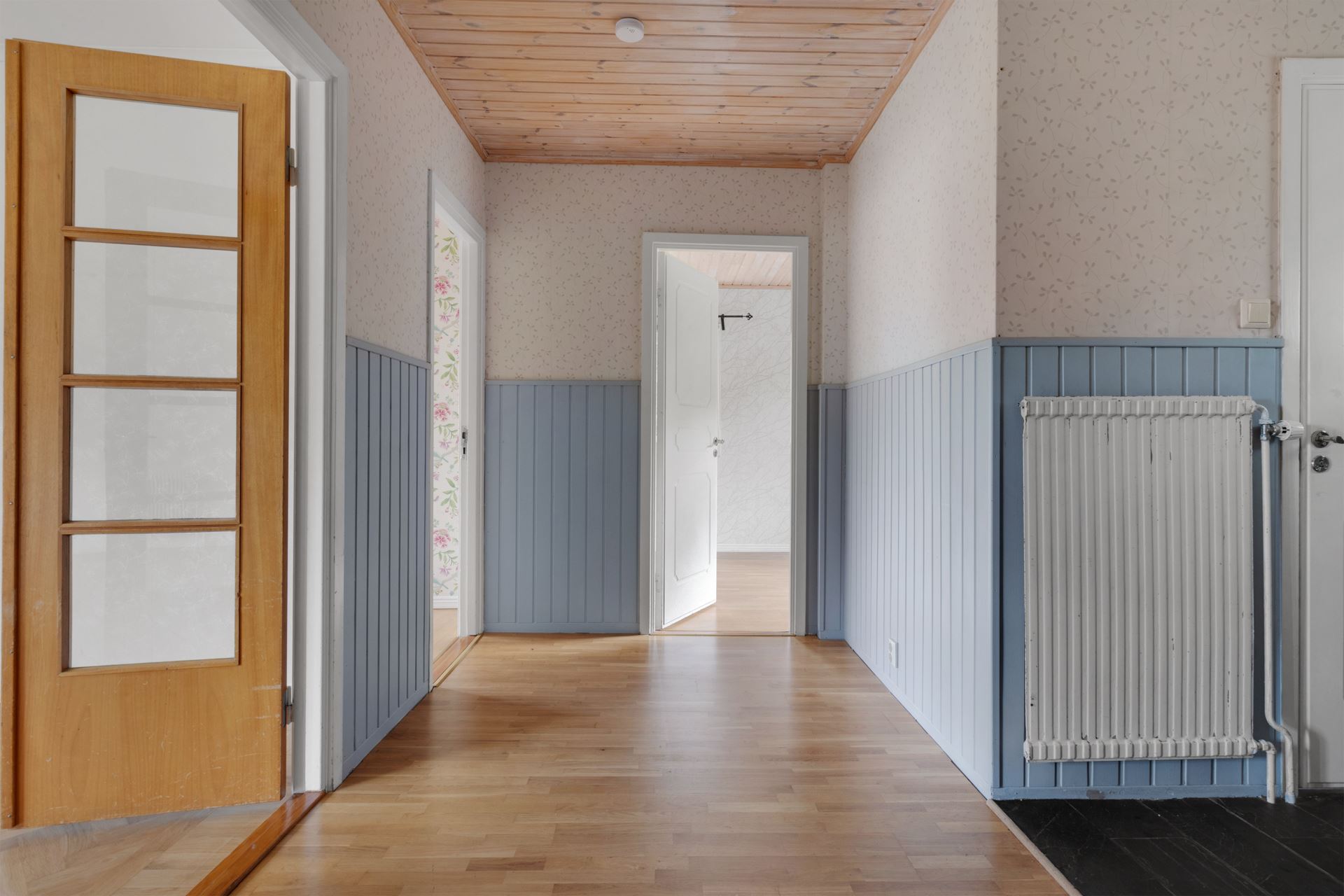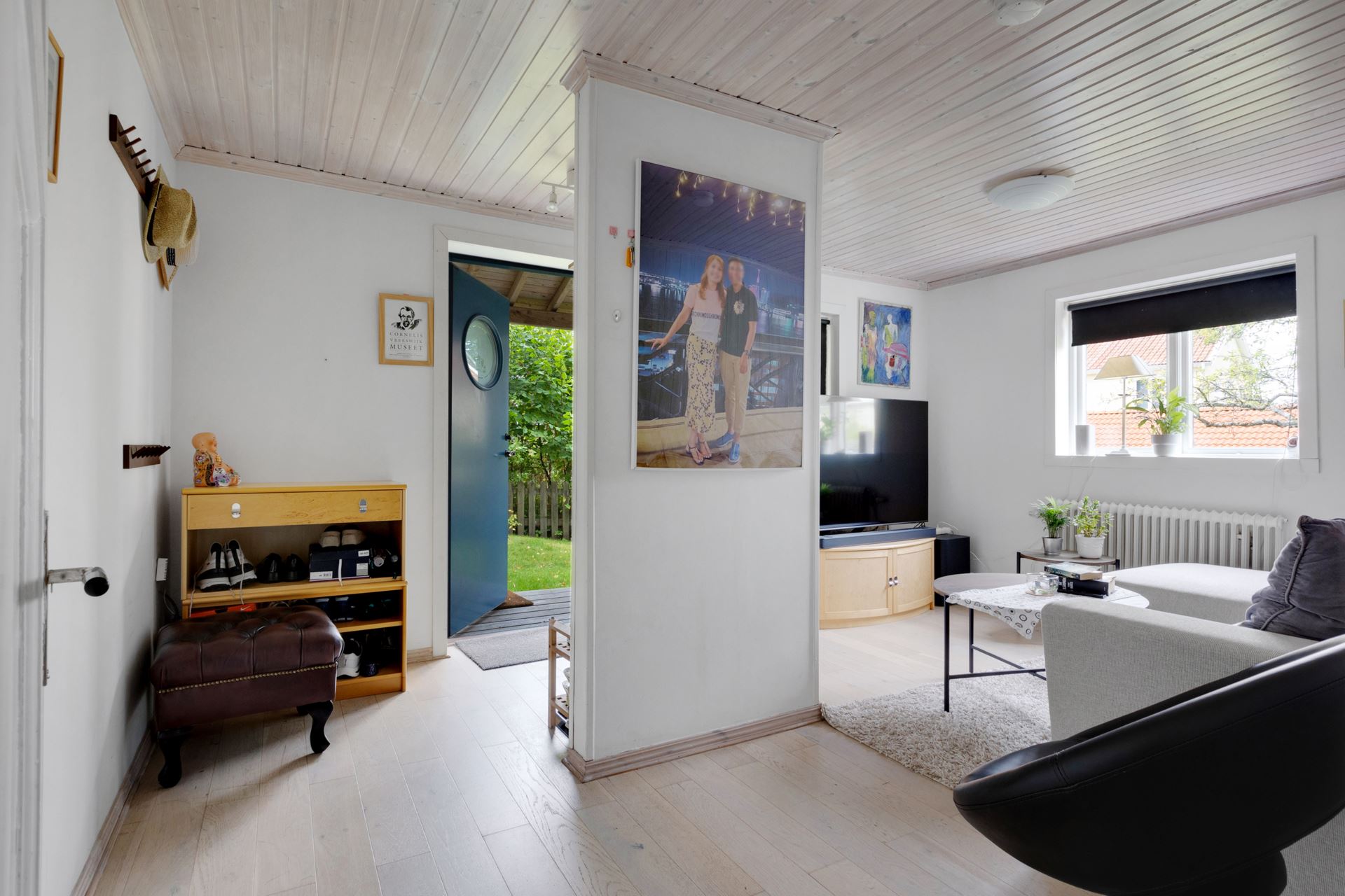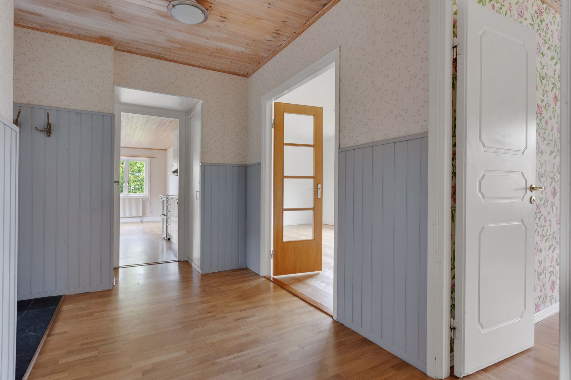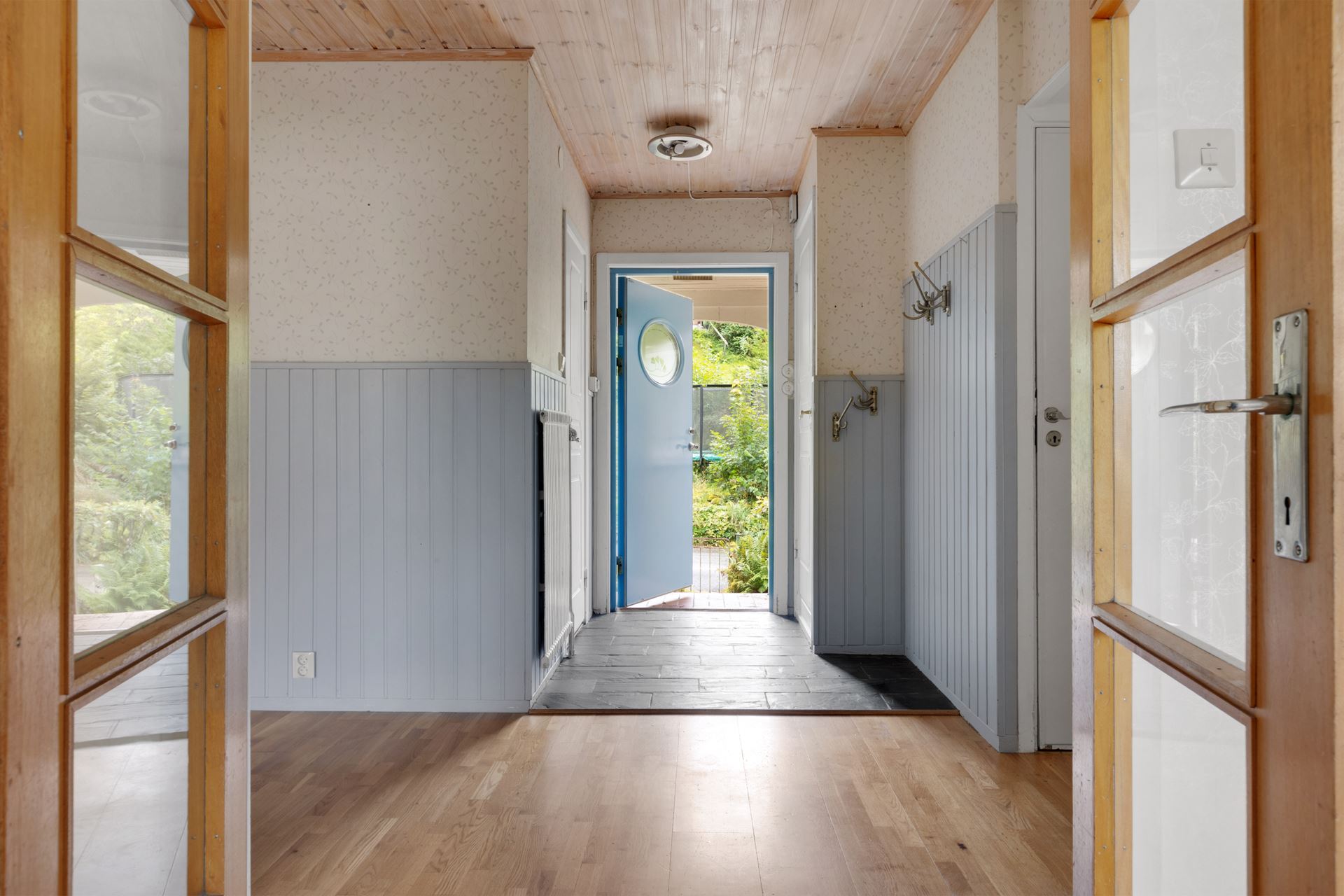 Välkomnande hall med ljusa träinslag i både golv och tak som skapar en varm och inbjudande känsla redan vid första steget in. Väggarna är delvis klädda med liggande panel nedtill och mönstrad tapet upptill, vilket ger hallen en charmig och hemtrevlig karaktär. Här finns plats för avhängning av ytterkläder och gott om naturligt ljus från den öppna ytterdörren med runt fönster.