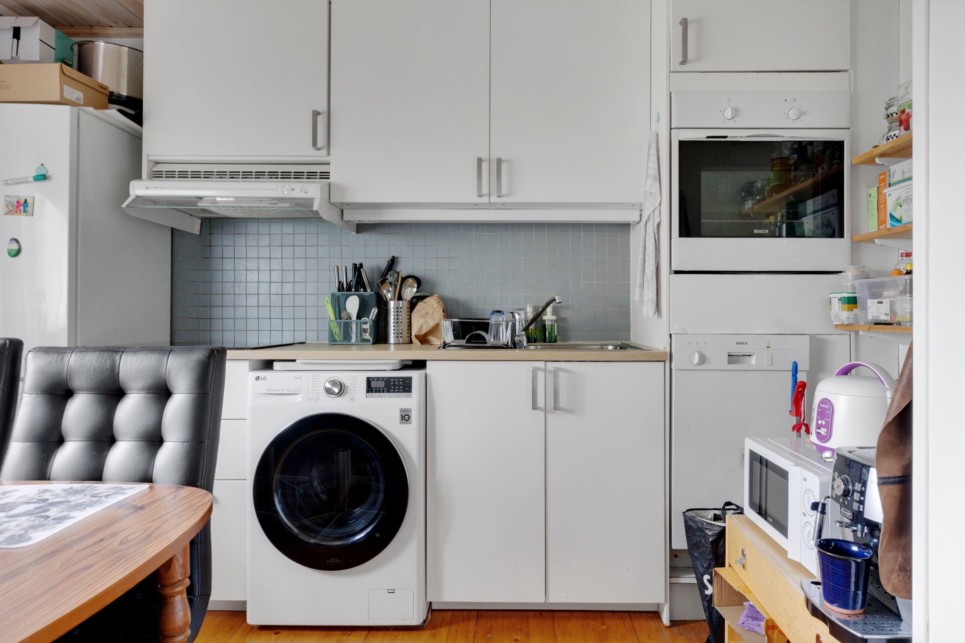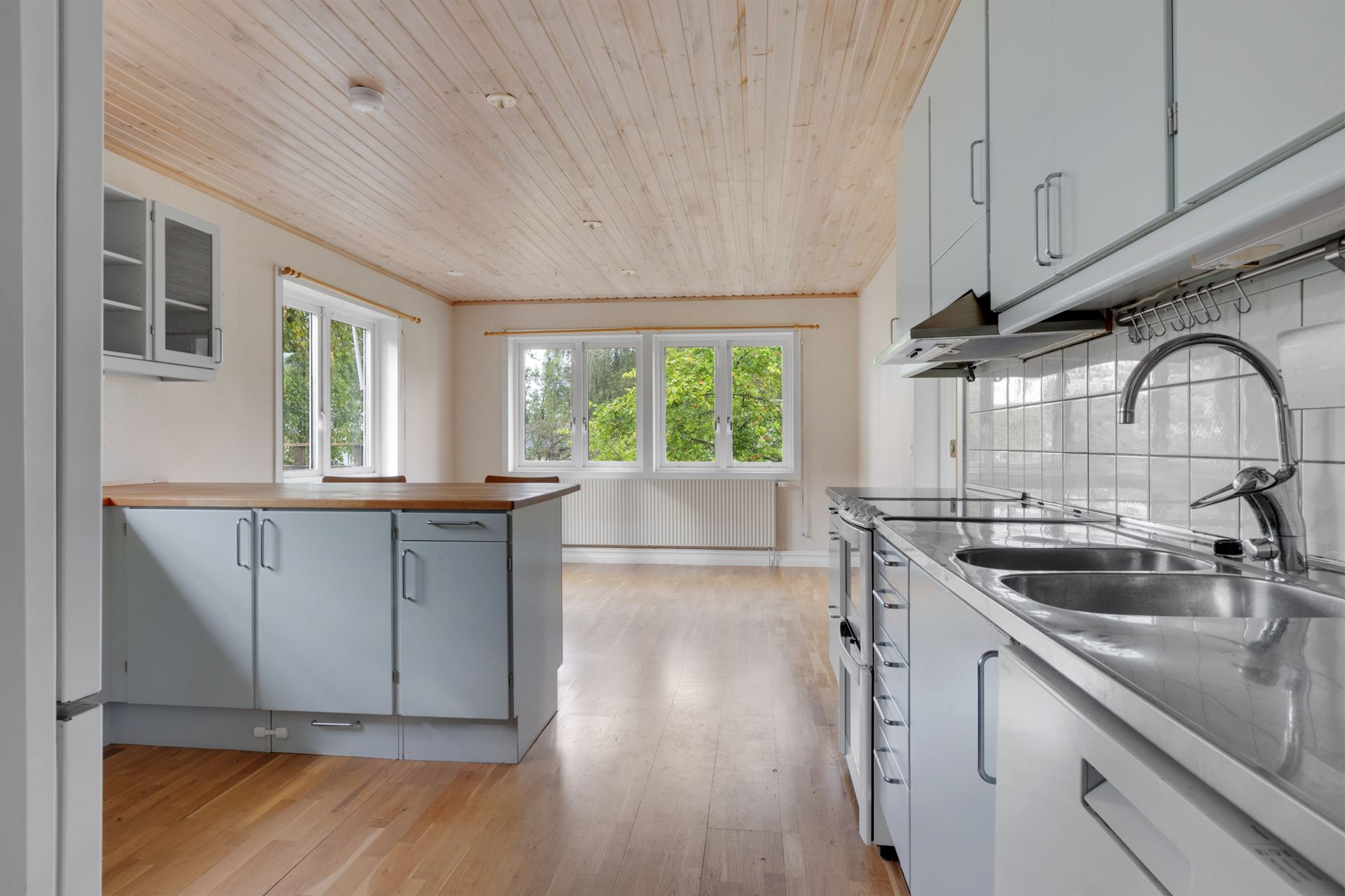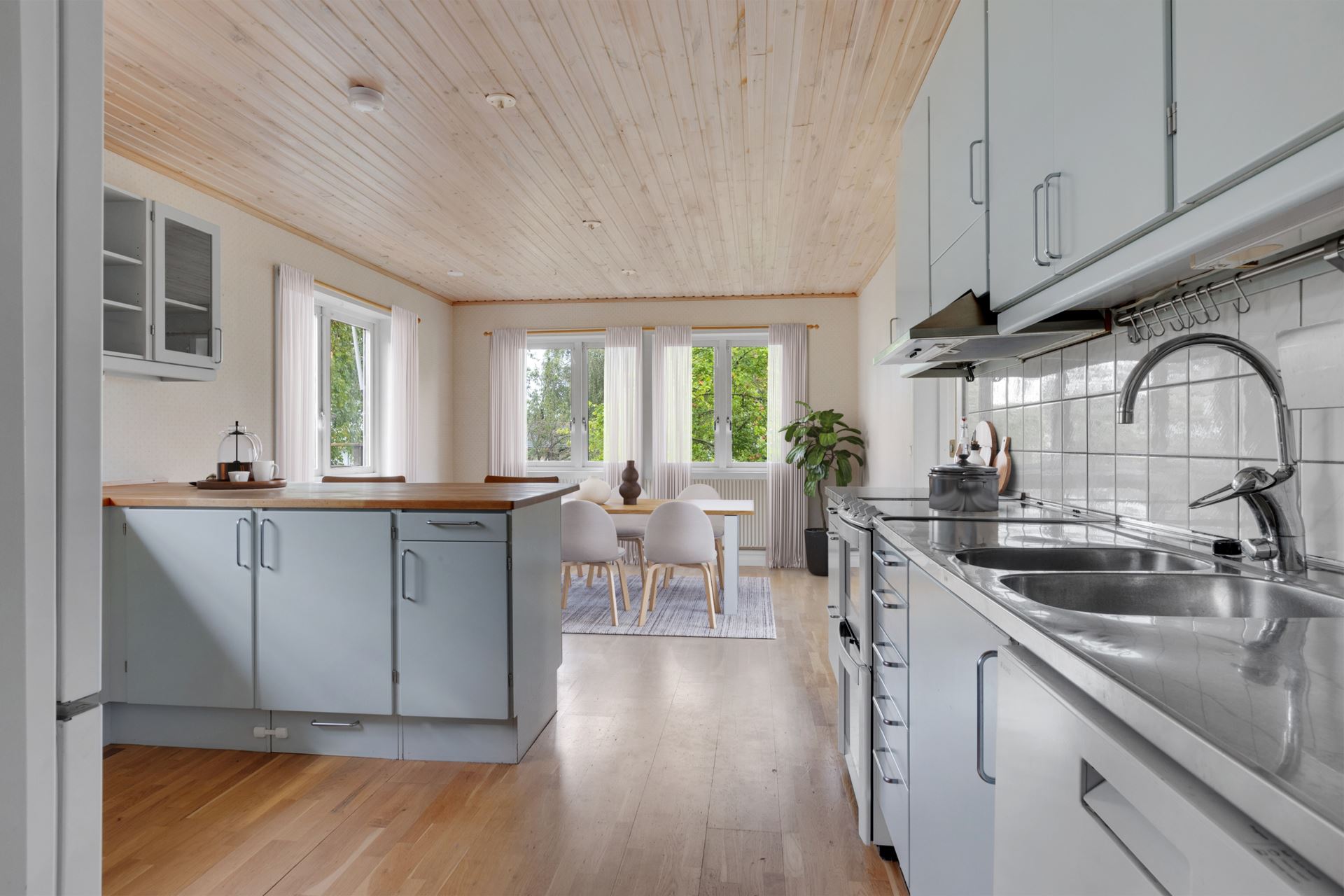 Stort, praktiskt och charmigt kök med gott om arbetsyta och förvaring. Köksluckorna målades om 2018i en harmonisk ton och generösa bänkskivor i trä som slipades upp 2025. Ljusinsläpp från två håll skapar en härlig atmosfär för både vardagsmatlagning och sociala middagar. Rummet har öppen planlösning mot matplats vilket ger en luftig känsla.