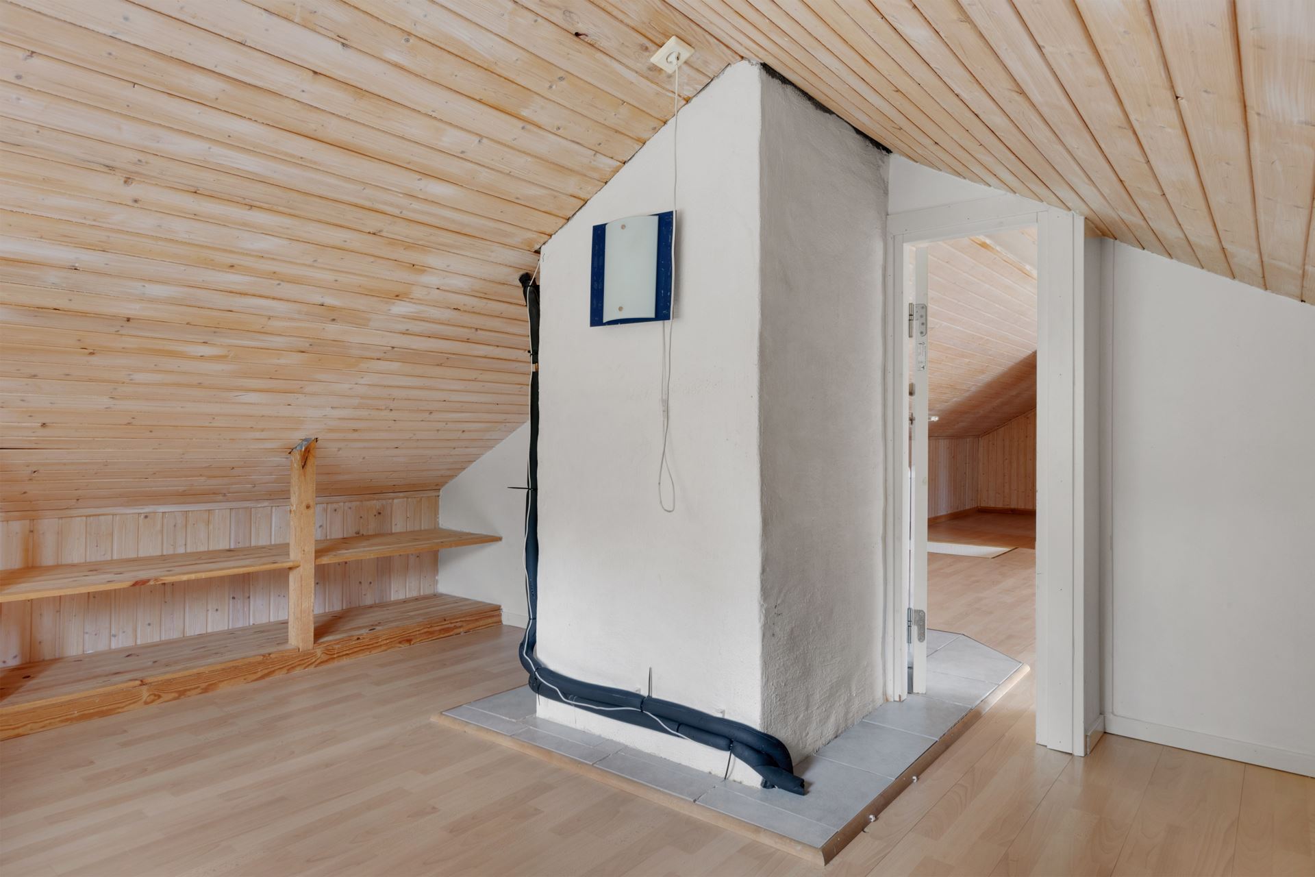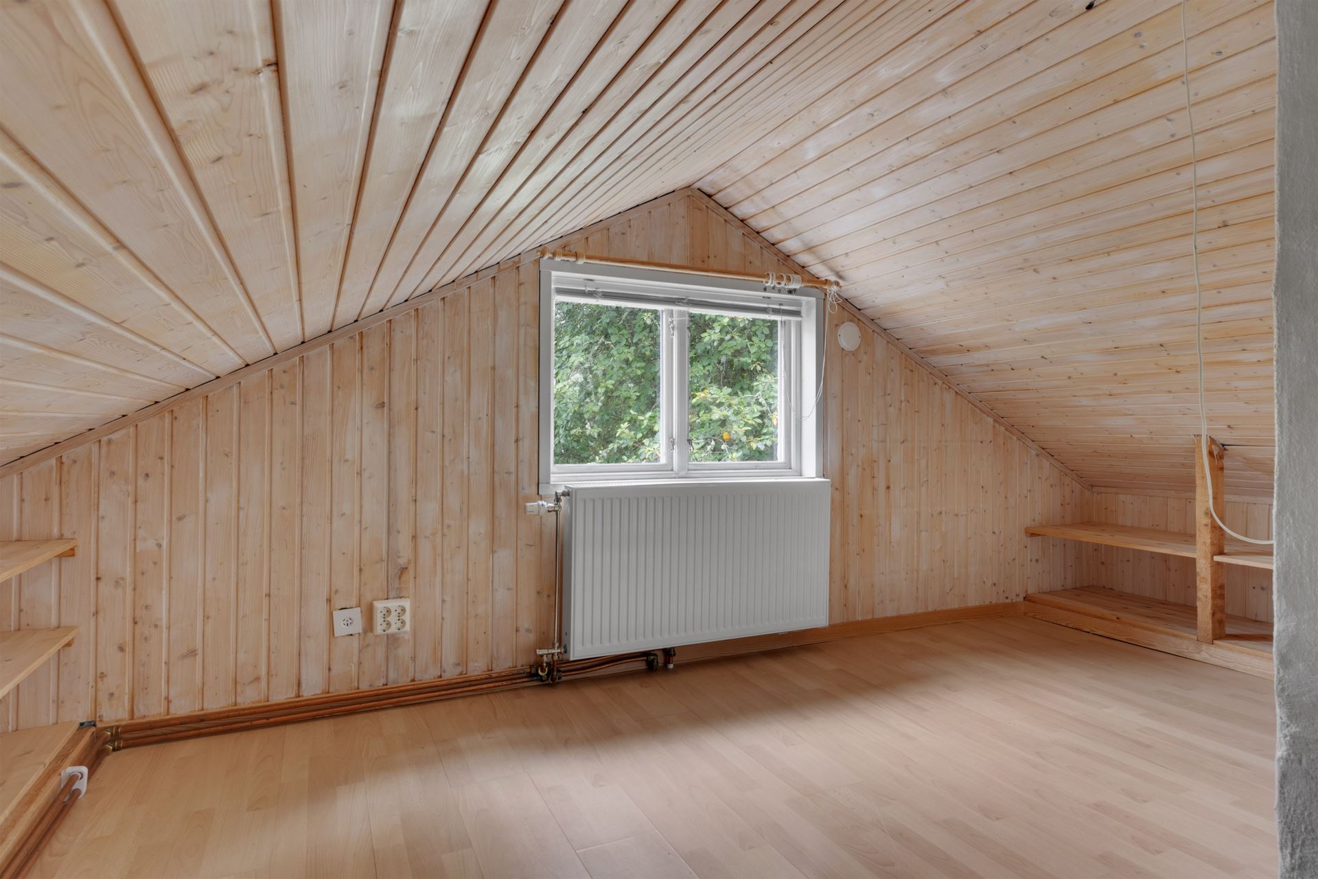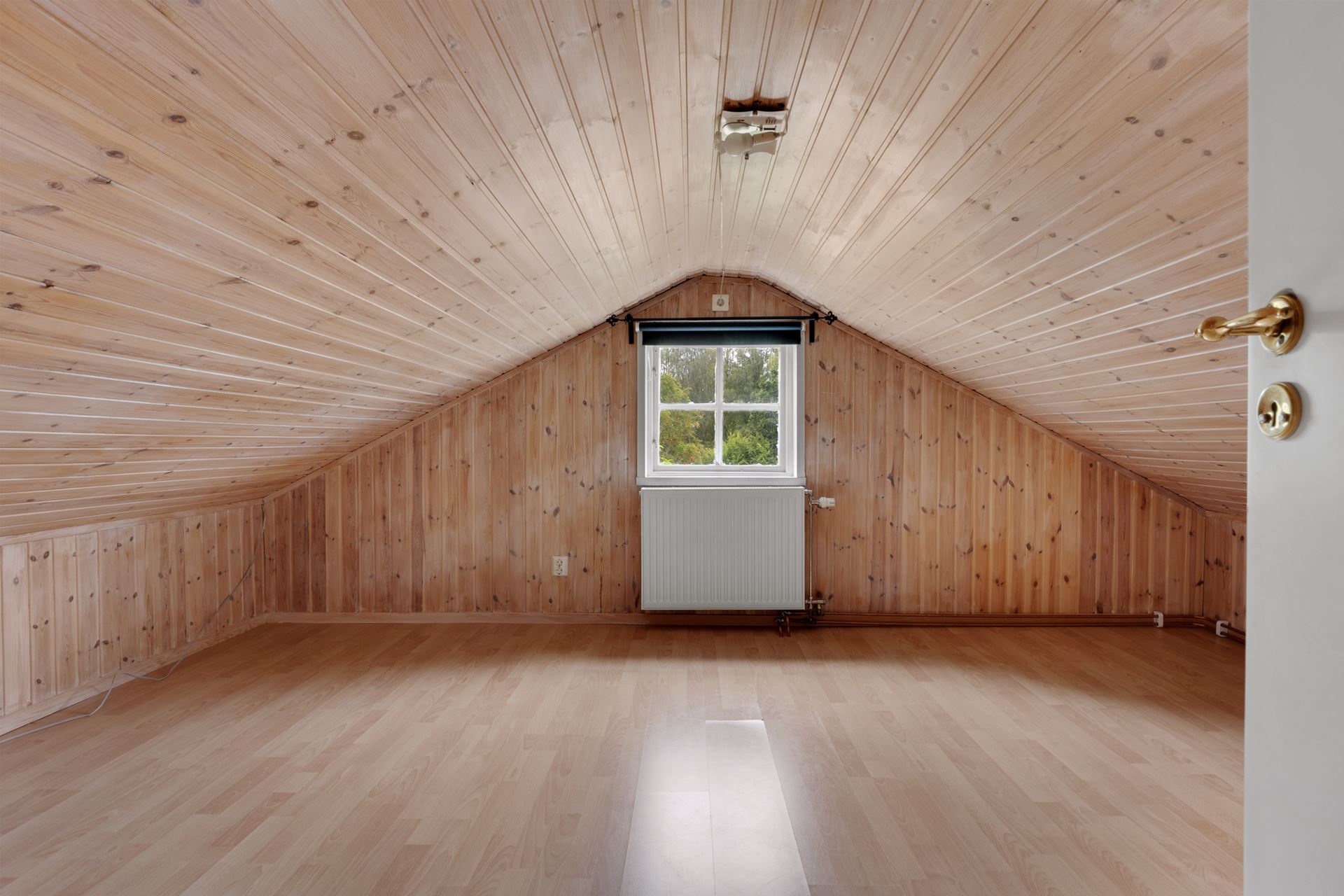 Vindsplanet är inrett och erbjuder hela 66 m² golvyta som, trots att det inte räknas in i den officiella boarean på grund av takhöjden, adderar stort värde till huset. Här finns två separata rum samt ett öppet allrum, alla med charmig snedtakskänsla och panelklädda väggar och tak som skapar en varm, ombonad känsla. Flera fönster släpper in naturligt ljus och gör ytan trivsam att vistas i året runt. Den gedigna täljstenskaminen i allrummet bidrar med både värme och karaktär perfekt under mörkare årstider. Rummen kan med fördel användas som gästrum, kontor, barnens egna krypin eller förvaring. Detta är en plats för både lugn och lek, koncentration och vila. Vindsplanet är lättillgängligt via en fast trappa, vilket gör det till ett naturligt och användbart komplement till hemmets övriga våningsplan.