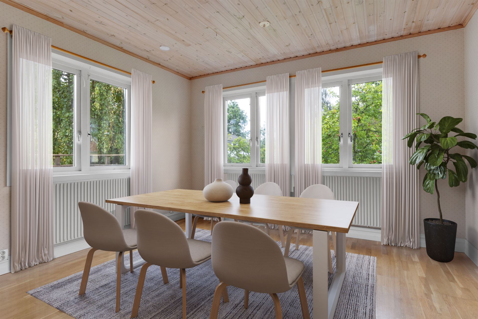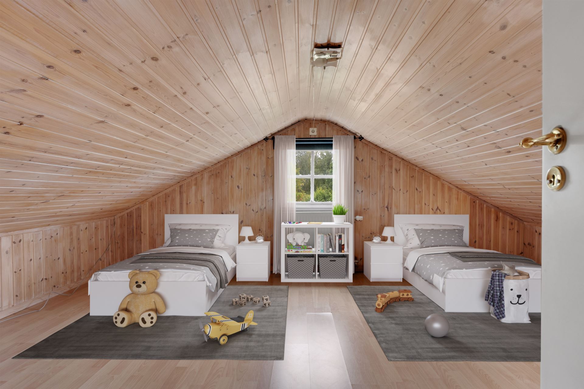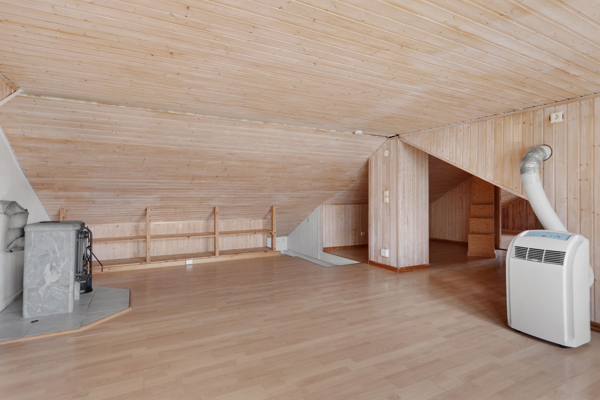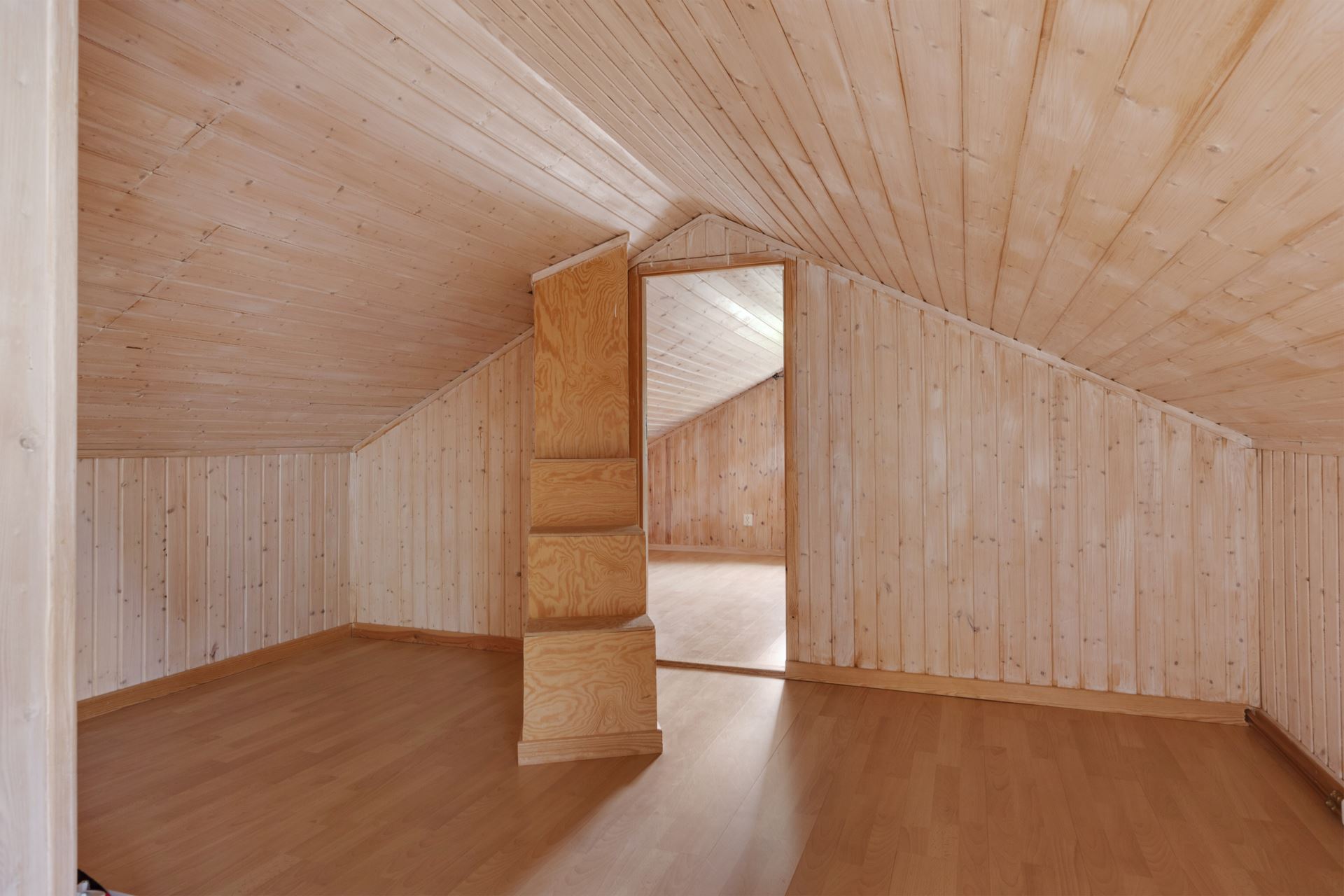 Vindsplanet är inrett och erbjuder hela 66 m² golvyta som, trots att det inte räknas in i den officiella boarean på grund av takhöjden, adderar stort värde till huset. Här finns två separata rum samt ett öppet allrum, alla med charmig snedtakskänsla och panelklädda väggar och tak som skapar en varm, ombonad känsla. Flera fönster släpper in naturligt ljus och gör ytan trivsam att vistas i året runt. Den gedigna täljstenskaminen i allrummet bidrar med både värme och karaktär perfekt under mörkare årstider. Rummen kan med fördel användas som gästrum, kontor, barnens egna krypin eller förvaring. Detta är en plats för både lugn och lek, koncentration och vila. Vindsplanet är lättillgängligt via en fast trappa, vilket gör det till ett naturligt och användbart komplement till hemmets övriga våningsplan.