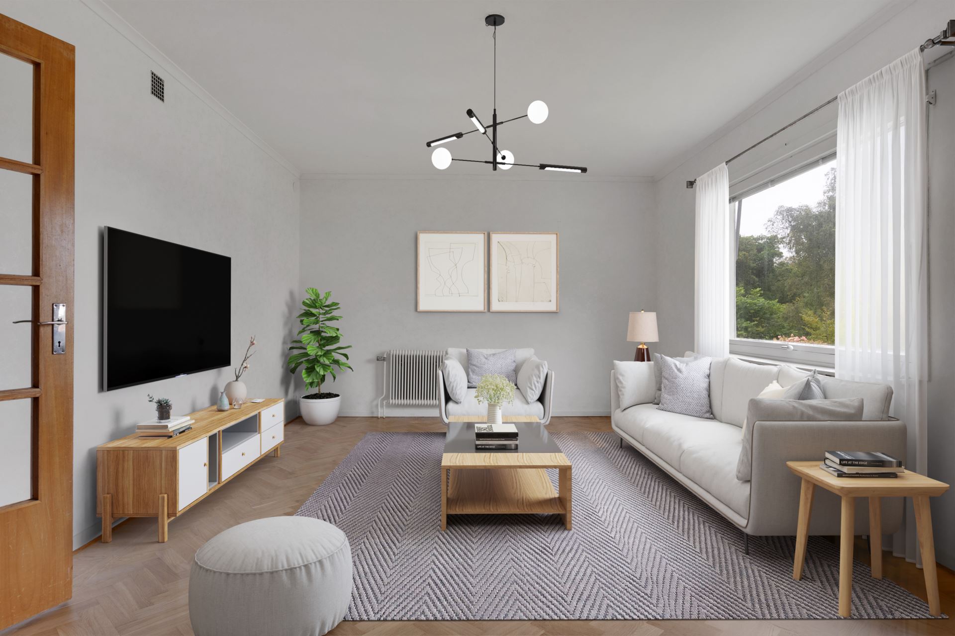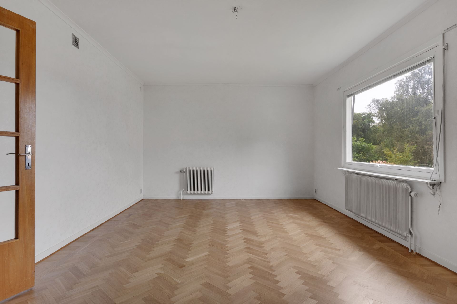 Rakt in genom hallen så öppnar vardagsrummet upp sig med golv i elegant stavparkett som slipades upp 2025 och skapar ett flöde i rummet. Den ljusa tapeten och det härliga ljusinsläppet skapar en rymd i rummet.