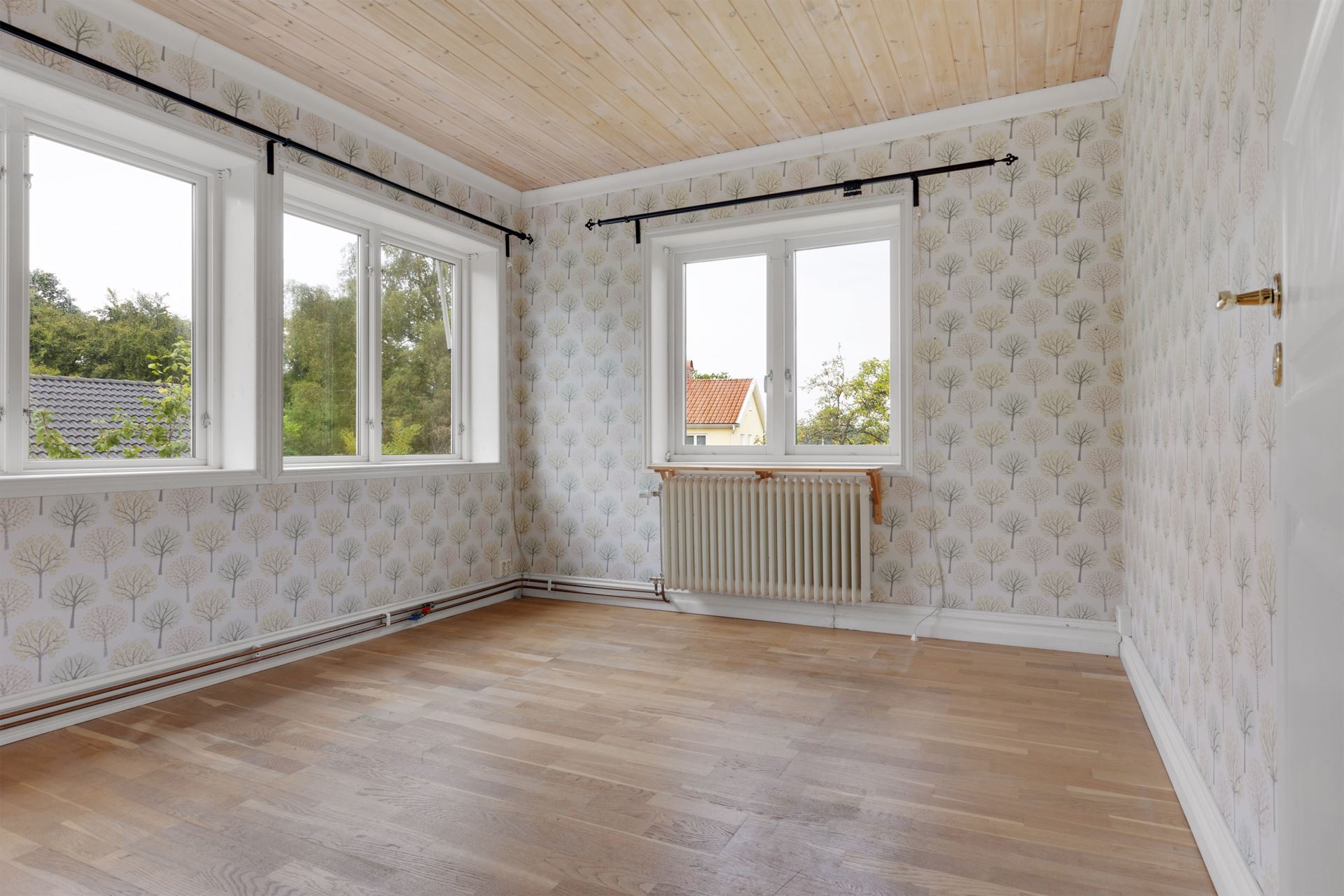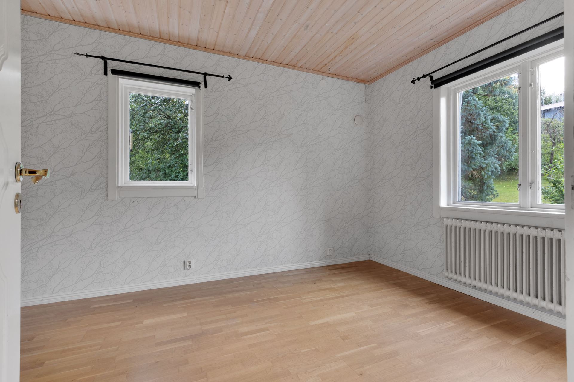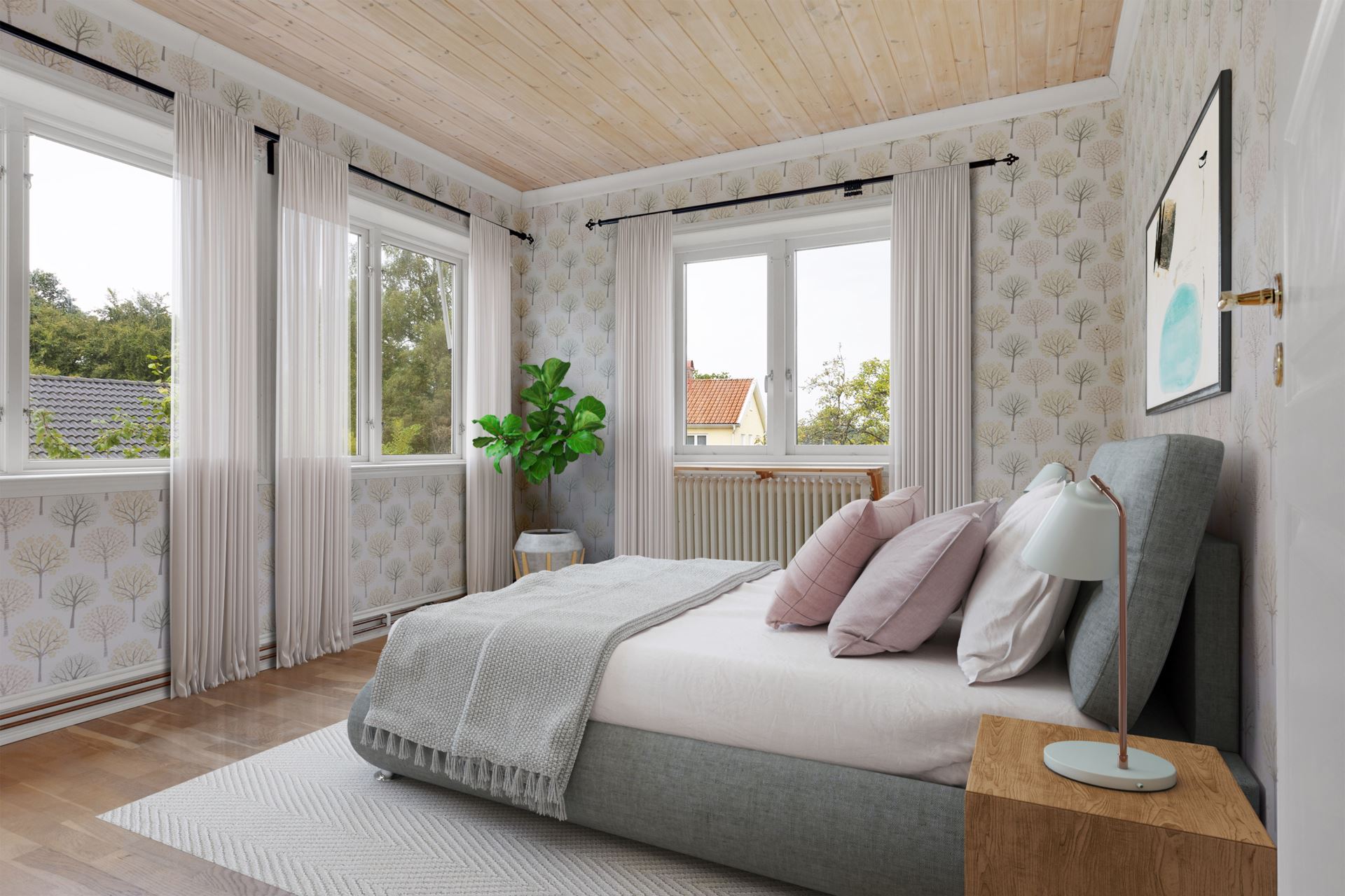 Det sista sovrummet är ett ljust sovrum med två fönster och mjuk mönstrad tapet. Ett flexibelt rum för gäster, barn eller kontor. Med fönster i två väderstreck så skapar det ett härligt ljusflöde i rummet.