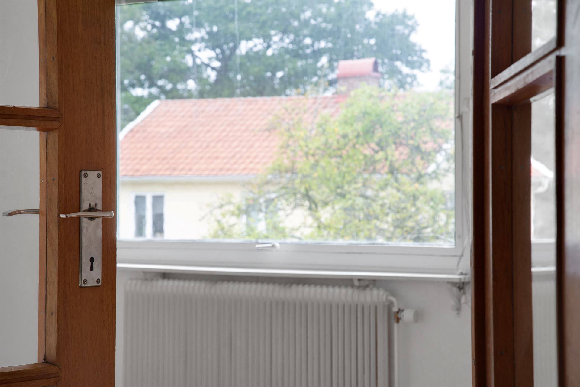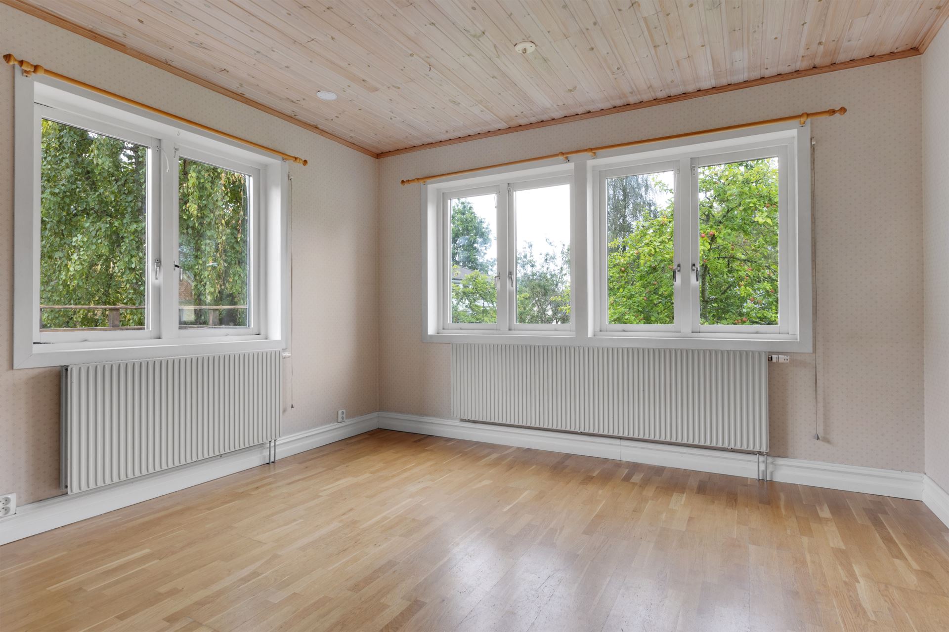 Förbi köket så når ni bostadens första sovrum. Sovrummet är rymligt med fönster åt två håll, ljusa väggar med trädtapet, parkett på golvet och fint ljusinsläpp. Perfekt som master bedroom eller föräldrasovrum.