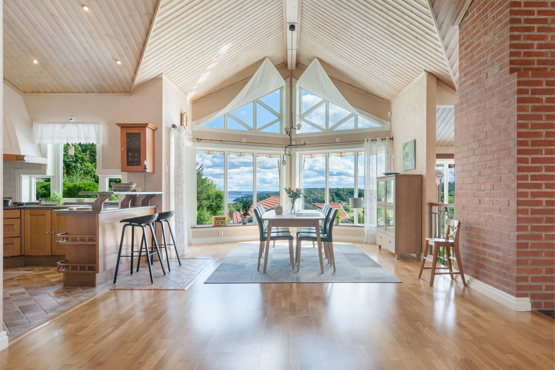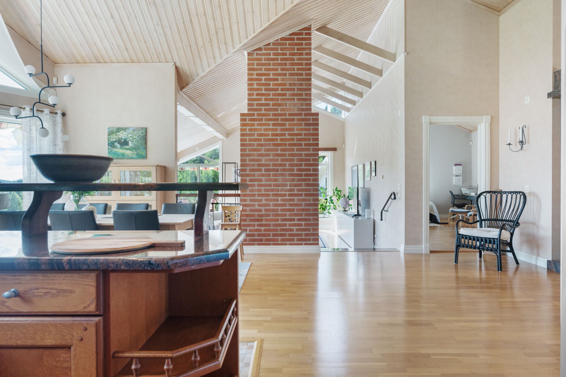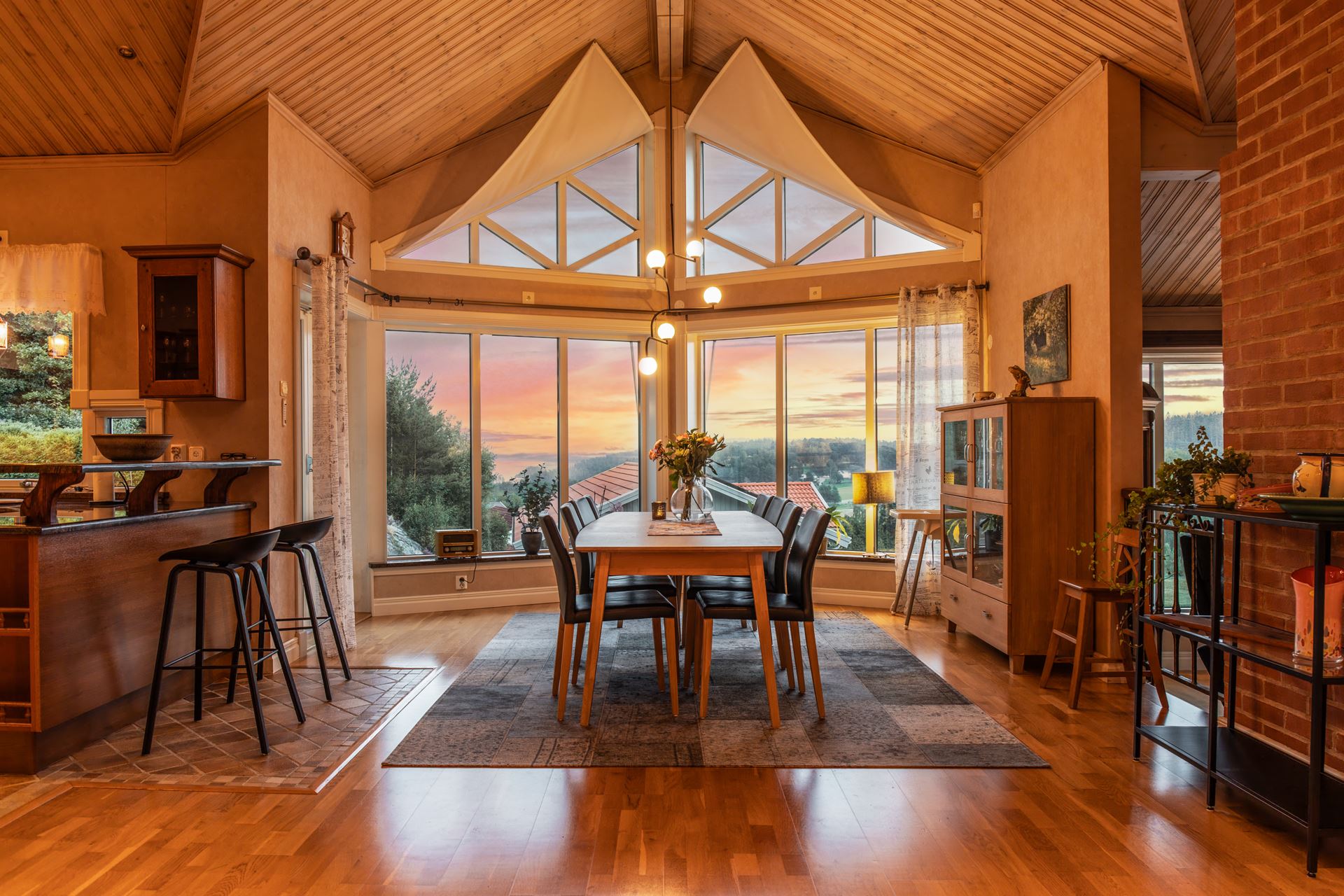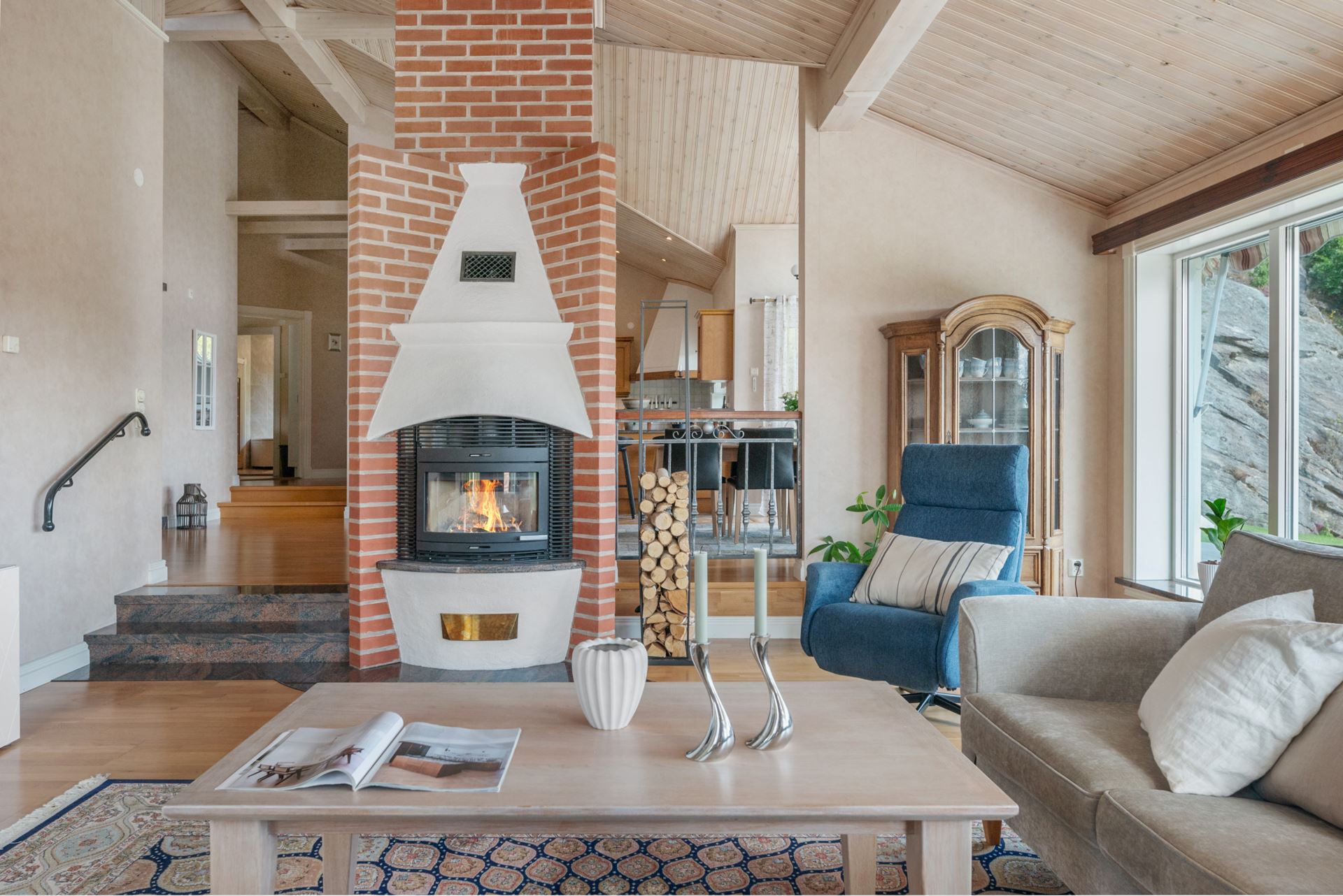 Vardagsrummet är en ljus och generös samlingspunkt där rymden och det naturliga ljuset får ta plats. Rummet ligger centralt i huset och ramas in av stora fönsterpartier i tre väderstreck, vilket skapar en öppen känsla och ett vackert ljusflöde under hela dagen. Golvet är i parkett och ytorna är lättmöblerade, oavsett om du vill inreda med en större soffgrupp, läshörna eller ett musik- eller lekområde. Mitt i rummet står en modern braskamin som både värmer och förhöjer atmosfären under årets kyligare månader. Kamininsatsen installerades 2018 och är placerad på ett sätt som gör den till en naturlig mittpunkt. Rummet har kontakt med både matplatsen och köket, vilket gör det till ett självklart nav för umgänge, avkoppling och vardagsliv. Härifrån når du också den stenlagda uteplatsen som har golvvärme, vilket suddar ut gränsen mellan inne och ute under sommarhalvåret.