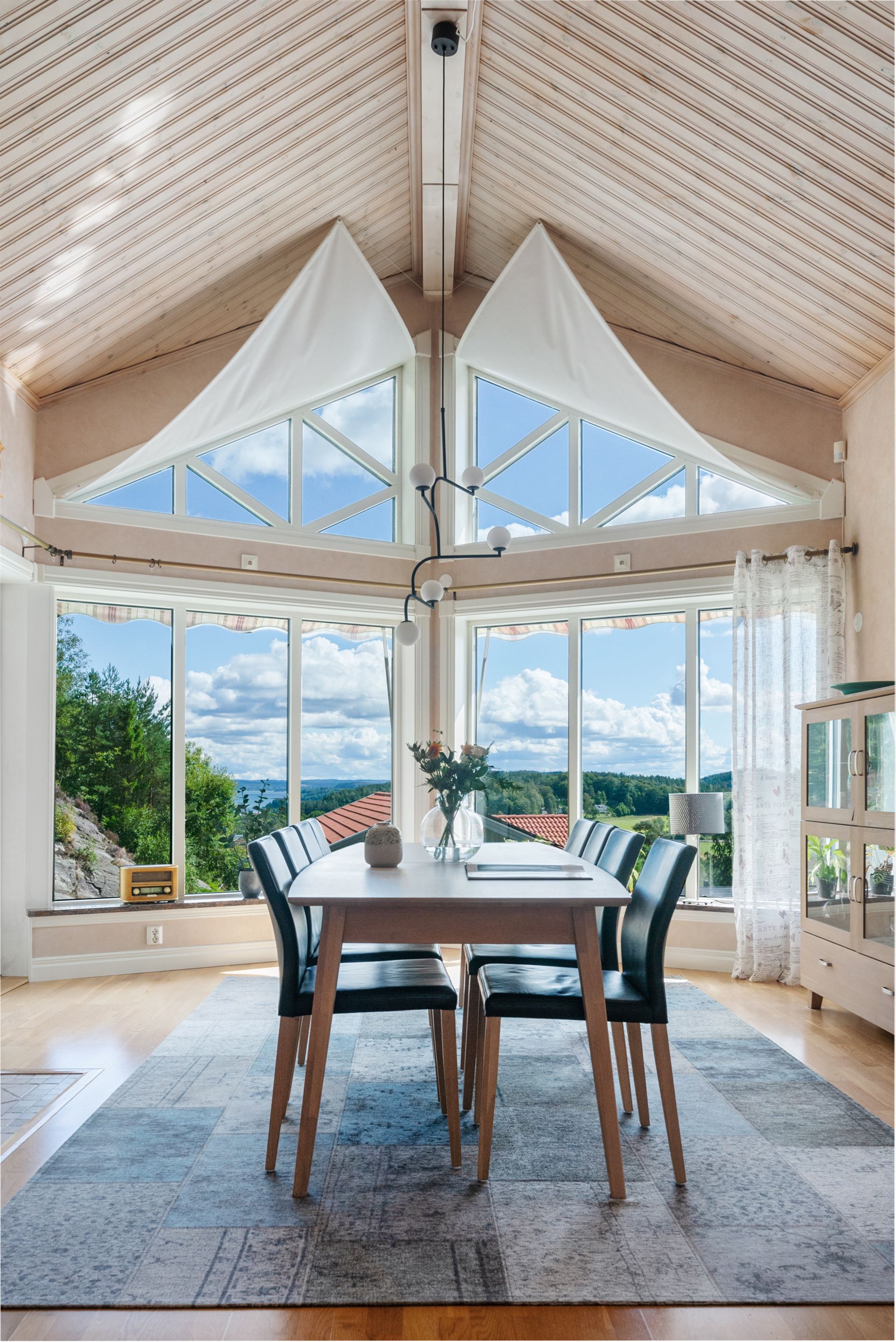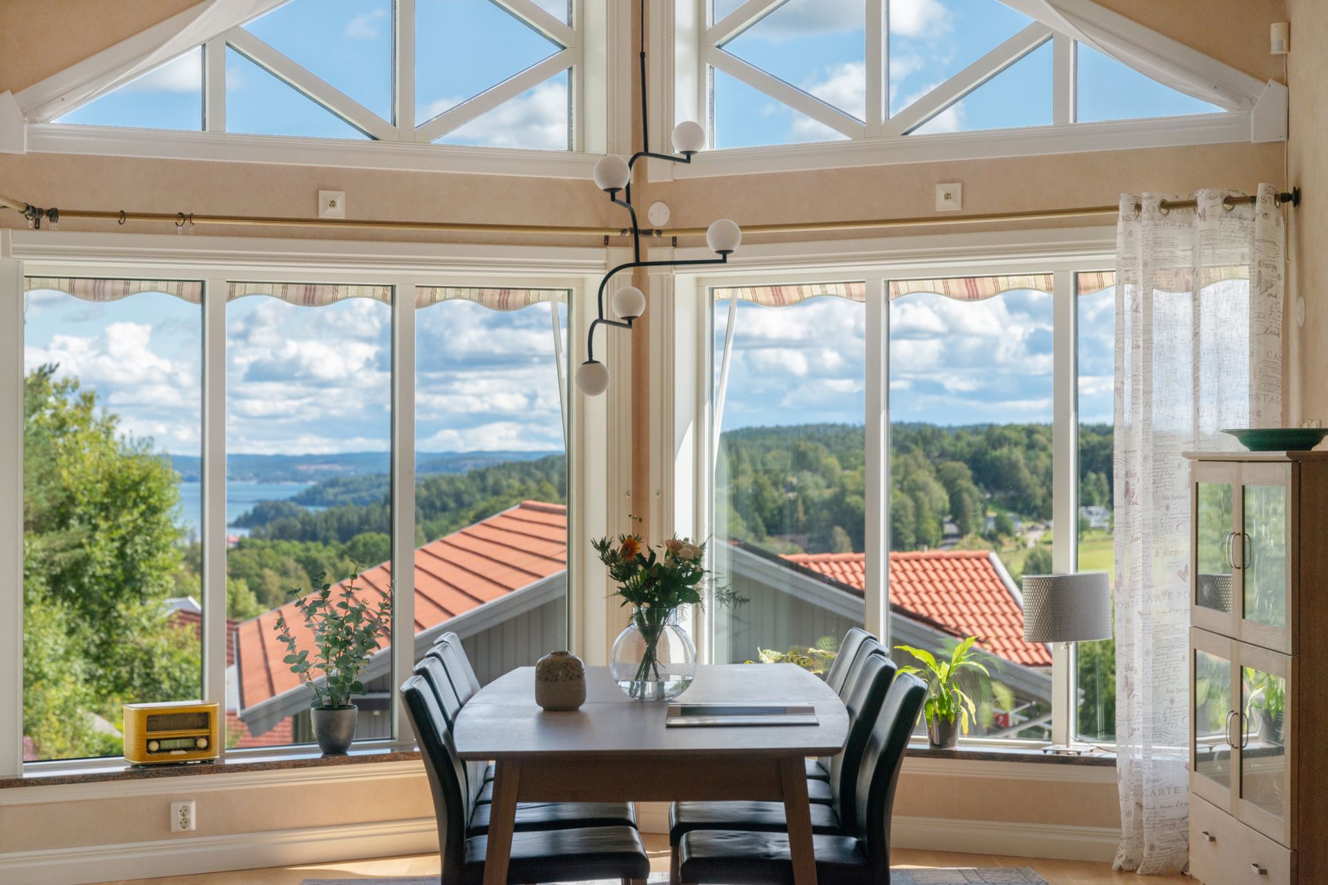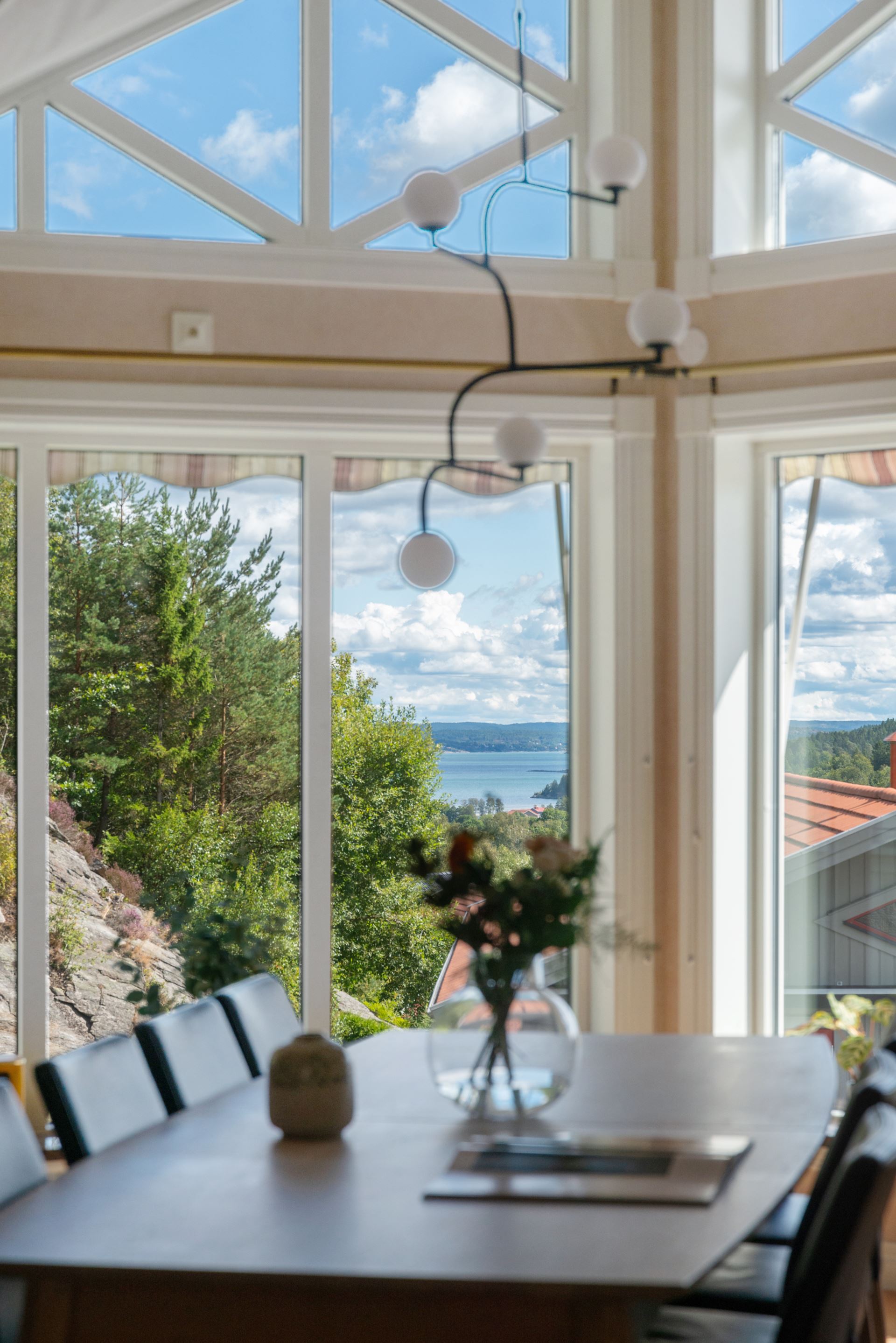 Vardagsrummet är en ljus och generös samlingspunkt där rymden och det naturliga ljuset får ta plats. Rummet ligger centralt i huset och ramas in av stora fönsterpartier i tre väderstreck, vilket skapar en öppen känsla och ett vackert ljusflöde under hela dagen. Golvet är i parkett och ytorna är lättmöblerade, oavsett om du vill inreda med en större soffgrupp, läshörna eller ett musik- eller lekområde. Mitt i rummet står en modern braskamin som både värmer och förhöjer atmosfären under årets kyligare månader. Kamininsatsen installerades 2018 och är placerad på ett sätt som gör den till en naturlig mittpunkt. Rummet har kontakt med både matplatsen och köket, vilket gör det till ett självklart nav för umgänge, avkoppling och vardagsliv. Härifrån når du också den stenlagda uteplatsen som har golvvärme, vilket suddar ut gränsen mellan inne och ute under sommarhalvåret.