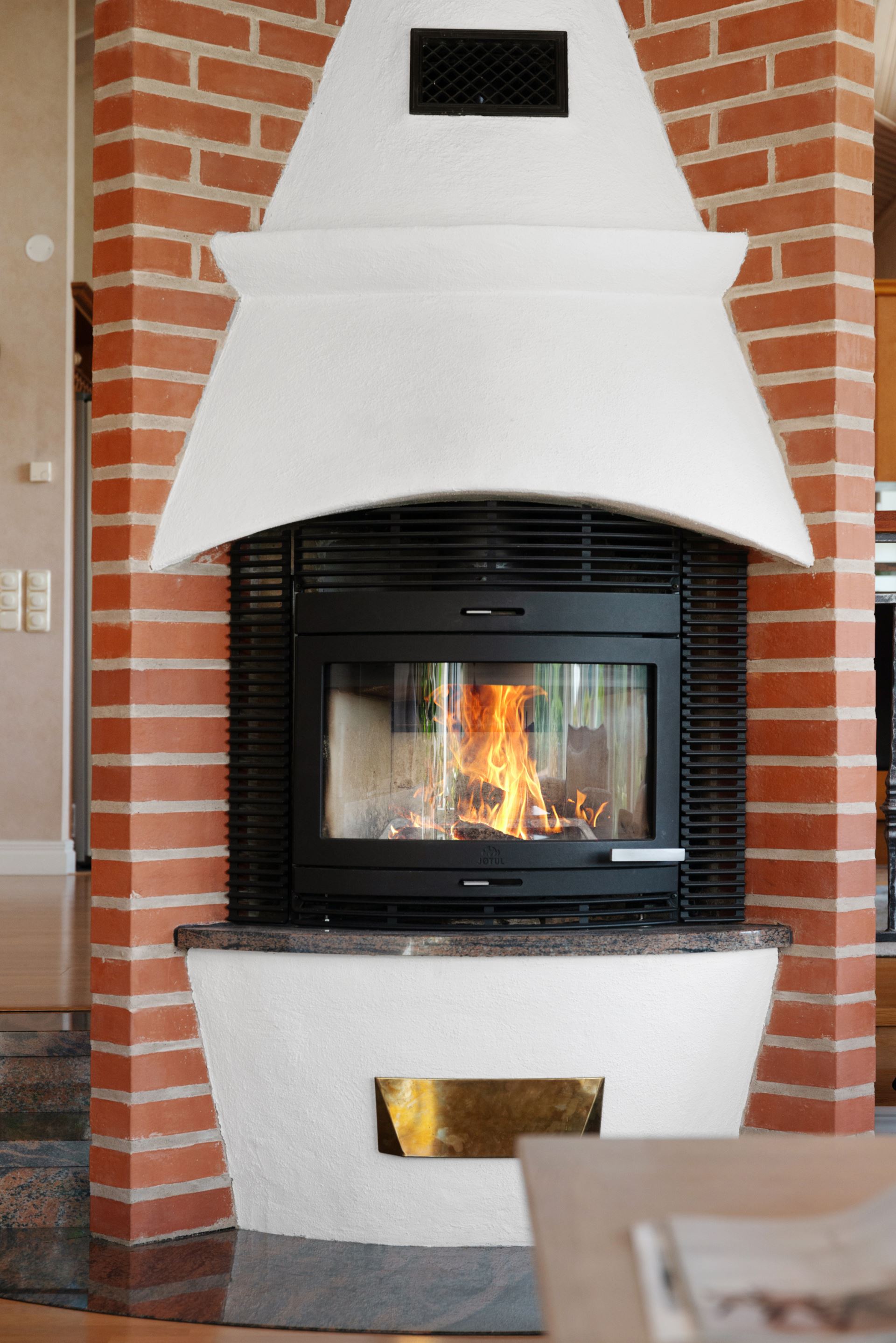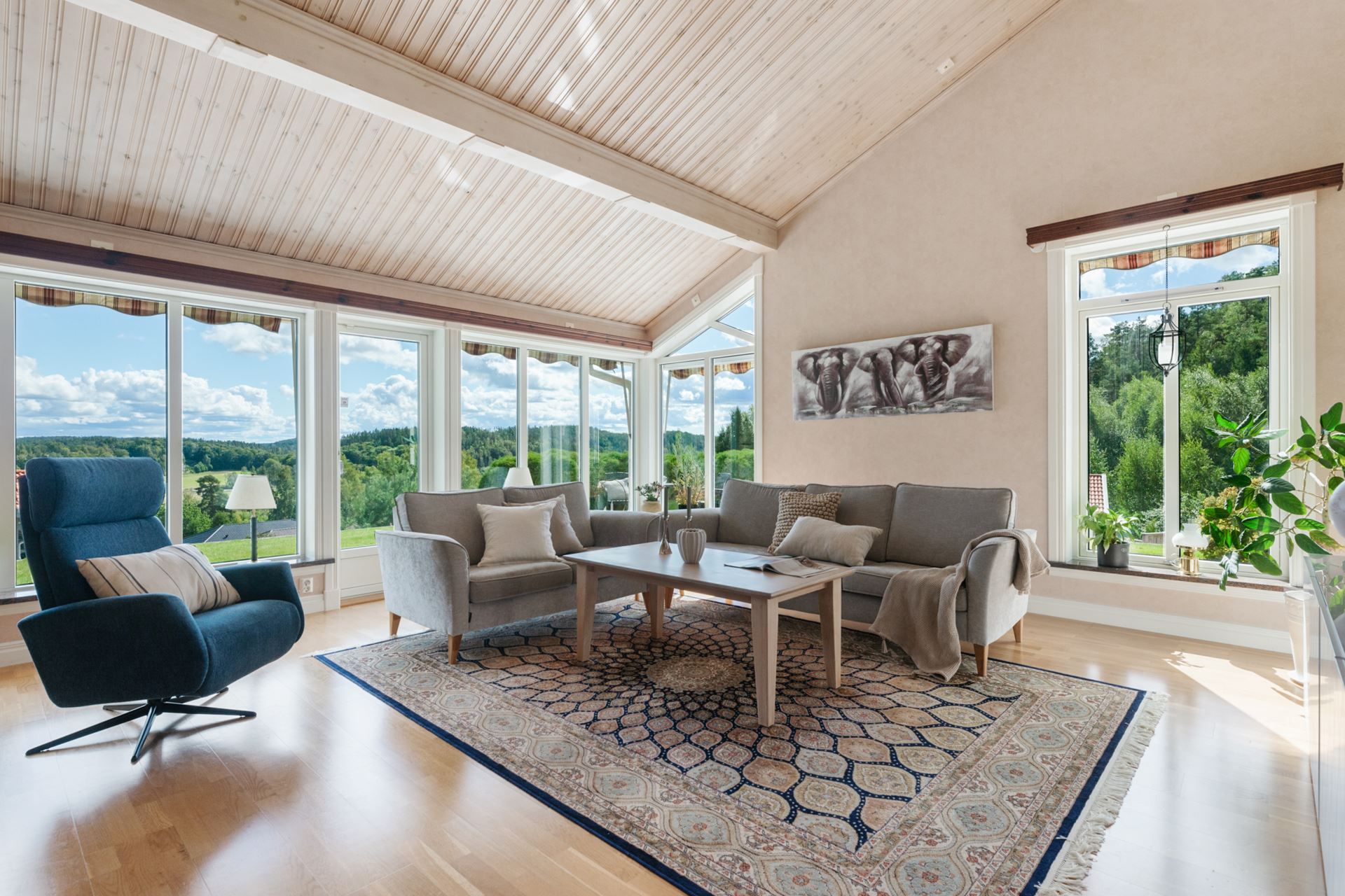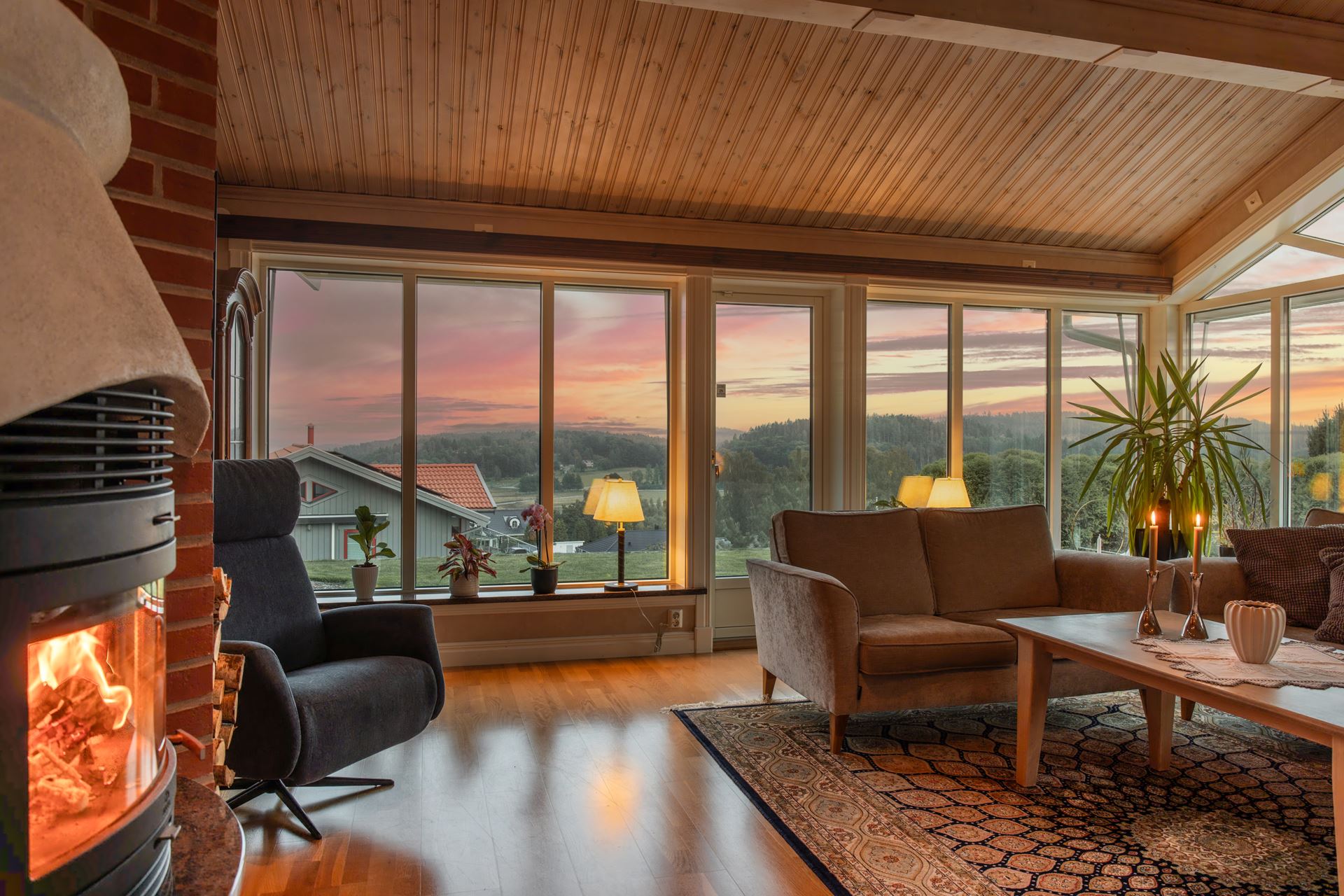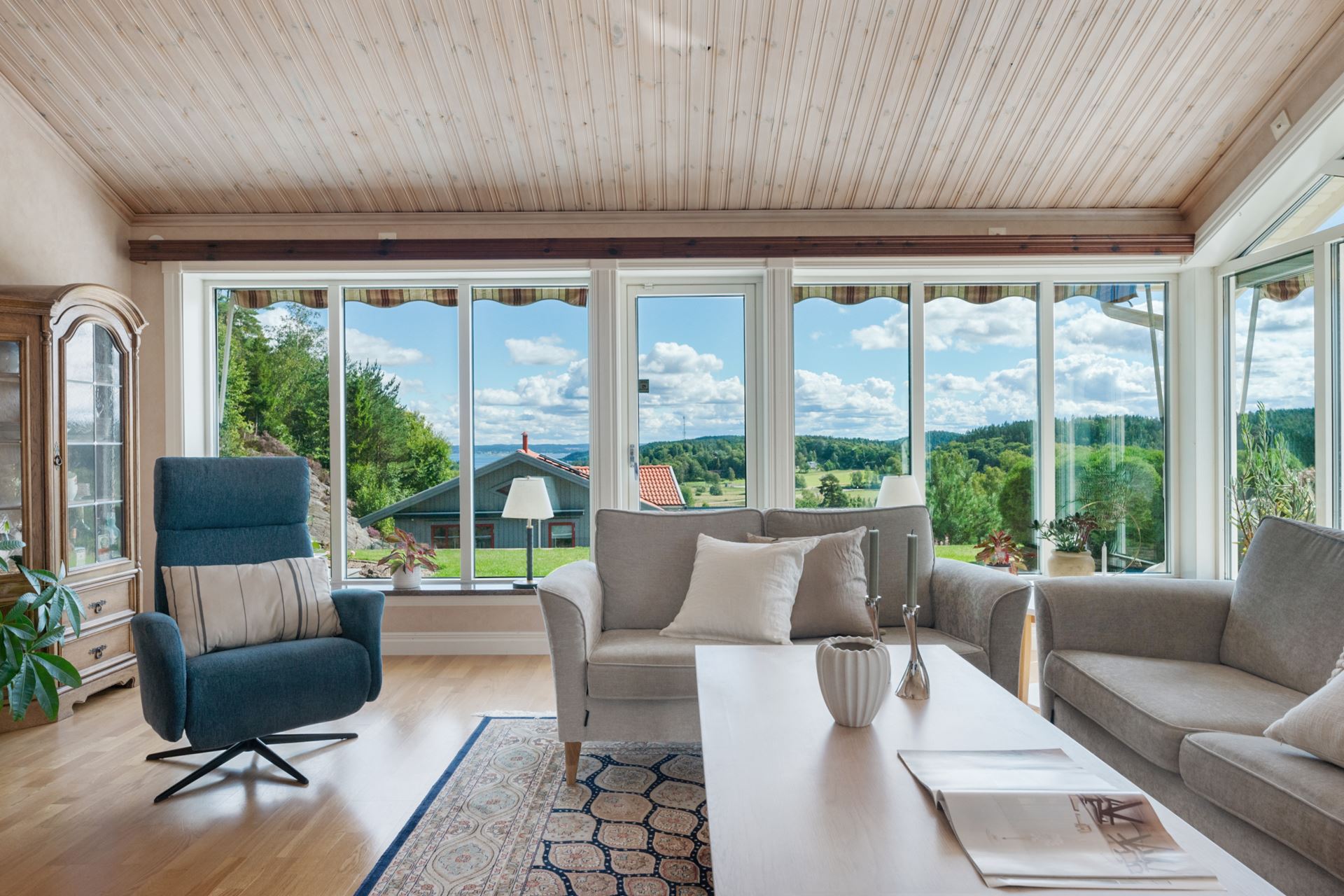 Vardagsrummet är en ljus och generös samlingspunkt där rymden och det naturliga ljuset får ta plats. Rummet ligger centralt i huset och ramas in av stora fönsterpartier i tre väderstreck, vilket skapar en öppen känsla och ett vackert ljusflöde under hela dagen. Golvet är i parkett och ytorna är lättmöblerade, oavsett om du vill inreda med en större soffgrupp, läshörna eller ett musik- eller lekområde. Mitt i rummet står en modern braskamin som både värmer och förhöjer atmosfären under årets kyligare månader. Kamininsatsen installerades 2018 och är placerad på ett sätt som gör den till en naturlig mittpunkt. Rummet har kontakt med både matplatsen och köket, vilket gör det till ett självklart nav för umgänge, avkoppling och vardagsliv. Härifrån når du också den stenlagda uteplatsen som har golvvärme, vilket suddar ut gränsen mellan inne och ute under sommarhalvåret.