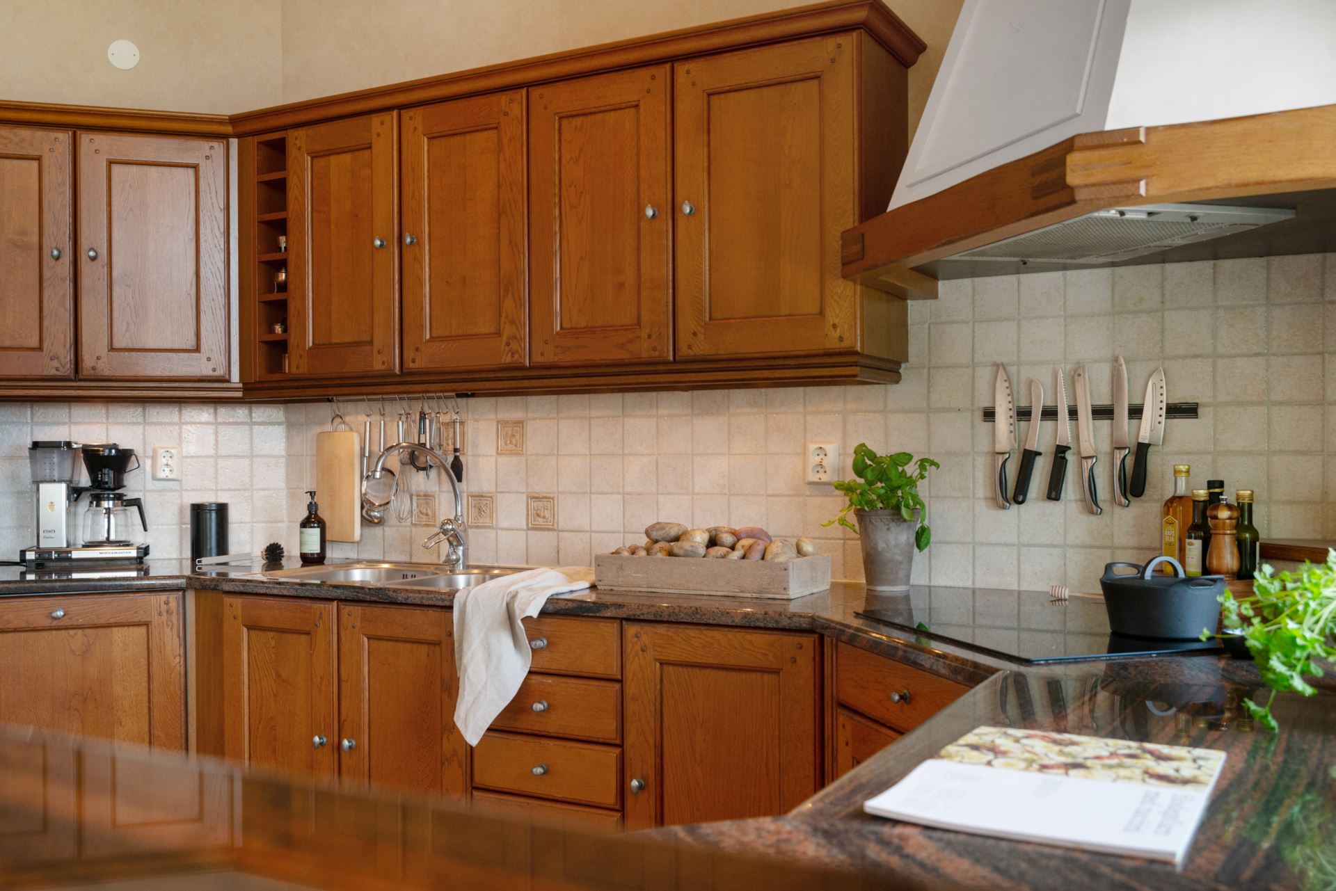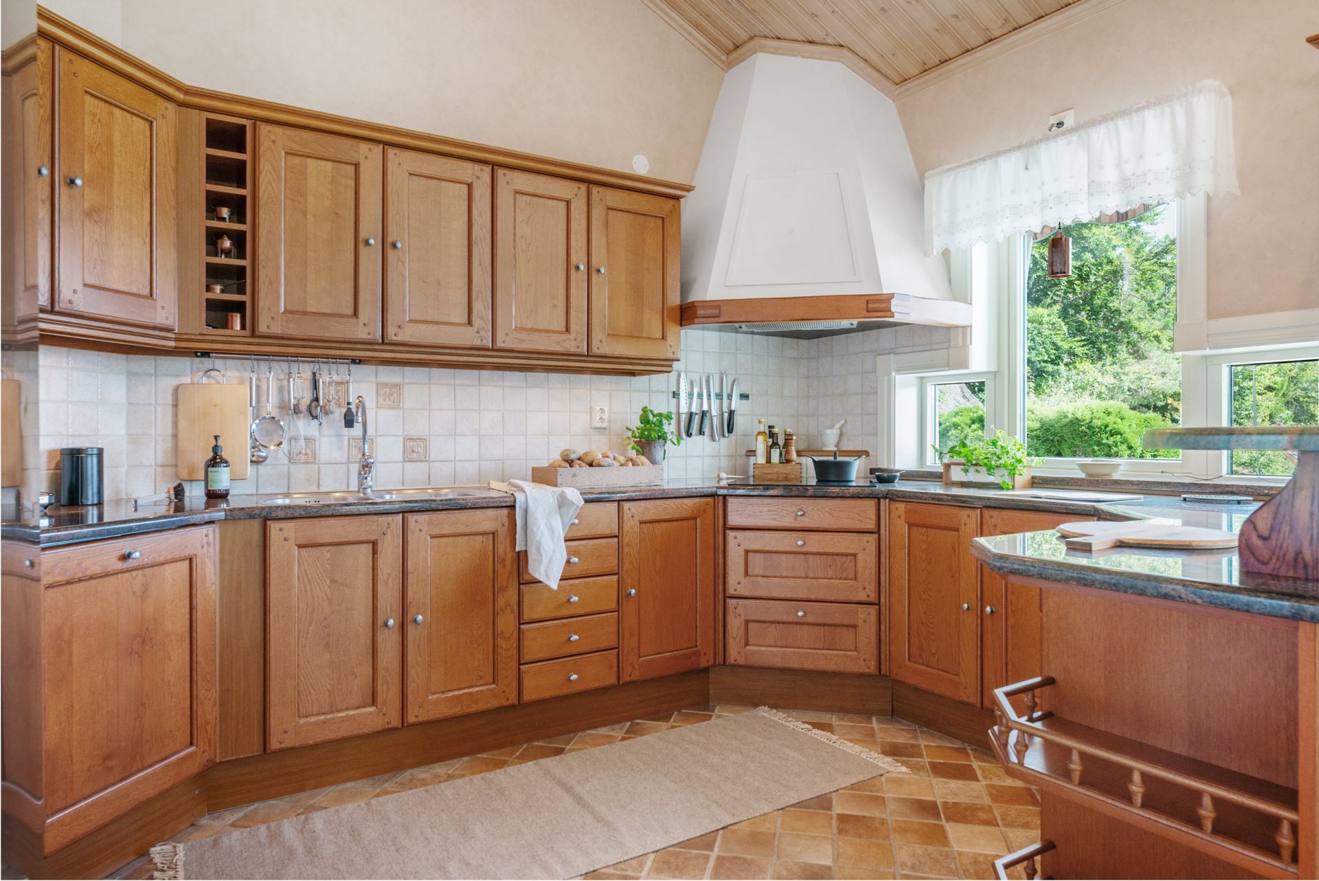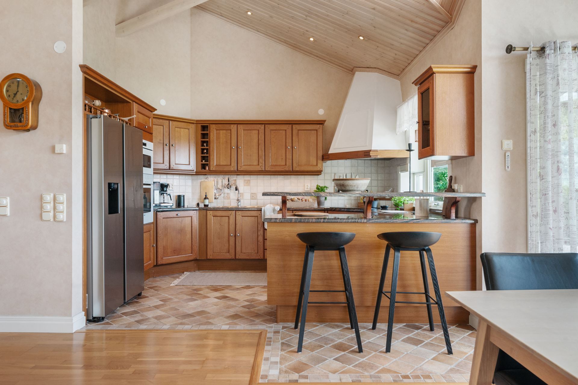 Ett stilrent och funktionellt kök med generösa arbetsytor och gott om förvaring bakom skåpsluckorna i trä. Tillsammans med det harmoniska klinkergolvet, den stilrena arbetsbänken i marmor och luckorna i trä så skapar köket en exklusiv känsla. Fönstret ovan diskbänken ger både utsikt mot tomten och ett behagligt ljusinsläpp under matlagningen. Köket är utrustat med allt du behöver för att skapa middagar till vardag och fest, och dess öppna planlösning ger kontakt med matplatsen vilket gör det socialt och trivsamt. Kylen & frysen är från 2019 och spishällen från 2022.