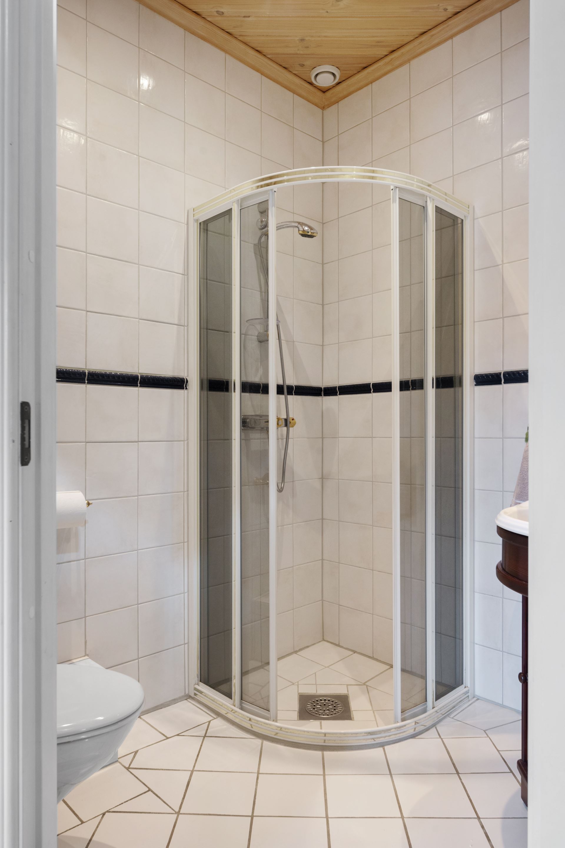 I direkt anslutning till hallen finns ett badrum som är både praktisk och smakfullt inredd. Rummet är helkaklat i ljusa nyanser, vilket ger en fräsch och välkomnande känsla. Här finns wc, handfat med kommod, spegel och dusch. Den genomtänkta placeringen gör det enkelt för både gäster och familj att använda rummet utan att störa de mer privata delarna av bostaden. En välhållen och funktionell wc som bidrar till ett smidigt vardagsflöde och ett gott första intryck.