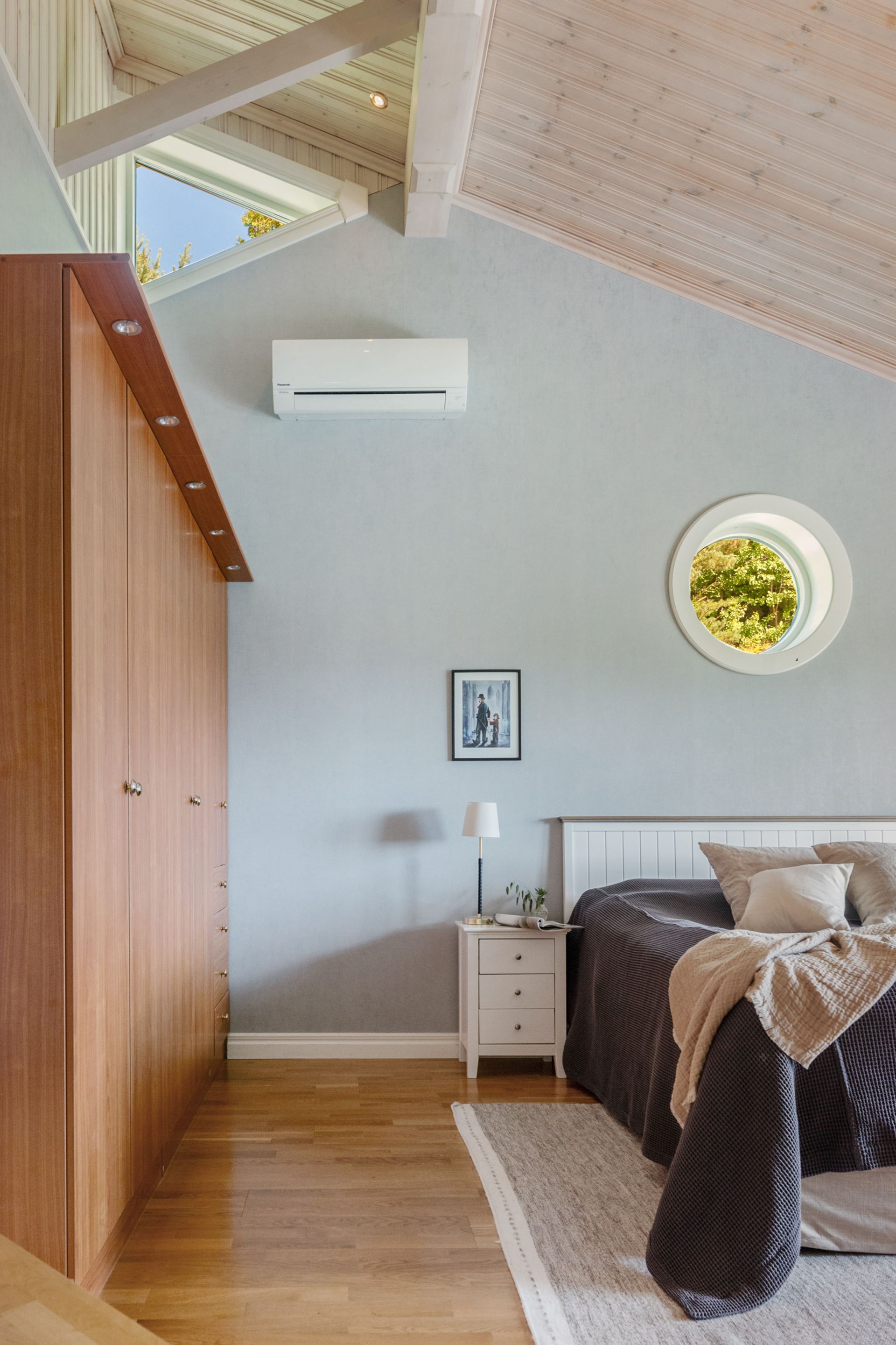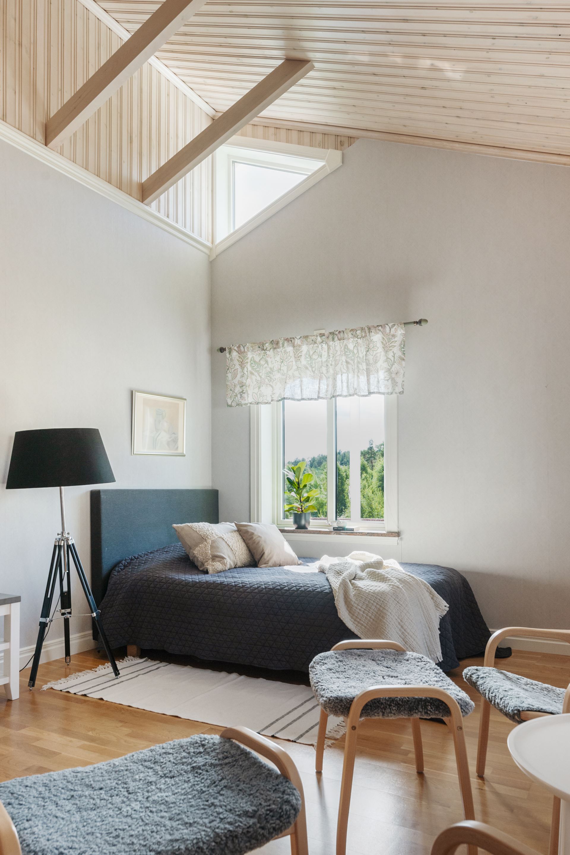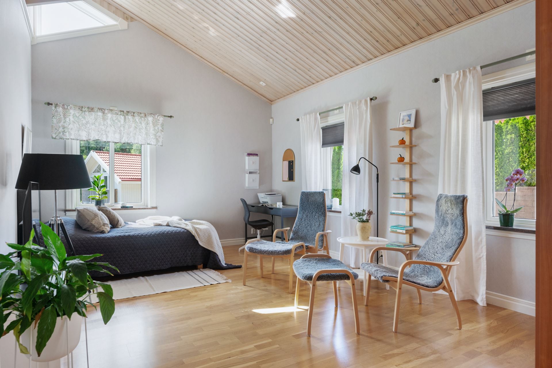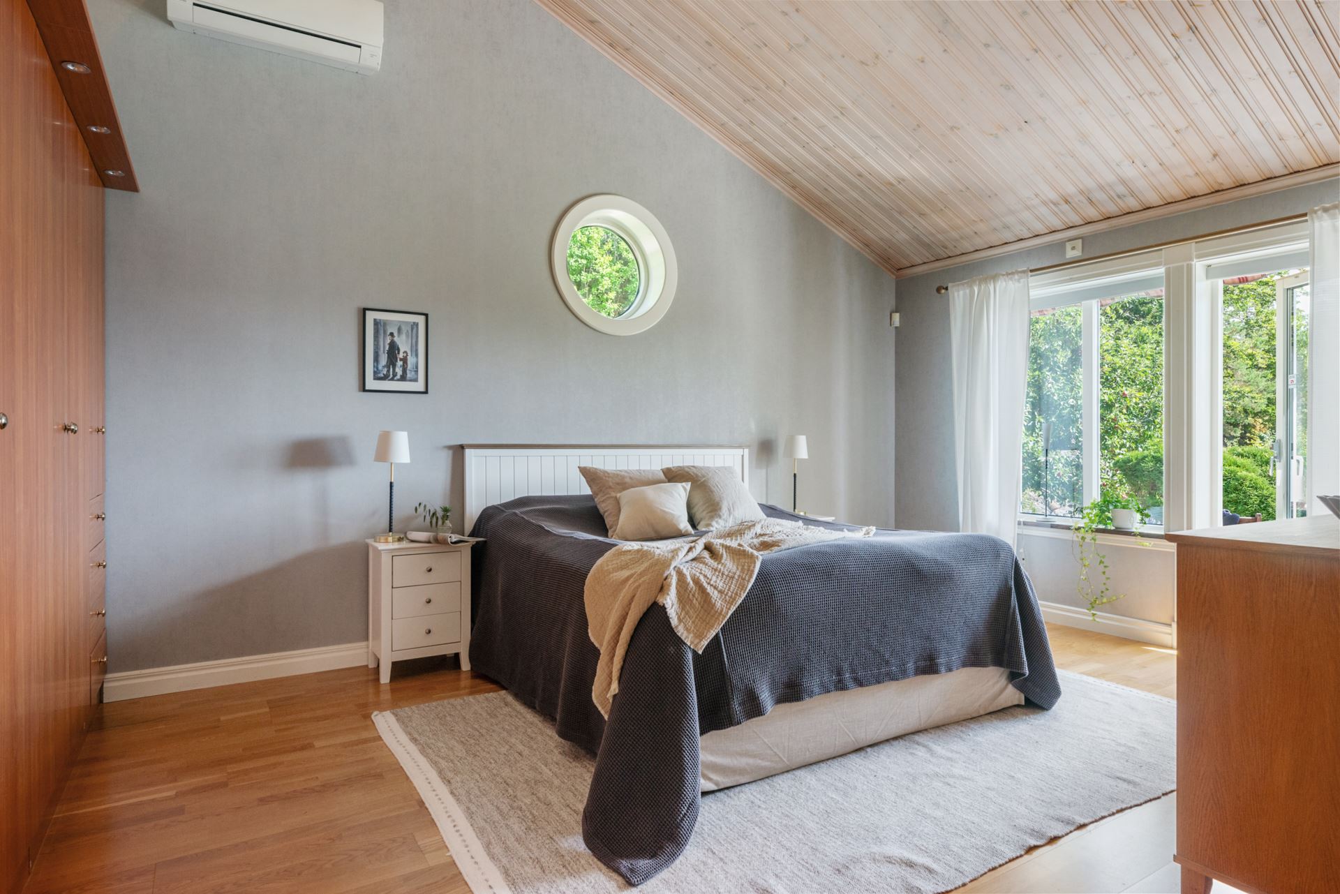 Bostadens andra sovrum ligger i den mer privata delen av huset och passar perfekt som ett lugnt och avskilt vilorum. Rummet har parkettgolv, ljusa väggar och ett fönster som vetter ut mot trädgårdens grönska. Ljuset som faller in under dagen skapar en mjuk och behaglig atmosfär. Här finns gott om plats för en dubbelsäng, sängbord och ytterligare möblering som exempelvis byrå eller mindre skrivbord. En garderobsvägg ger god förvaring utan att ta onödig golvyta i anspråk. Rummets placering i huset ger en stillsam karaktär, vilket gör det utmärkt som master bedroom, tonårsrum eller gästrum beroende på behov. Det är ett rum att dra sig tillbaka till, med en trygg och avslappnande känsla som gör det lätt att trivas.