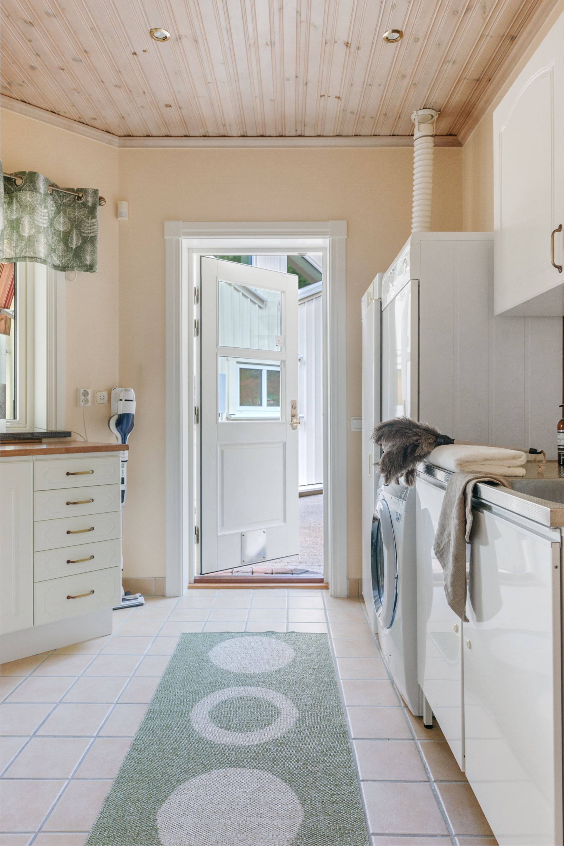 Tvättstugan är placerad med egen ingång, vilket gör den till en praktisk groventré för vardagens flöde. Här kliver du in direkt på klinkergolv, med plats att ta av skor, hänga upp ytterkläder och gå vidare in i huset utan att störa de sociala ytorna. Rummet är välutrustat med tvättmaskin från 2019, torktumlare, torkskåp och arbetsyta med vask. Väggarna är ljusa och ytorna är planerade för att underlätta klädvård och förvaring. Ett fönster ger naturligt ljusinsläpp och skapar en ljus och luftig känsla trots rummets funktionella karaktär. Det här är en genomtänkt tvättstuga som rymmer det praktiska utan att kompromissa med trivseln