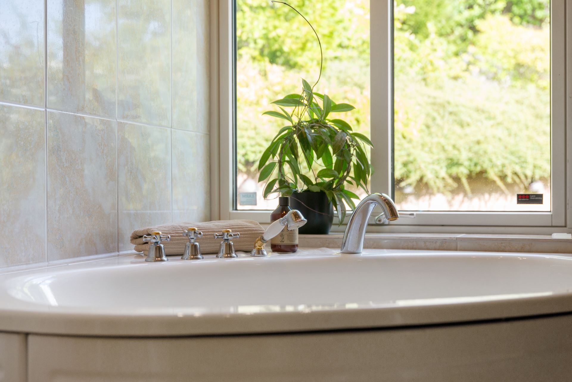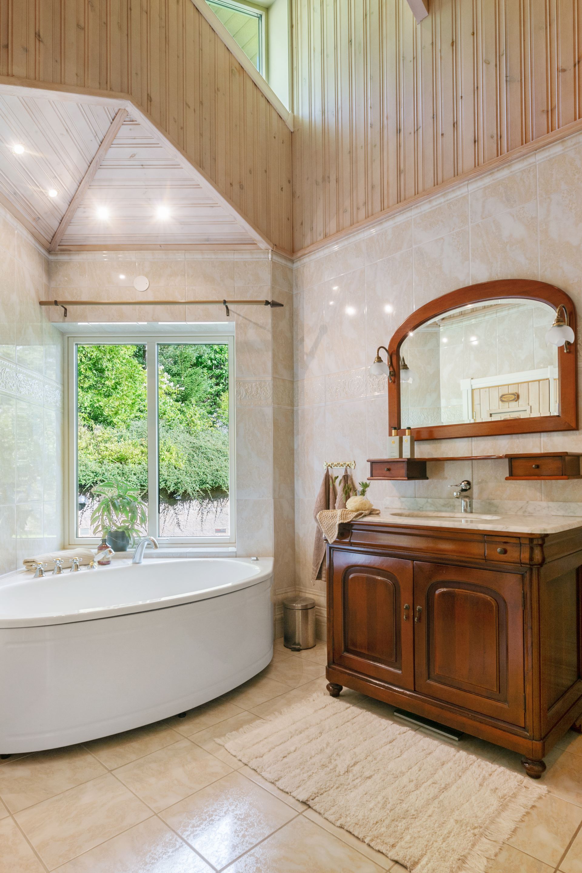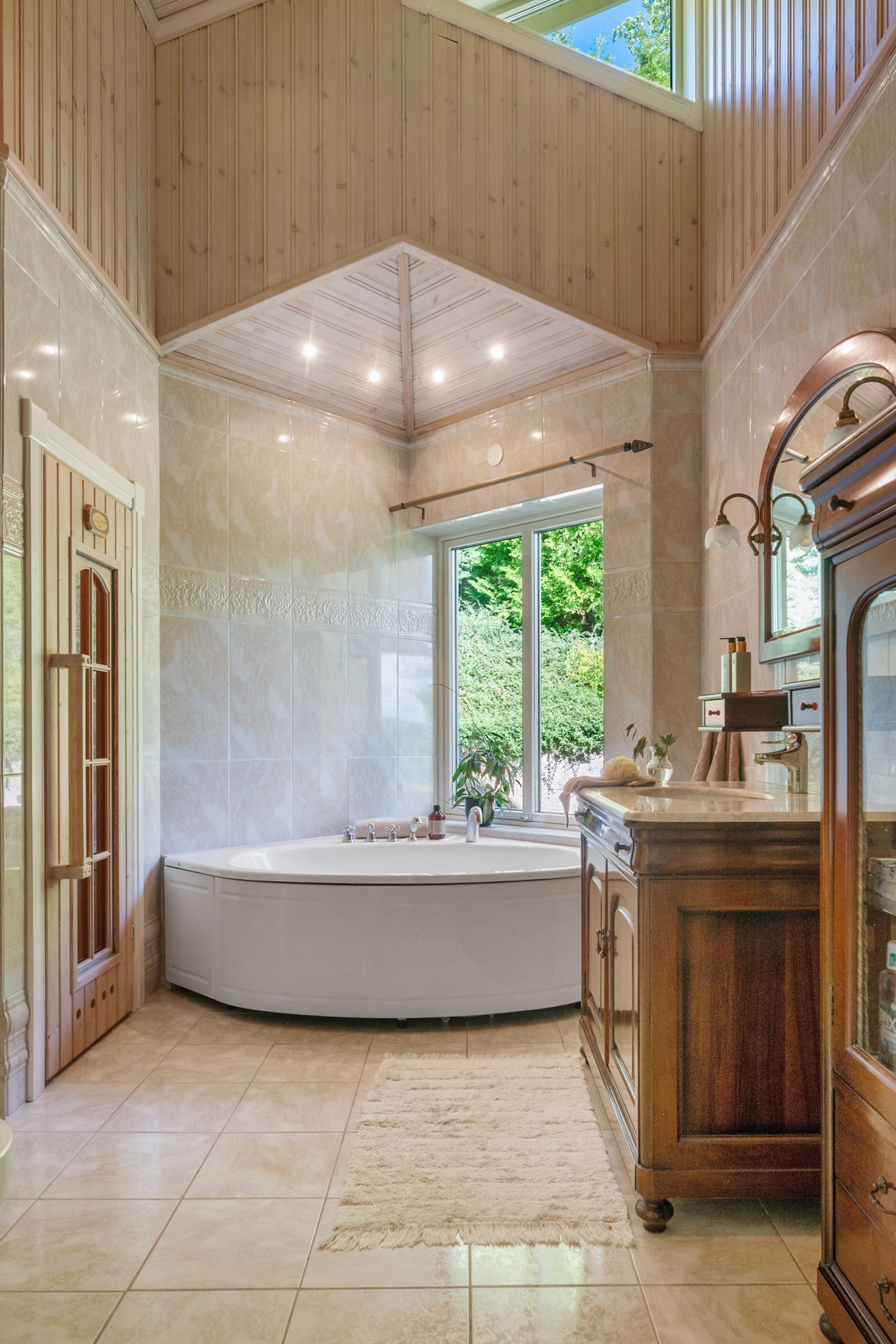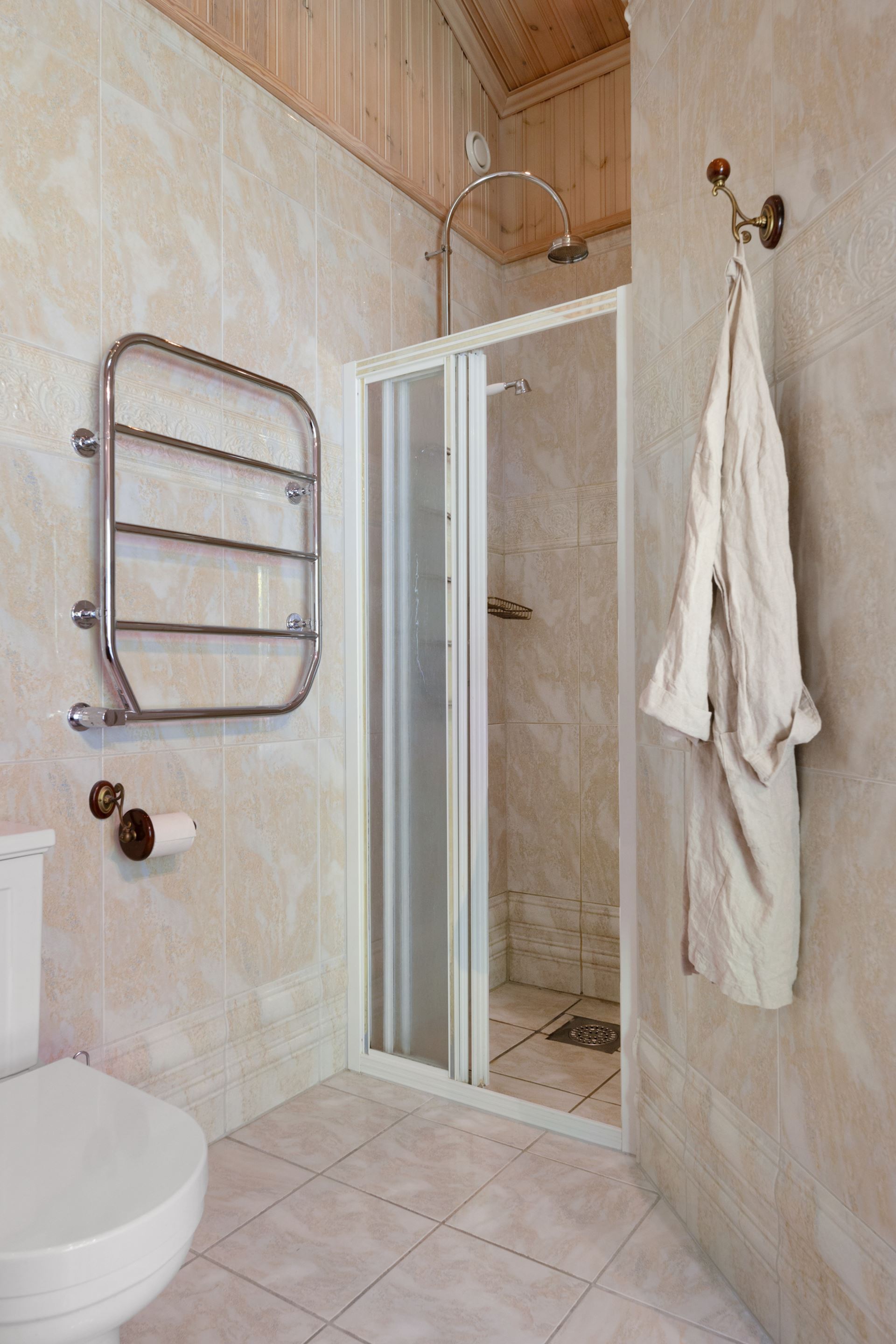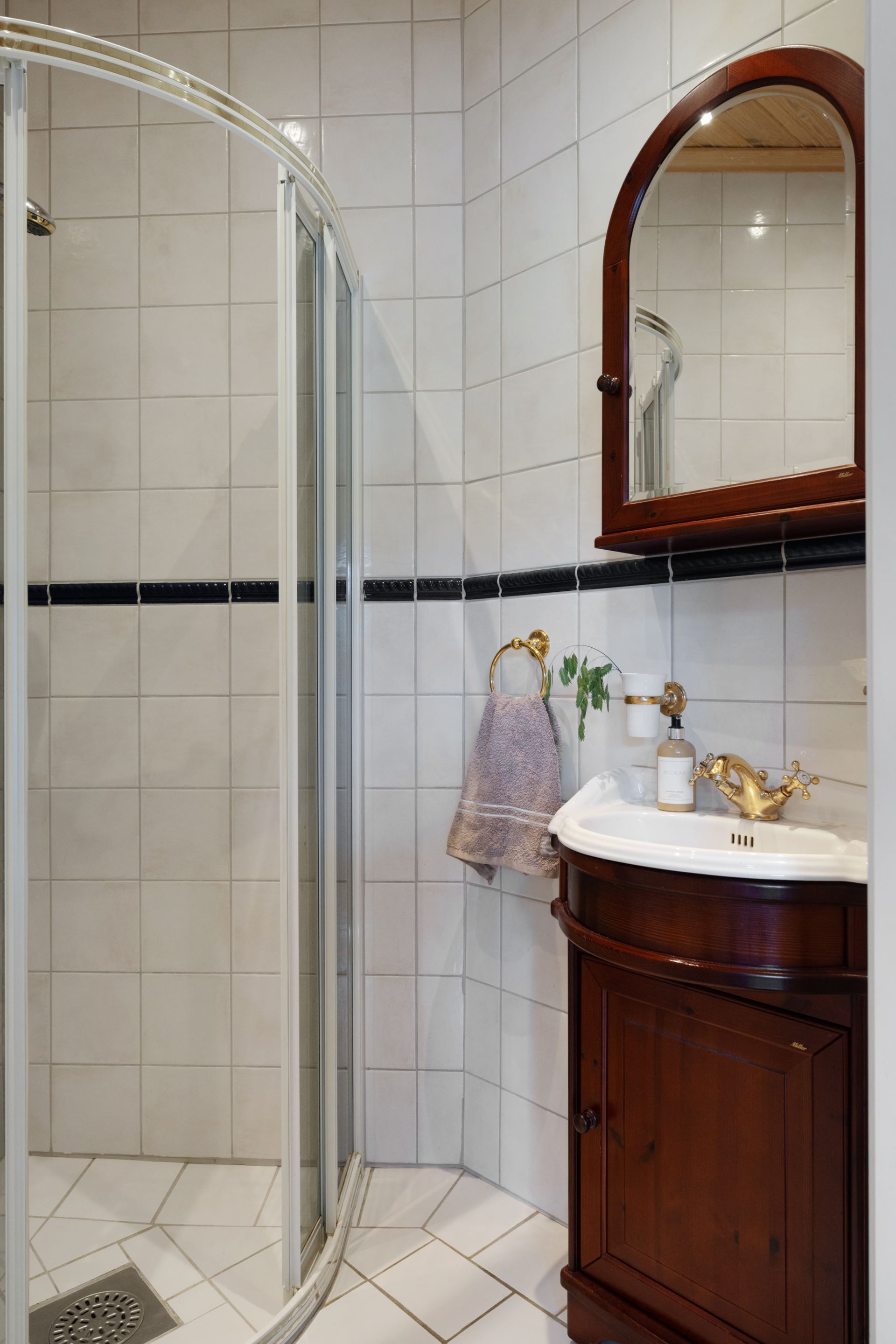 Badrummet erbjuder en modern och tidlös känsla som både är praktisk och trivsam i vardagen. Rummet är helkaklat i harmoniska färger med ljusa väggar och ett sobert golv i klinker, vilket skapar en stilren och fräsch atmosfär. Här finns duschhörna med glasvägg, wc, kommod med handfat samt spegel med belysning. Inredningen är noggrant utvald för att ge ett lugnt intryck, samtidigt som funktion och förvaring har prioriterats. Rummets placering i anslutning till både sovrum och groventré gör det lättillgängligt från flera delar av huset. Det är ett badrum där form och funktion samspelar på ett sätt som gör det bekvämt att använda, oavsett tid på dygnet.