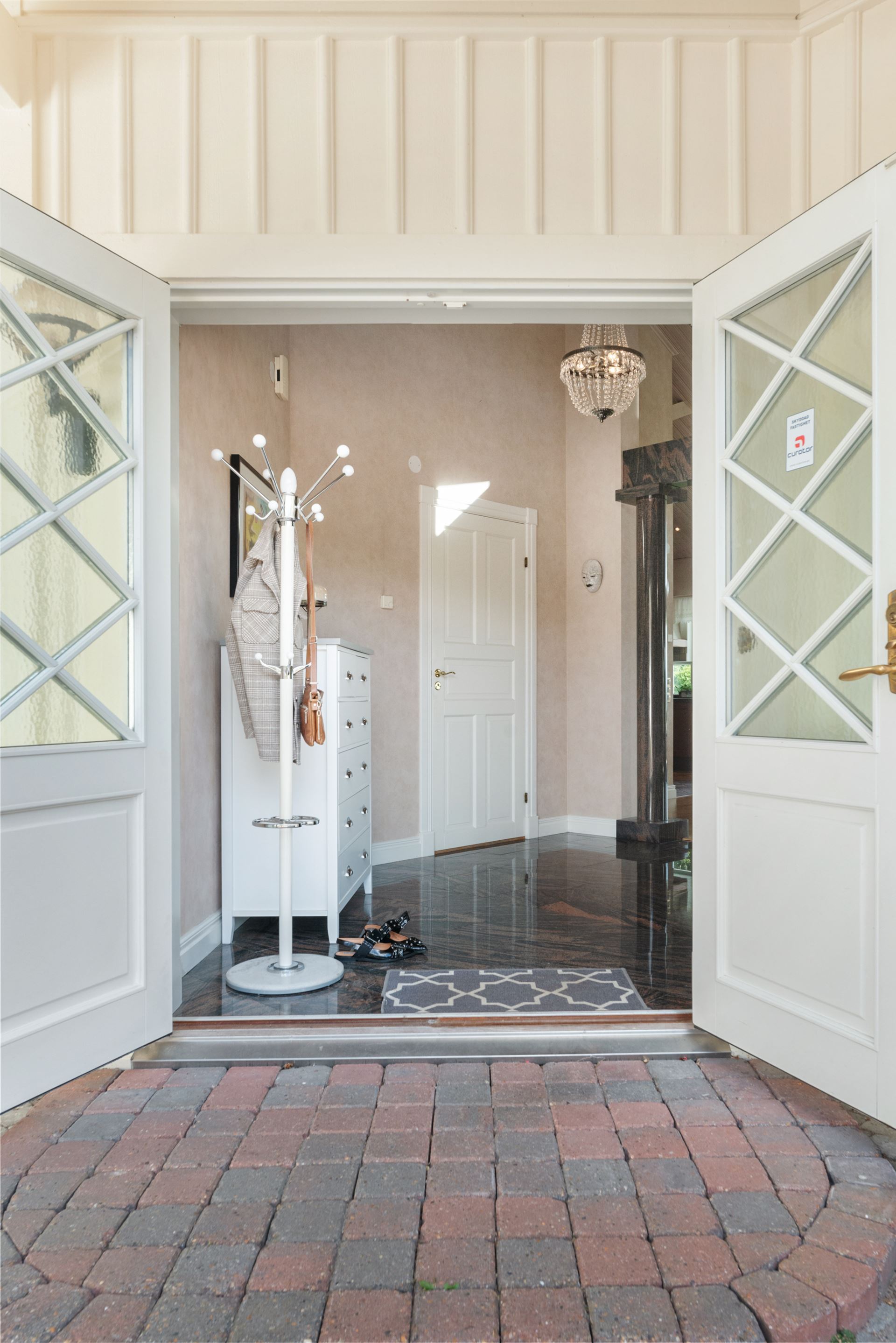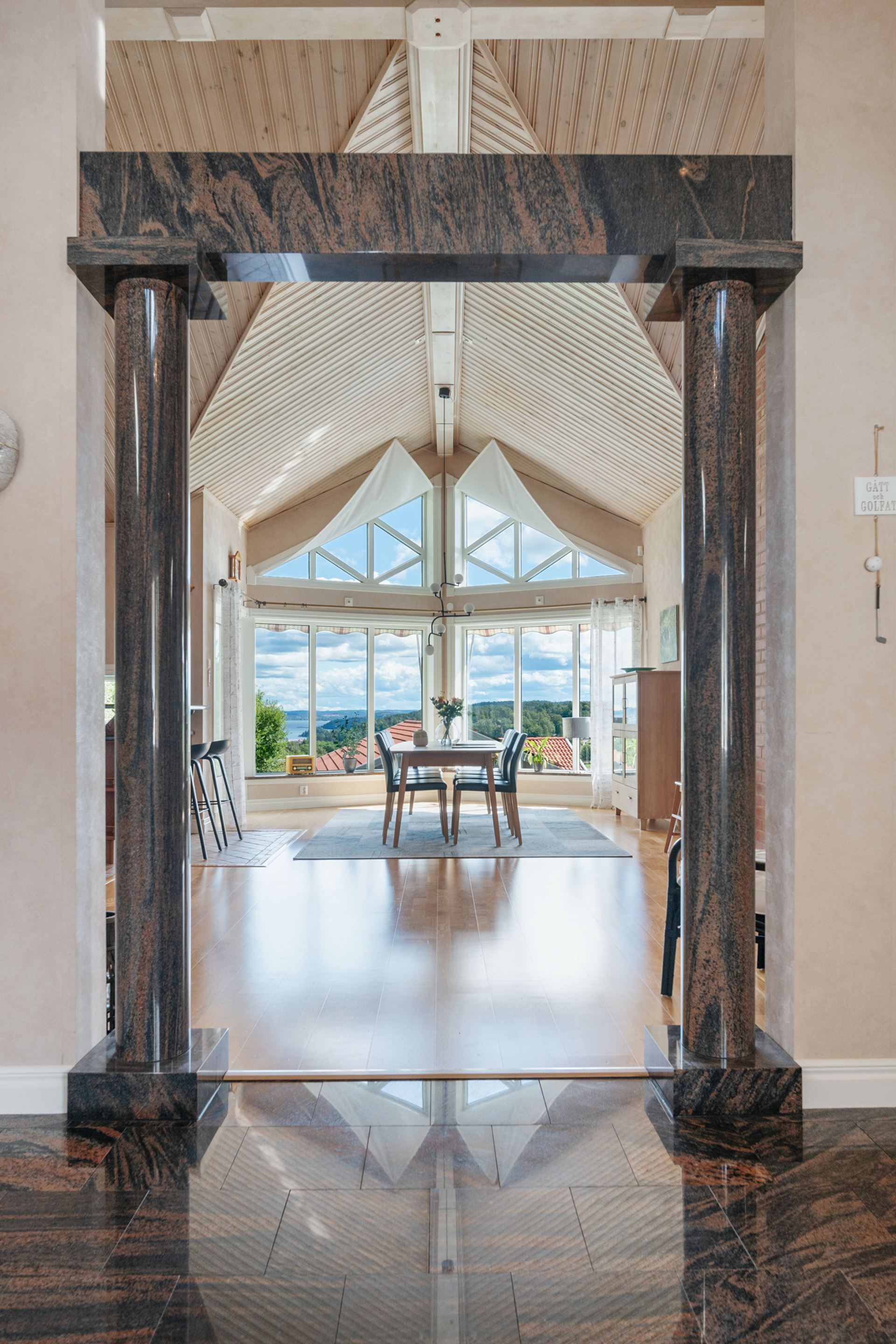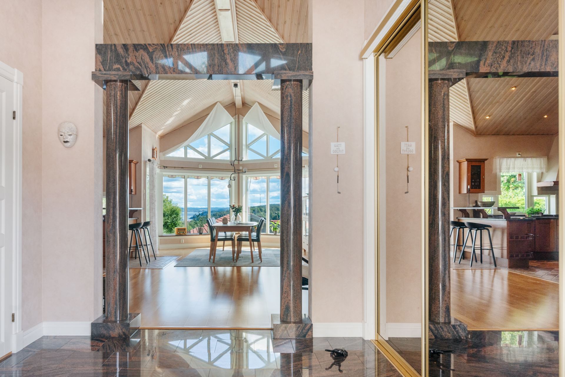 När du kliver in i hallen möts du av en känsla av öppenhet och elegans. Det första som fångar blicken är den fantastiska rymden och den generösa vyn genom huset, där de stora fönsterpartierna bjuder in både dagsljus och utsikt över det vackra landskapet utanför. Hallens marmorgolv samspelar fint med pelardetaljer i mörk sten, vilket ger ett lyxigt och genomtänkt första intryck. Den stora spegelgarderoben reflekterar ljuset och förstärker känslan av rymd, samtidigt som den erbjuder praktisk förvaring för ytterkläder och skor. Det är en entré som både välkomnar och imponerar.