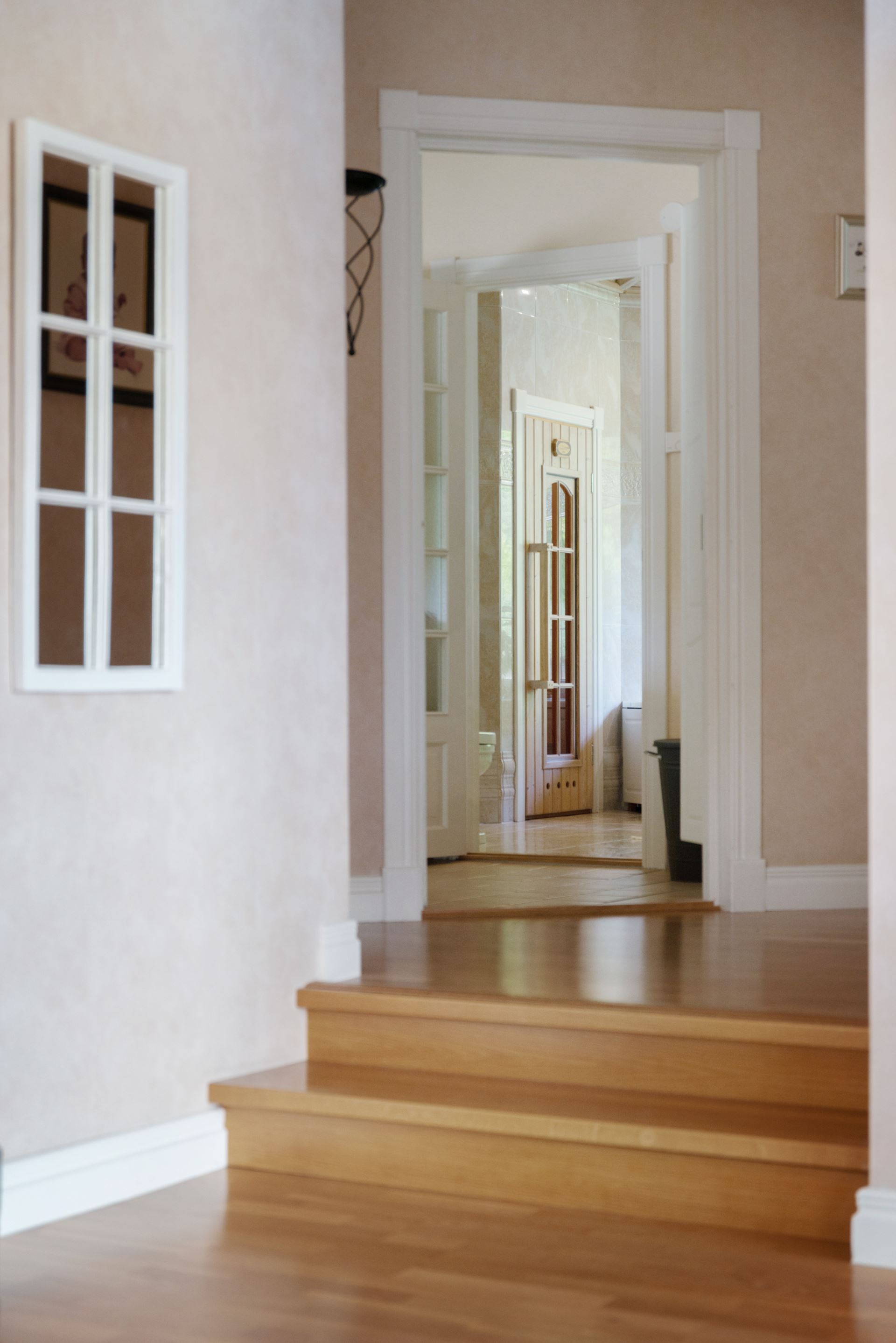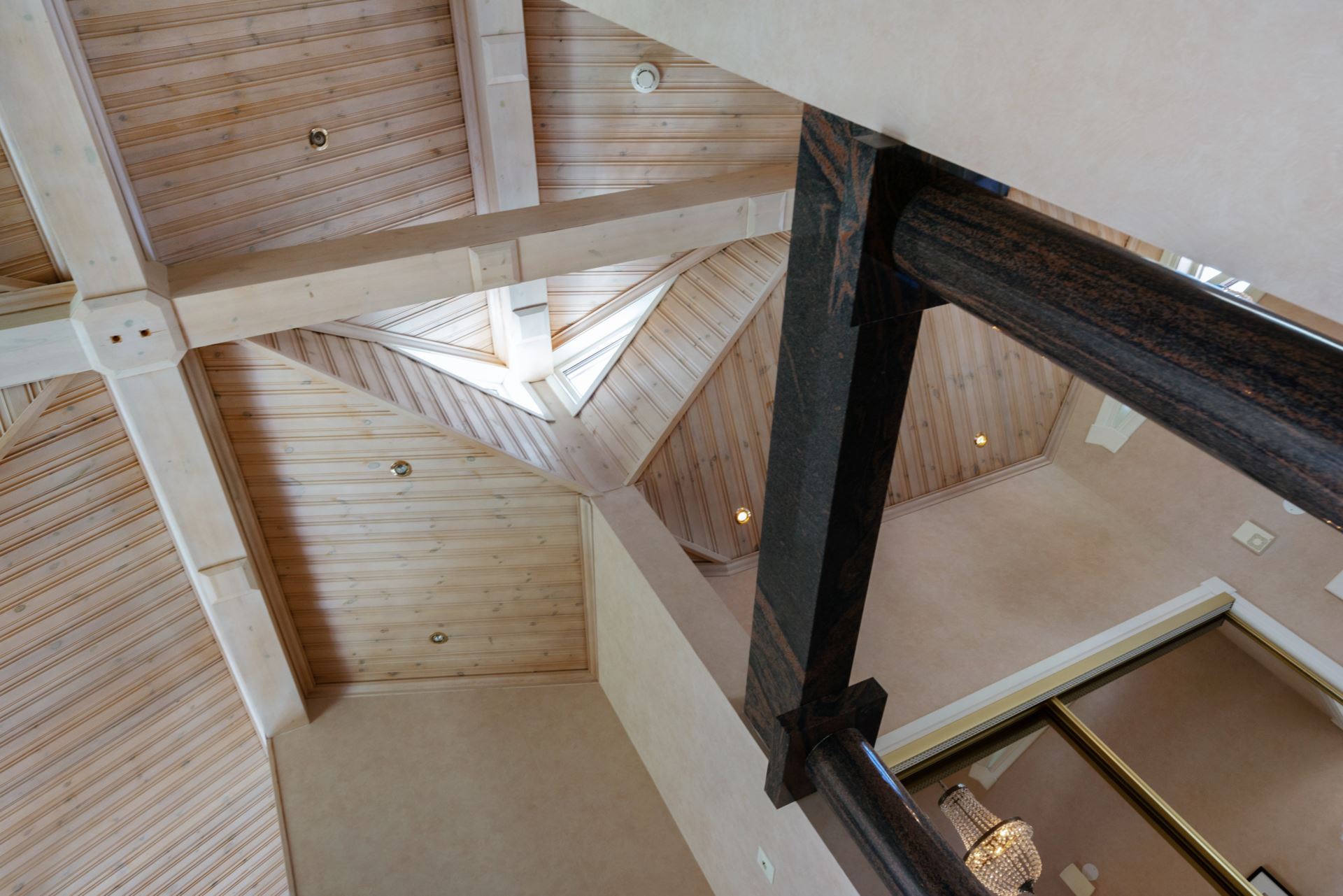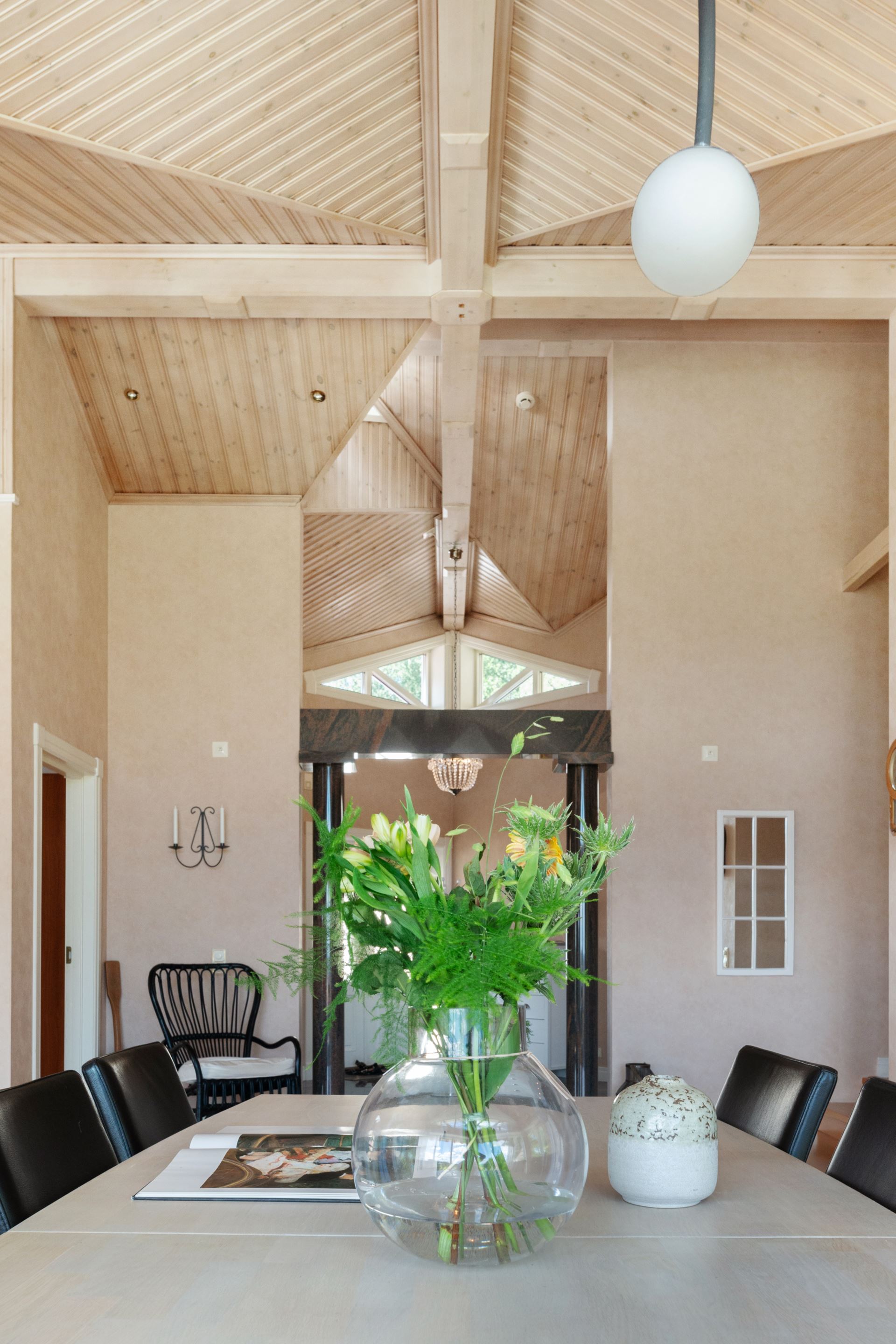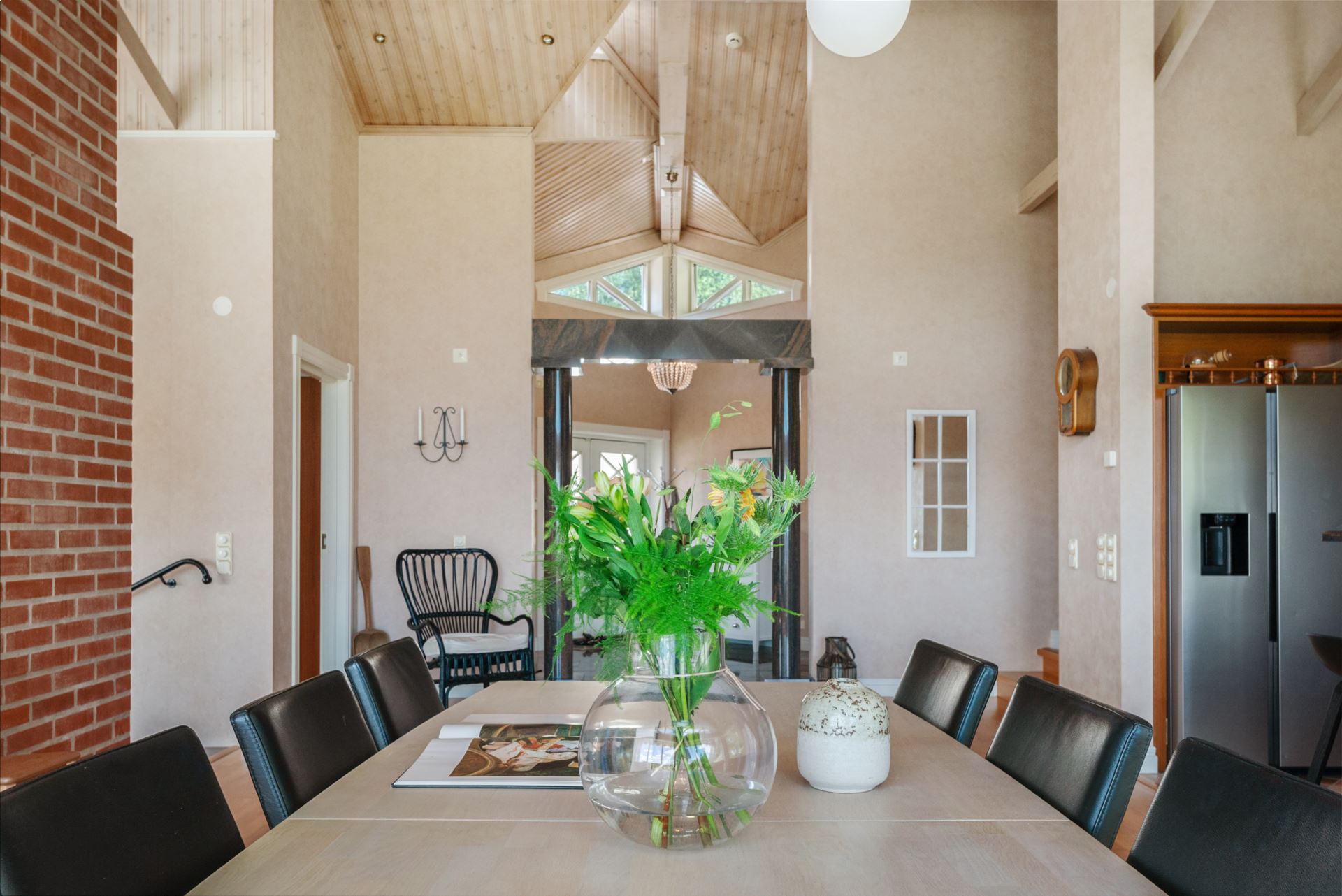 När du kliver in i hallen möts du av en känsla av öppenhet och elegans. Det första som fångar blicken är den fantastiska rymden och den generösa vyn genom huset, där de stora fönsterpartierna bjuder in både dagsljus och utsikt över det vackra landskapet utanför. Hallens marmorgolv samspelar fint med pelardetaljer i mörk sten, vilket ger ett lyxigt och genomtänkt första intryck. Den stora spegelgarderoben reflekterar ljuset och förstärker känslan av rymd, samtidigt som den erbjuder praktisk förvaring för ytterkläder och skor. Det är en entré som både välkomnar och imponerar.