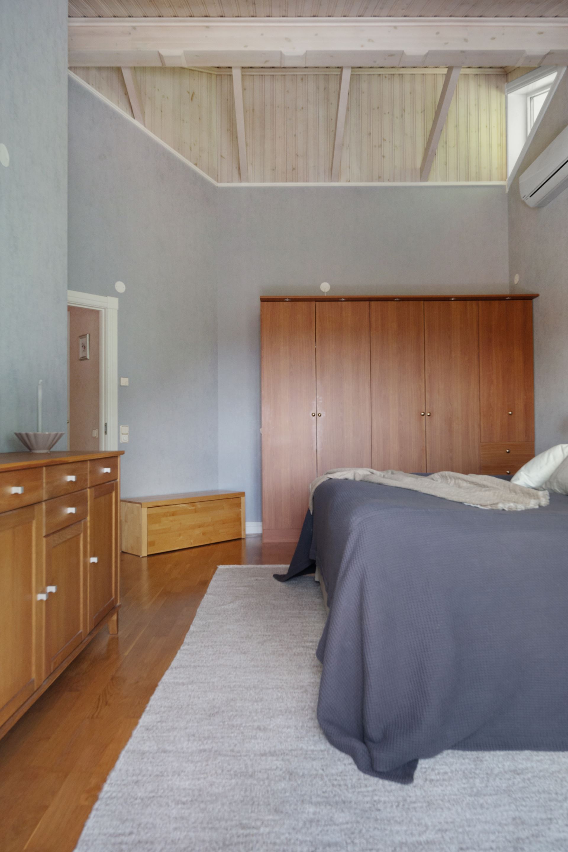 Det första sovrummet, beläget direkt till höger efter entrén, är ett ljust och harmoniskt rum med fönster som vetter mot husets framsida. Rummet har parkettgolv och ljusa väggar, vilket skapar en mjuk och rogivande atmosfär. Den generösa takhöjden bidrar till en känsla av rymd och gör rummet lätt att möblera. Här ryms enkelt en säng, skrivbord eller en mindre sittgrupp, vilket gör det till ett utmärkt val som gästrum, hemmakontor eller barnrum. Garderobsförvaring finns direkt i anslutning, vilket gör det enkelt att hålla ordning. Det här är ett rum som bjuder in till vila, stillhet och flexibilitet.