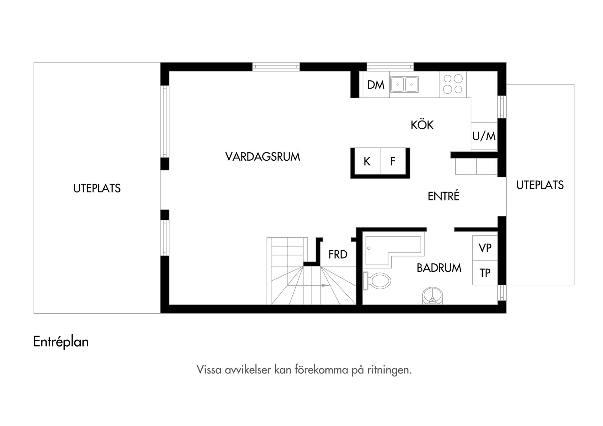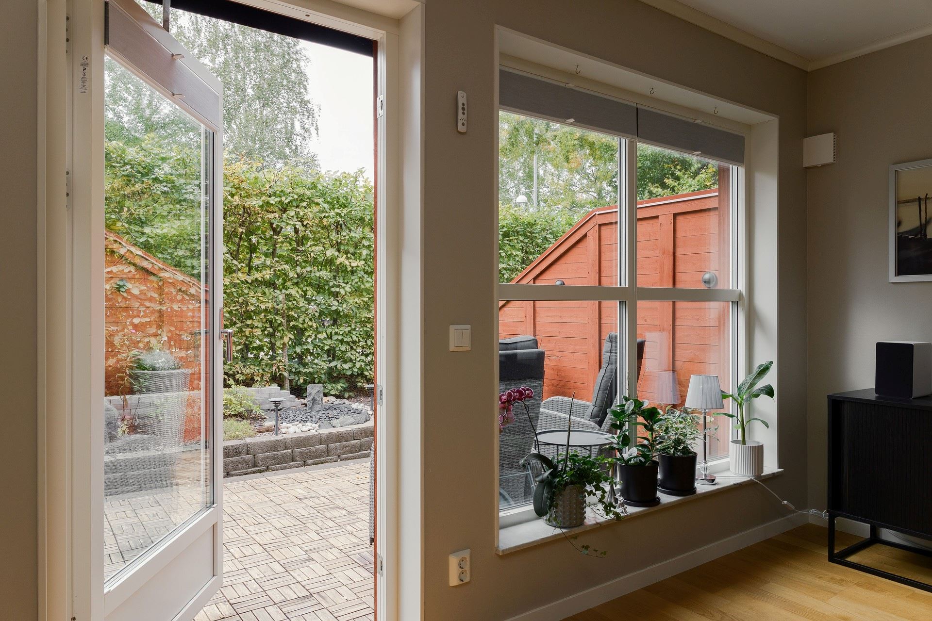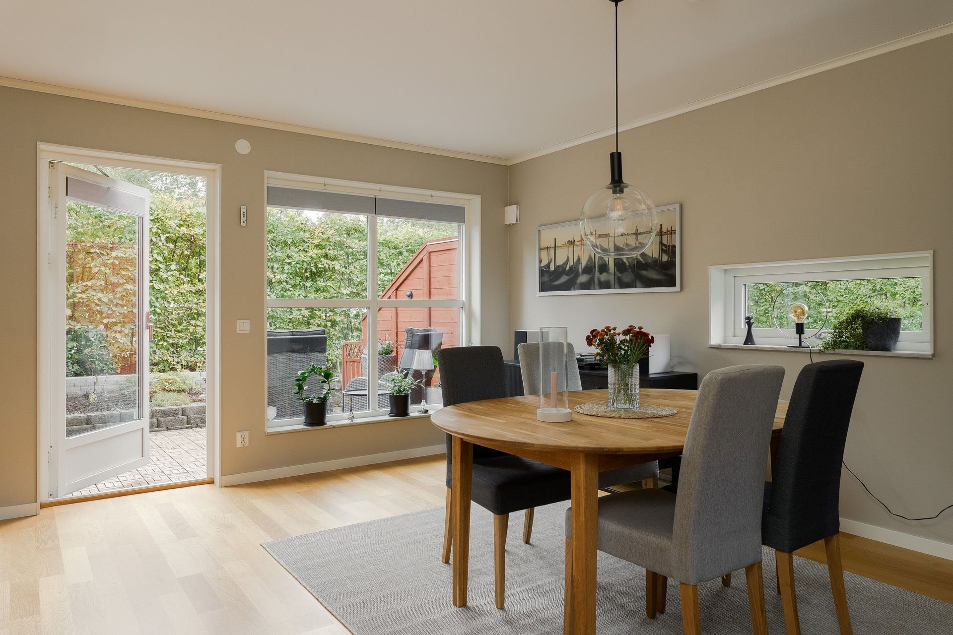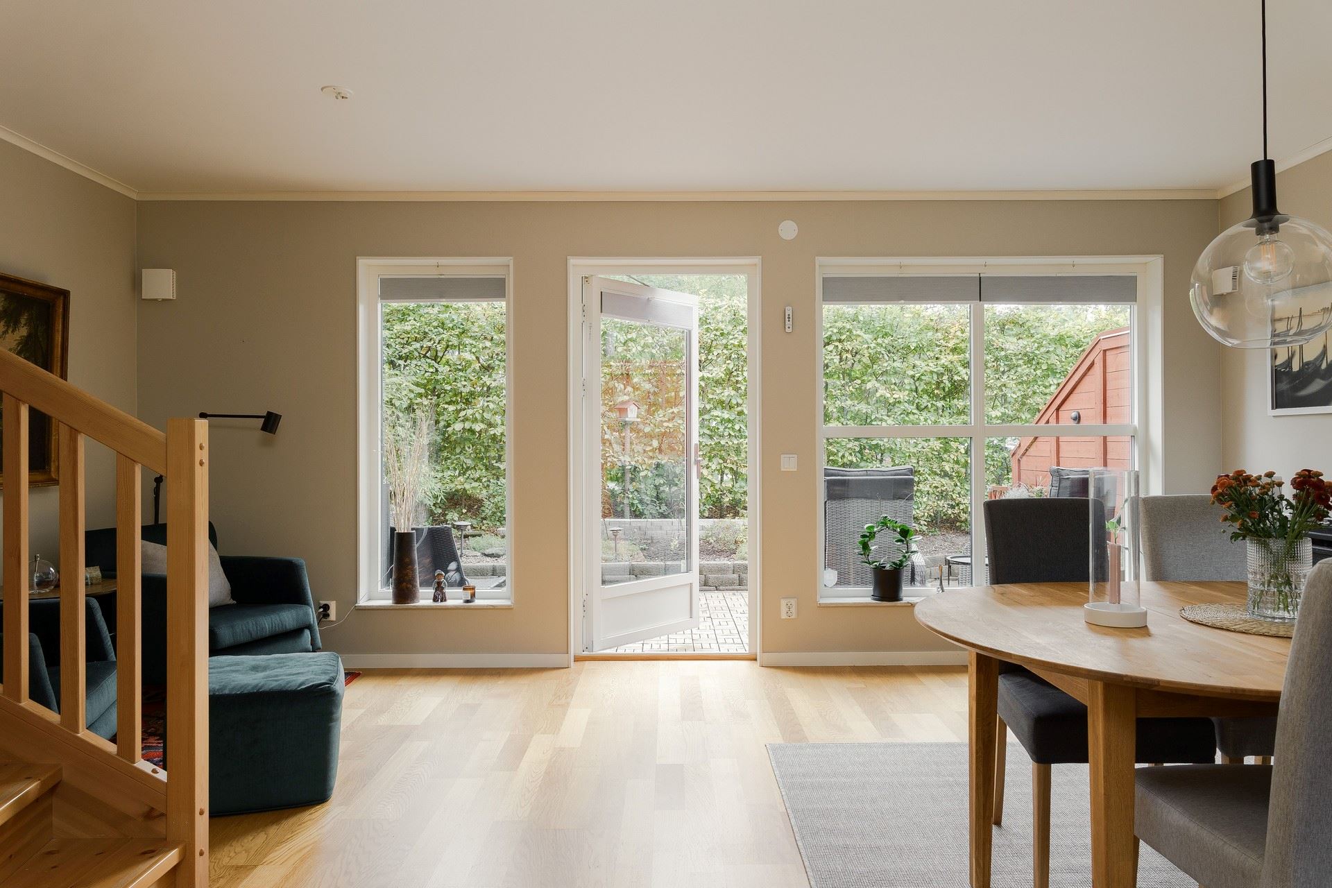 Rakt fram från entrén finns det härliga vardagsrummet i öppen planlösning med köket vilket bidrar till goda sällskapsytor. Här finns gott om plats för möblering av loungehörna liksom ett större matbord. De stora fönsterna bidrar till ett härligt ljusinsläpp. Härifrån når man uteplatsen som ligger i ett perfekt söderläge med eftermiddags och kvällssol.