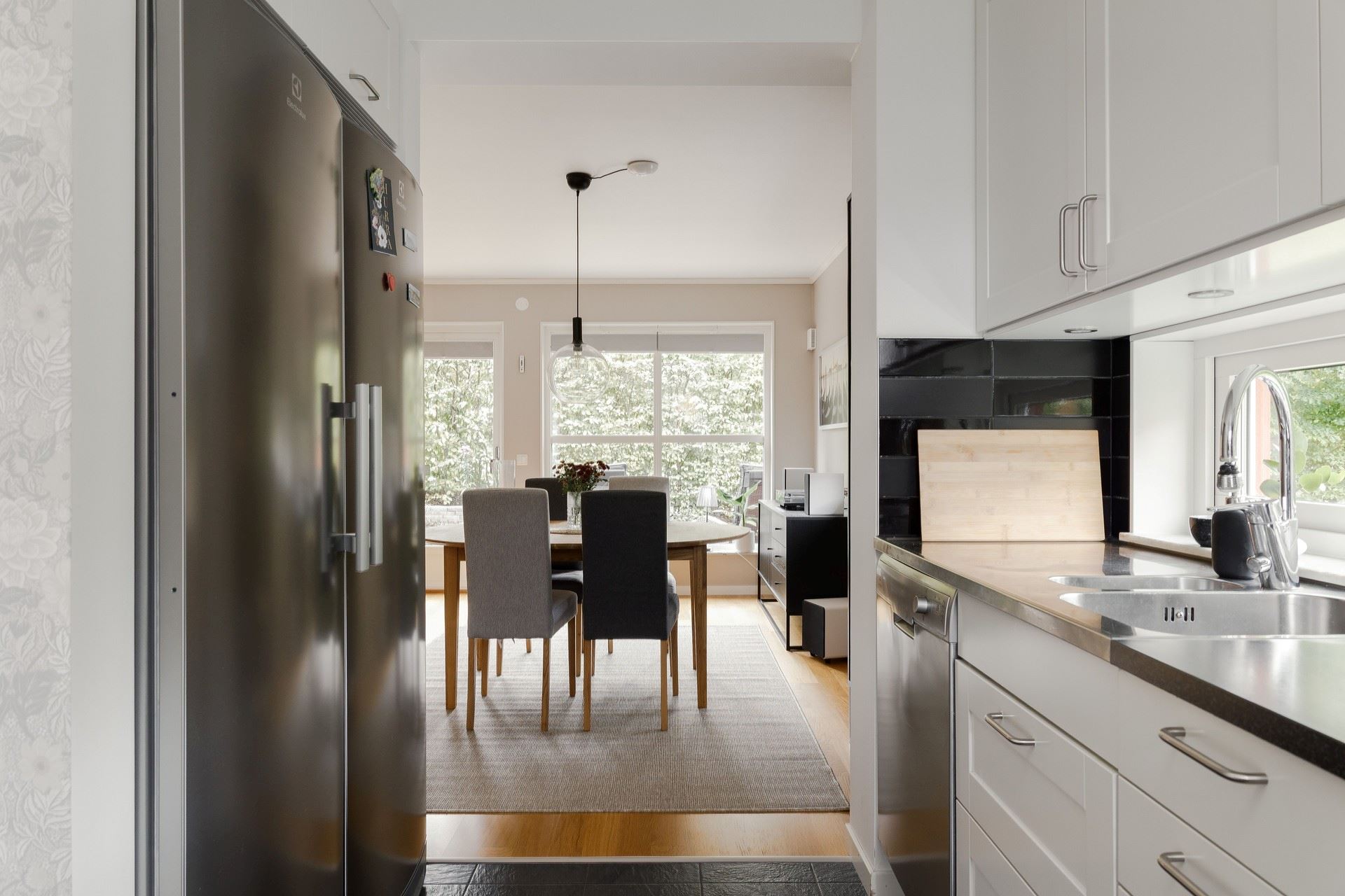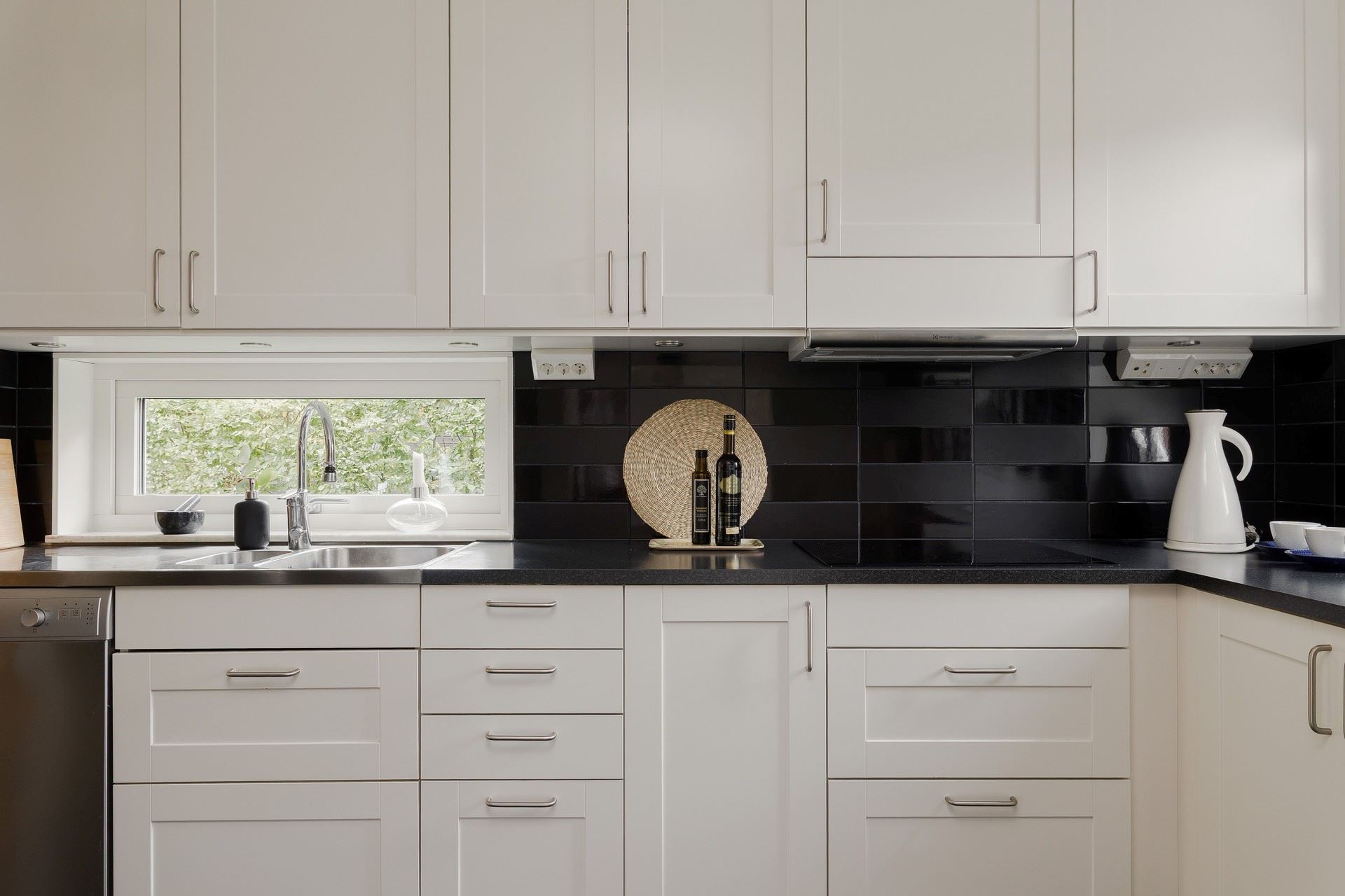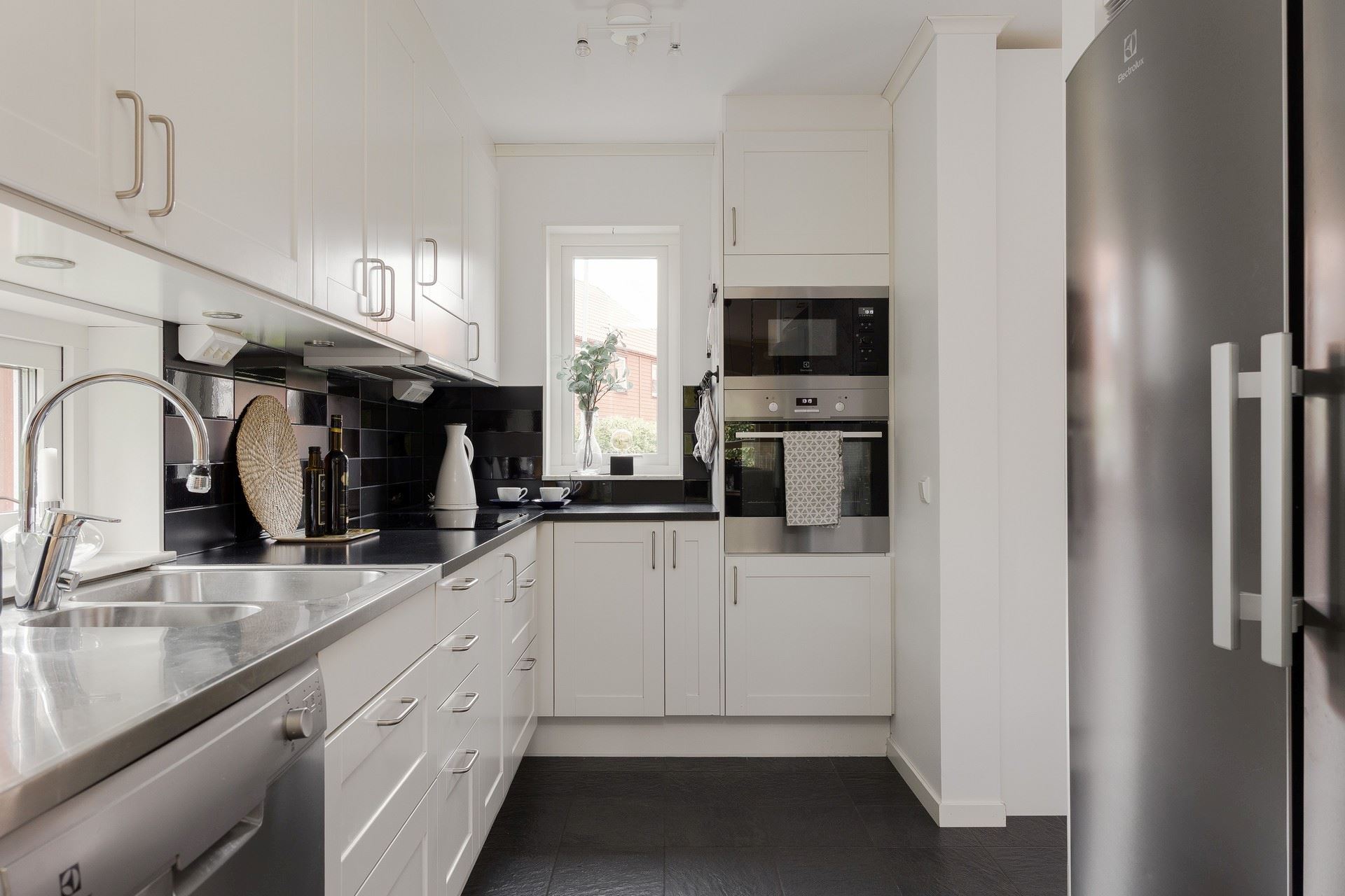 Köket är modernt i vitt utförande med en arbetsbänk i svart laminat och ett matchande stänkskydd i svart kakel. Den maskinella utrustningen består av kyl och frys i fullhöjd, mikro och ugn i arbetshöjd, diskmaskin och spishäll - allt i rostfritt utförande. Varma dagar flyttar man enkelt ut måltiden till den generösa uteplatsen där man med lätthet får plats med både härligt soffhäng samt matbord.
