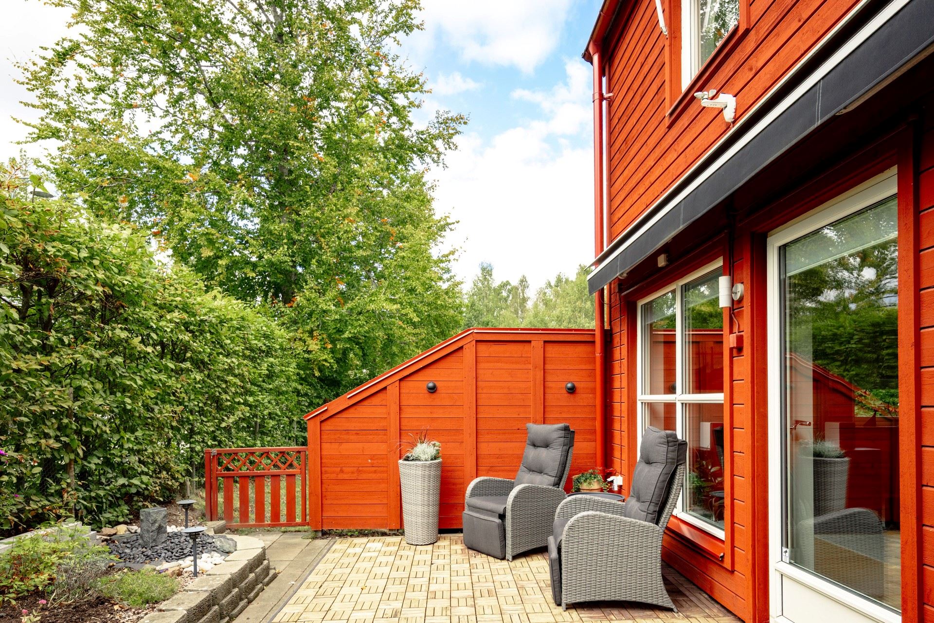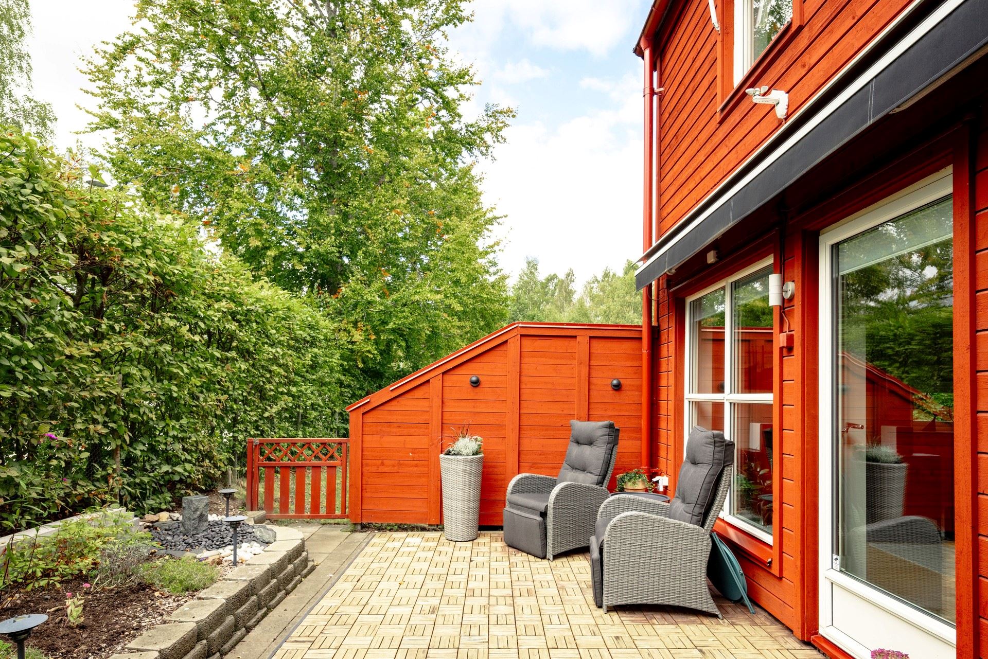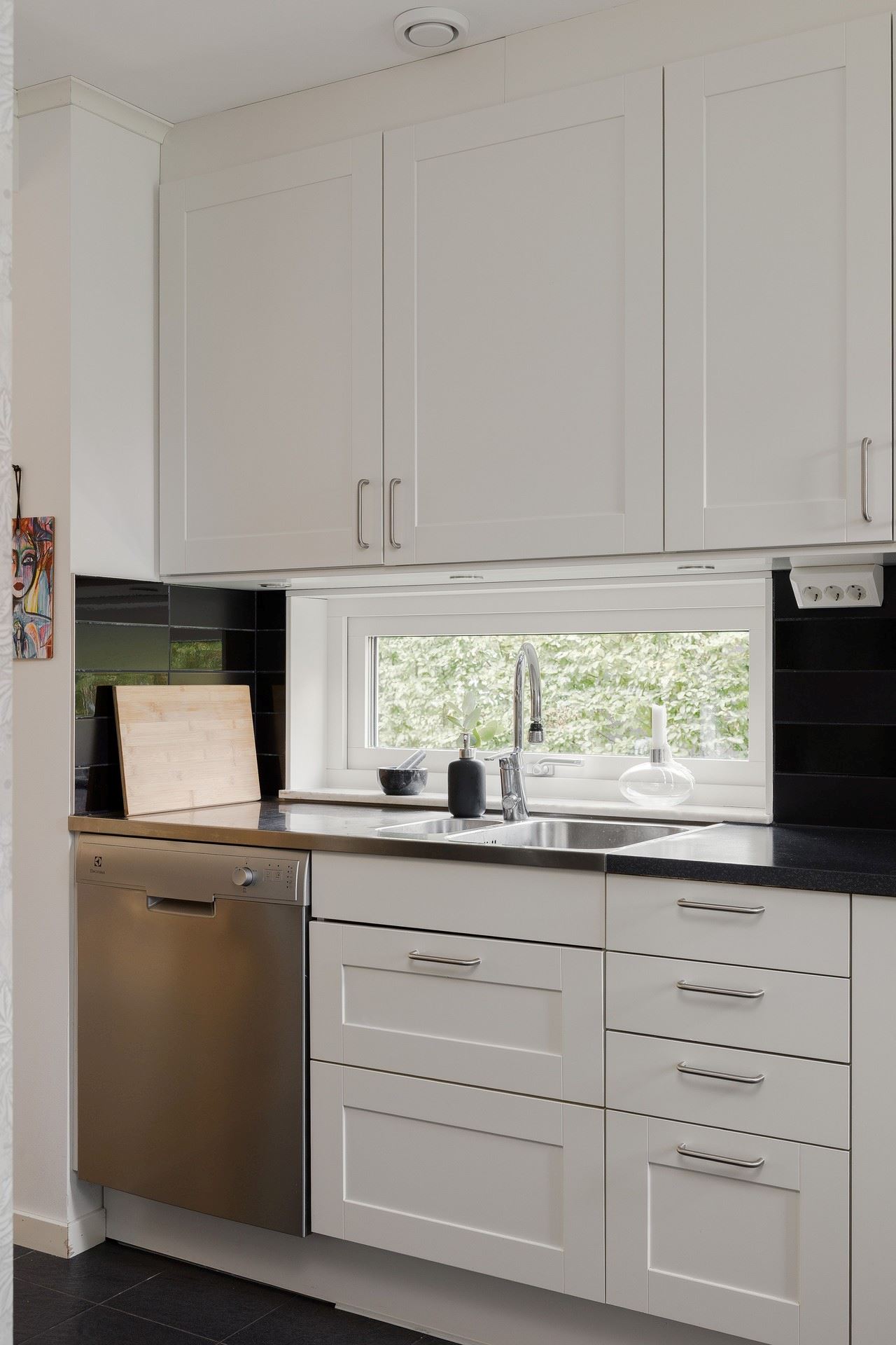 Köket är modernt i vitt utförande med en arbetsbänk i svart laminat och ett matchande stänkskydd i svart kakel. Den maskinella utrustningen består av kyl och frys i fullhöjd, mikro och ugn i arbetshöjd, diskmaskin och spishäll - allt i rostfritt utförande. Varma dagar flyttar man enkelt ut måltiden till den generösa uteplatsen där man med lätthet får plats med både härligt soffhäng samt matbord.