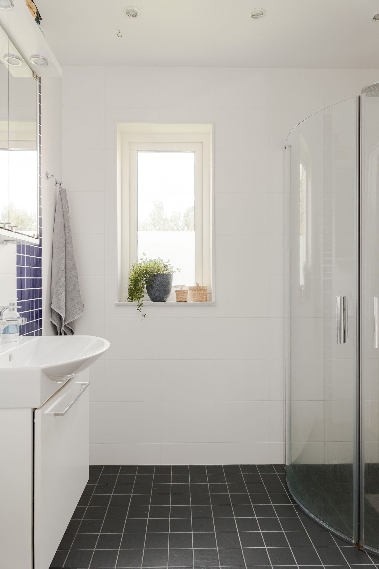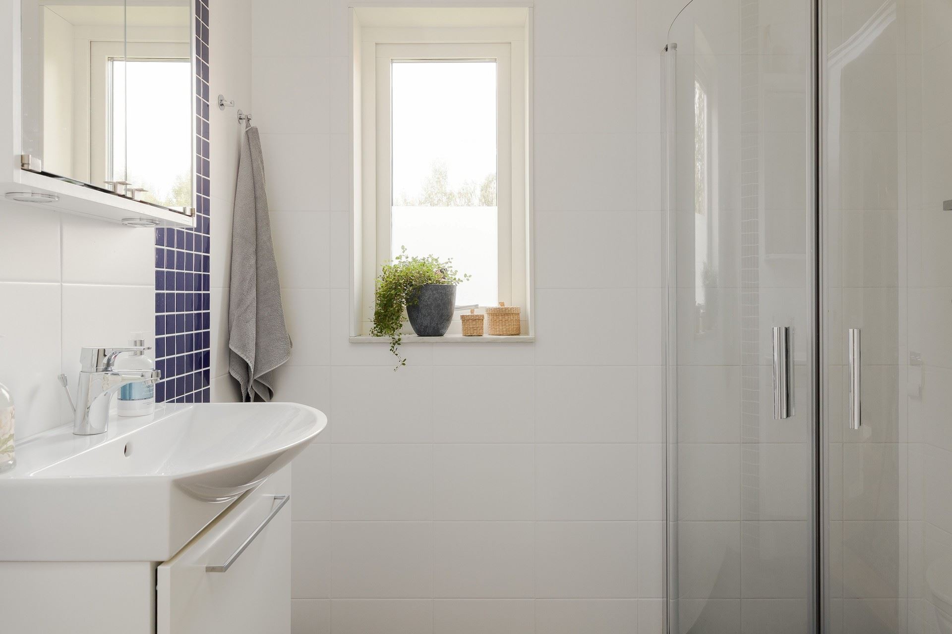 Helkaklat badrum. Utrustningen består av spegelskåp med belysning, handfat med kommod, dusch med vikväggar i glas. Fönster för vädrings möjlighet och naturligt ljusinsläpp.