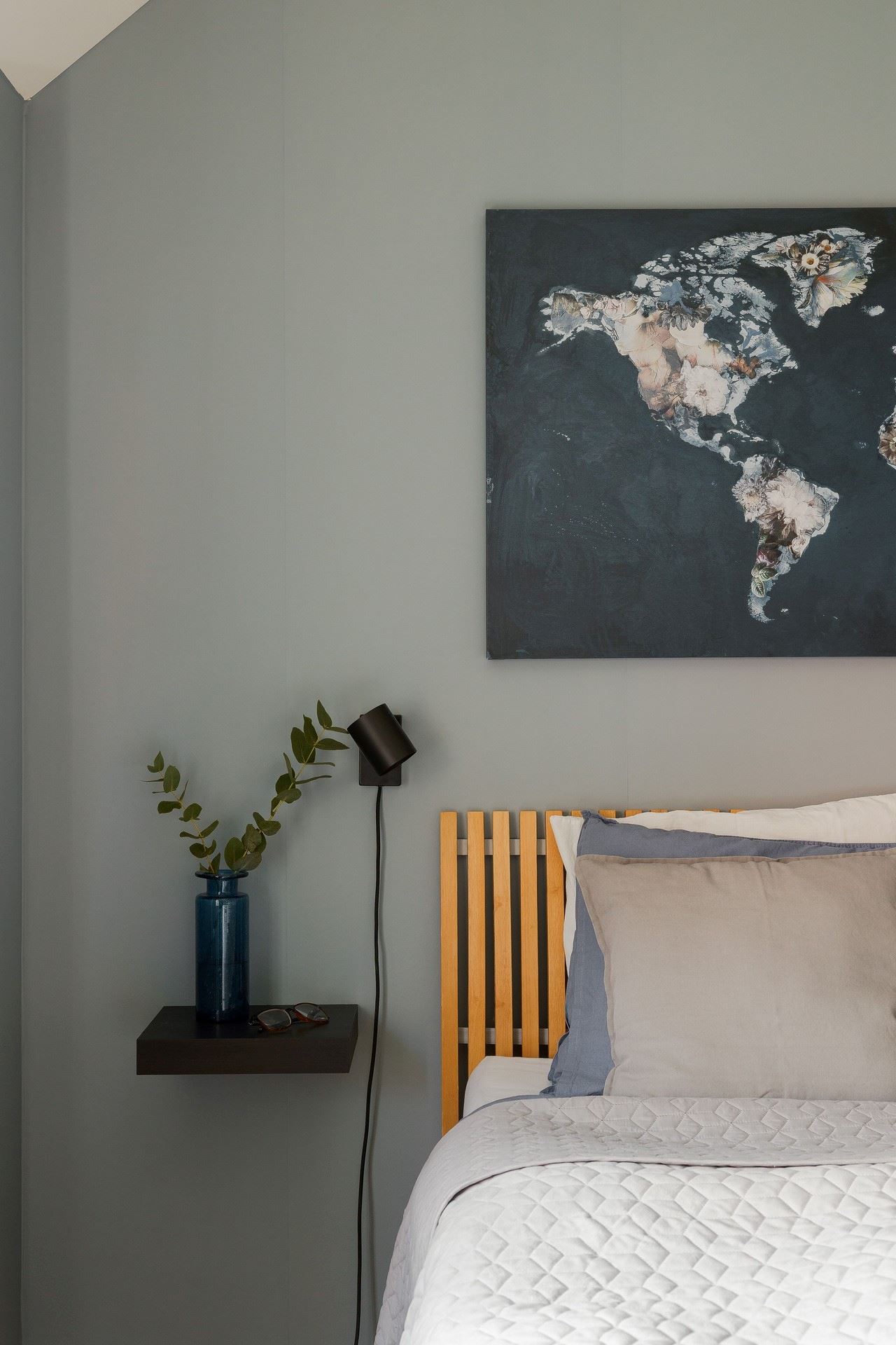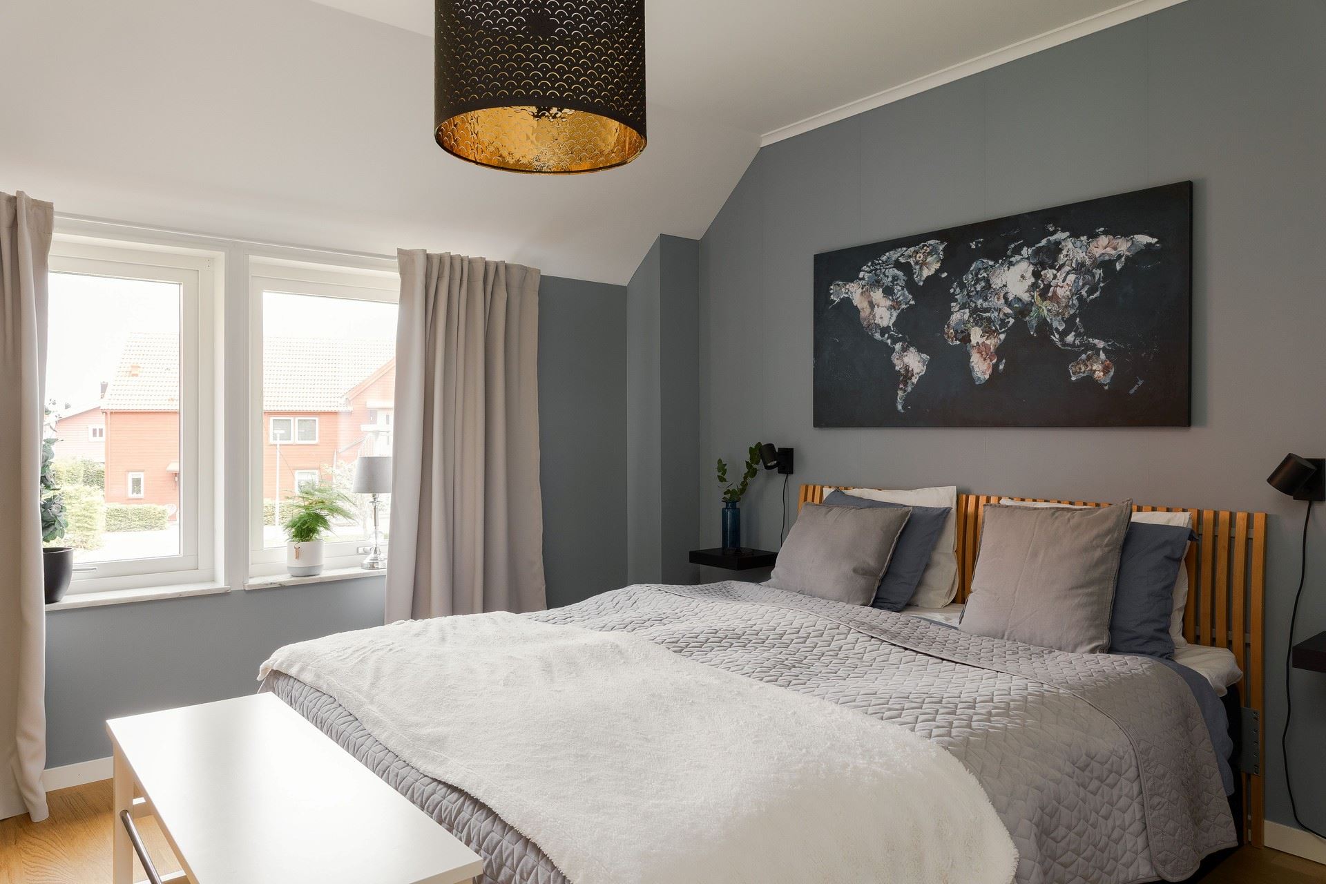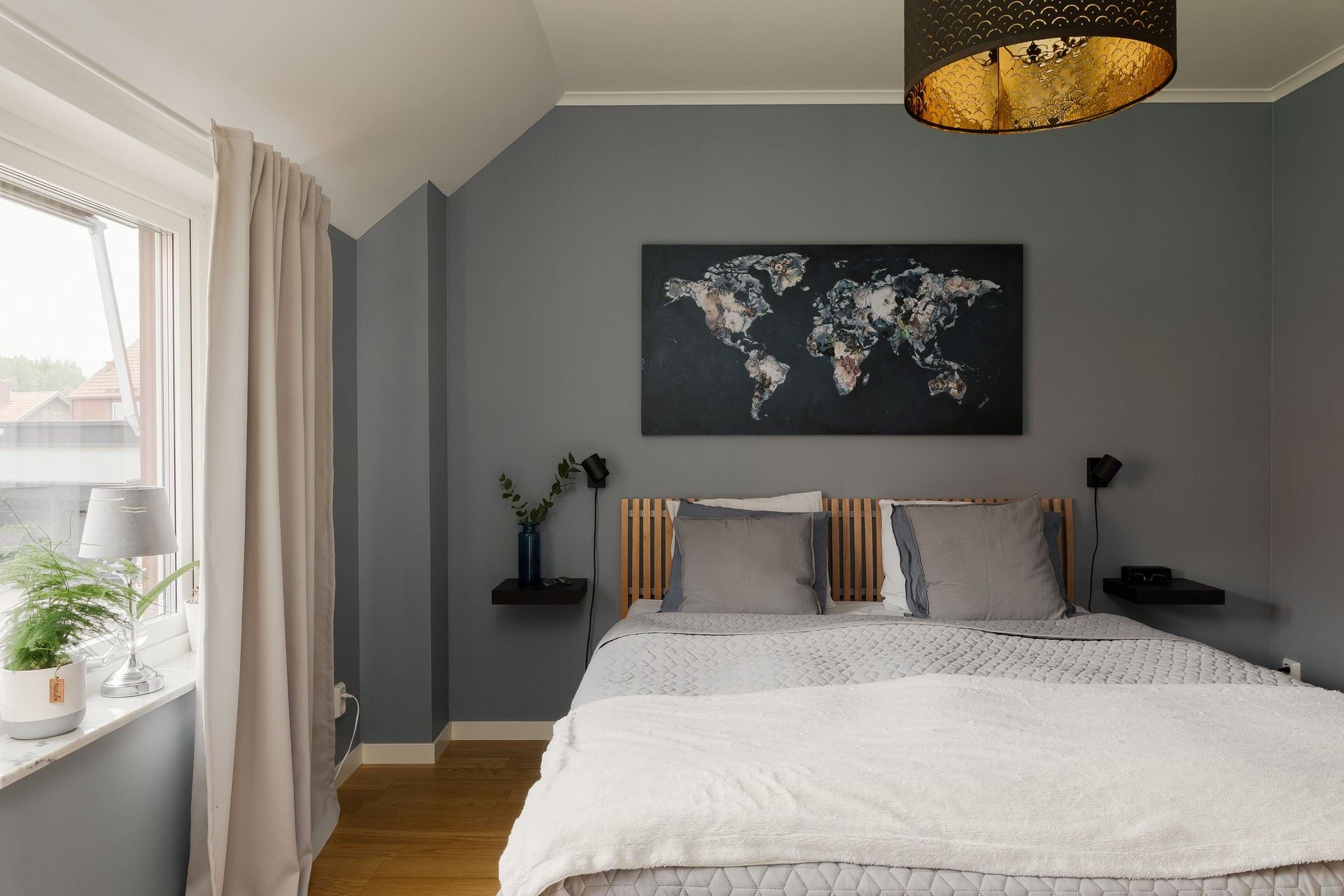 Rofyllt sovrum även här. Ljusa väggar med en målad fondvägg och ekparkett. Här medges plats för säng eller som i detta fall en större soffa för tv häng.