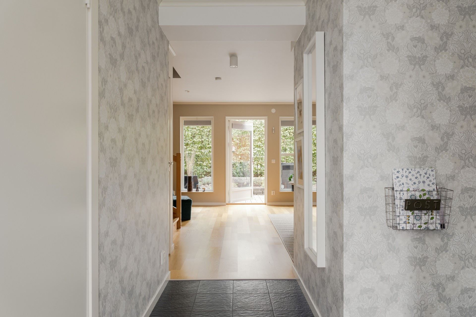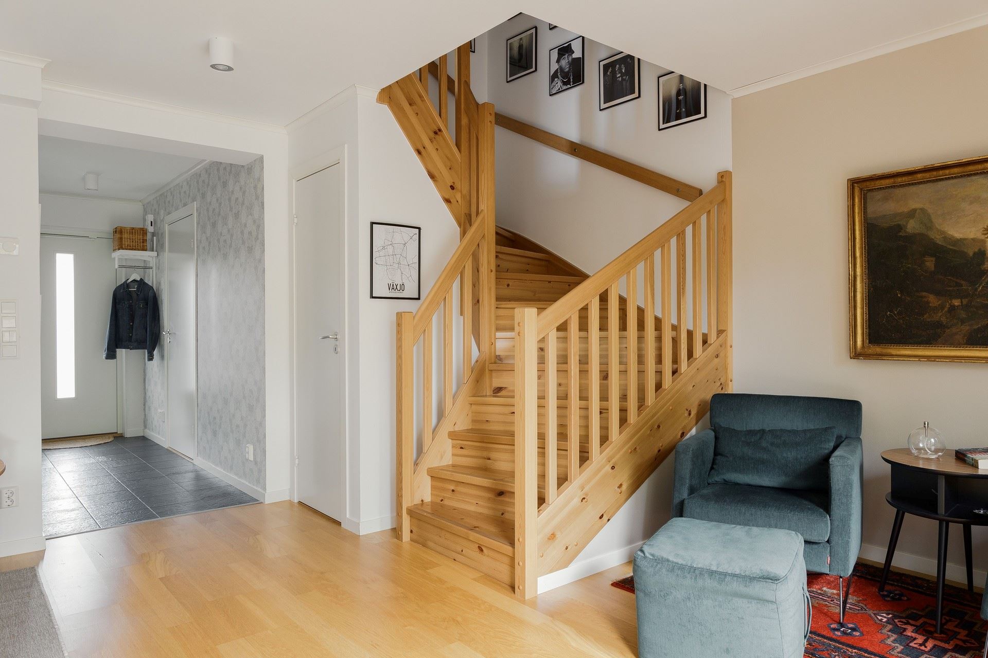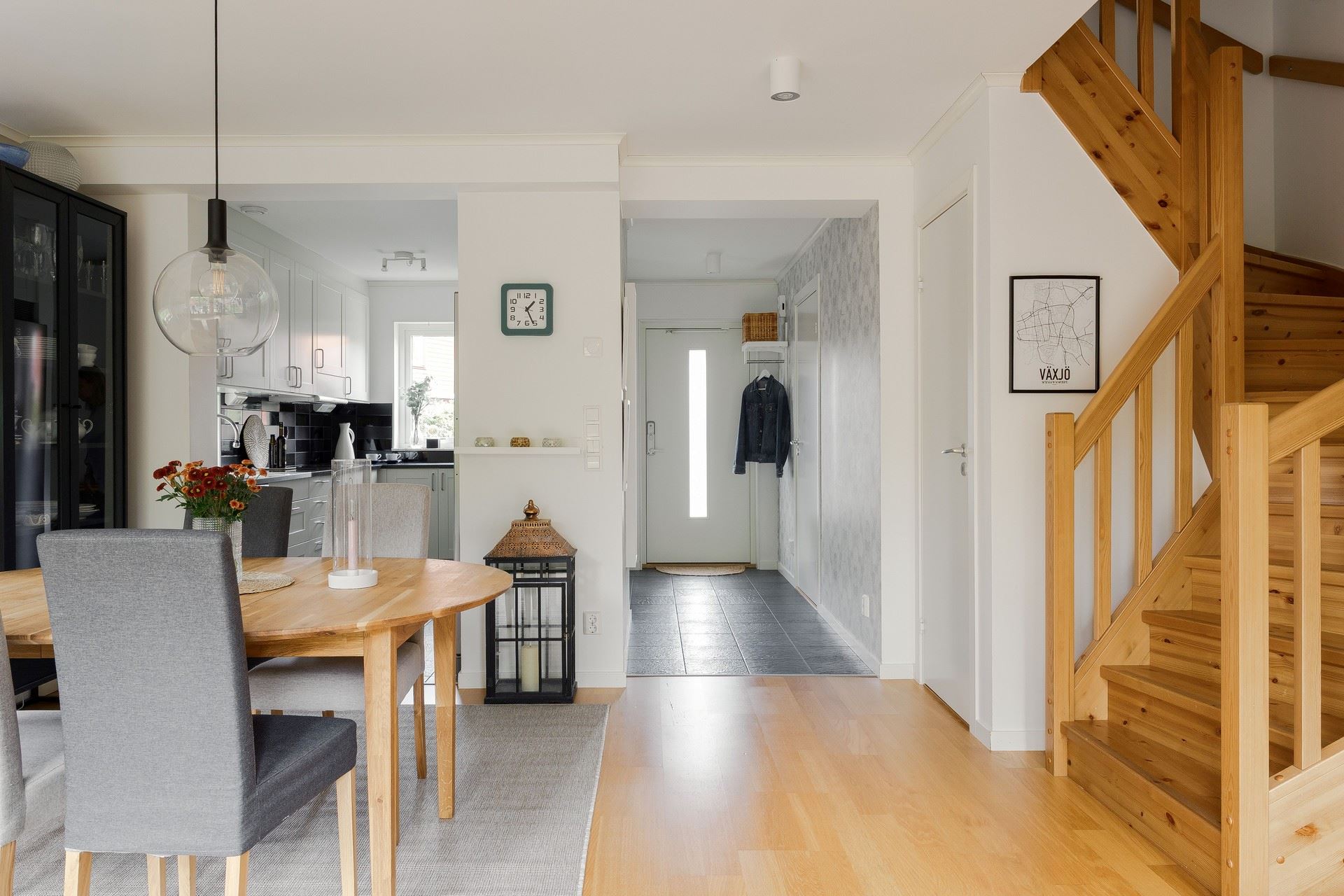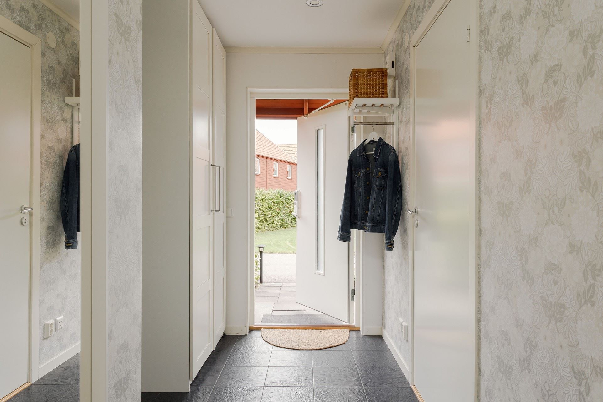 Entrén som möter oss är välkomnande och ljus. Gott om plats för avhängningsmöjlighet i en garderob. På golvet ligger praktiskt klinkergolv i grått och väggarna är tapetserade. Golvet övergår därefter till ekparkett vilket sedan följer oss runt i bostaden.